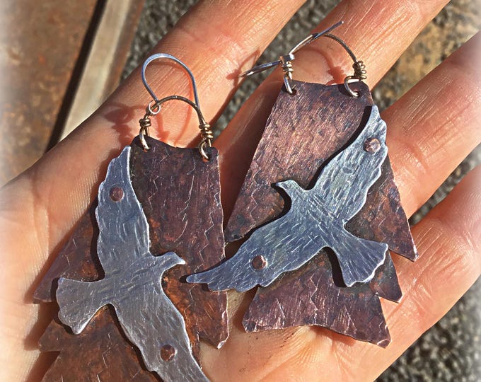 Buffalo love earrings with stamped copper and rhinestone ear wires,western with a kick! Riveted and rustic,totally handcrafted by artisan