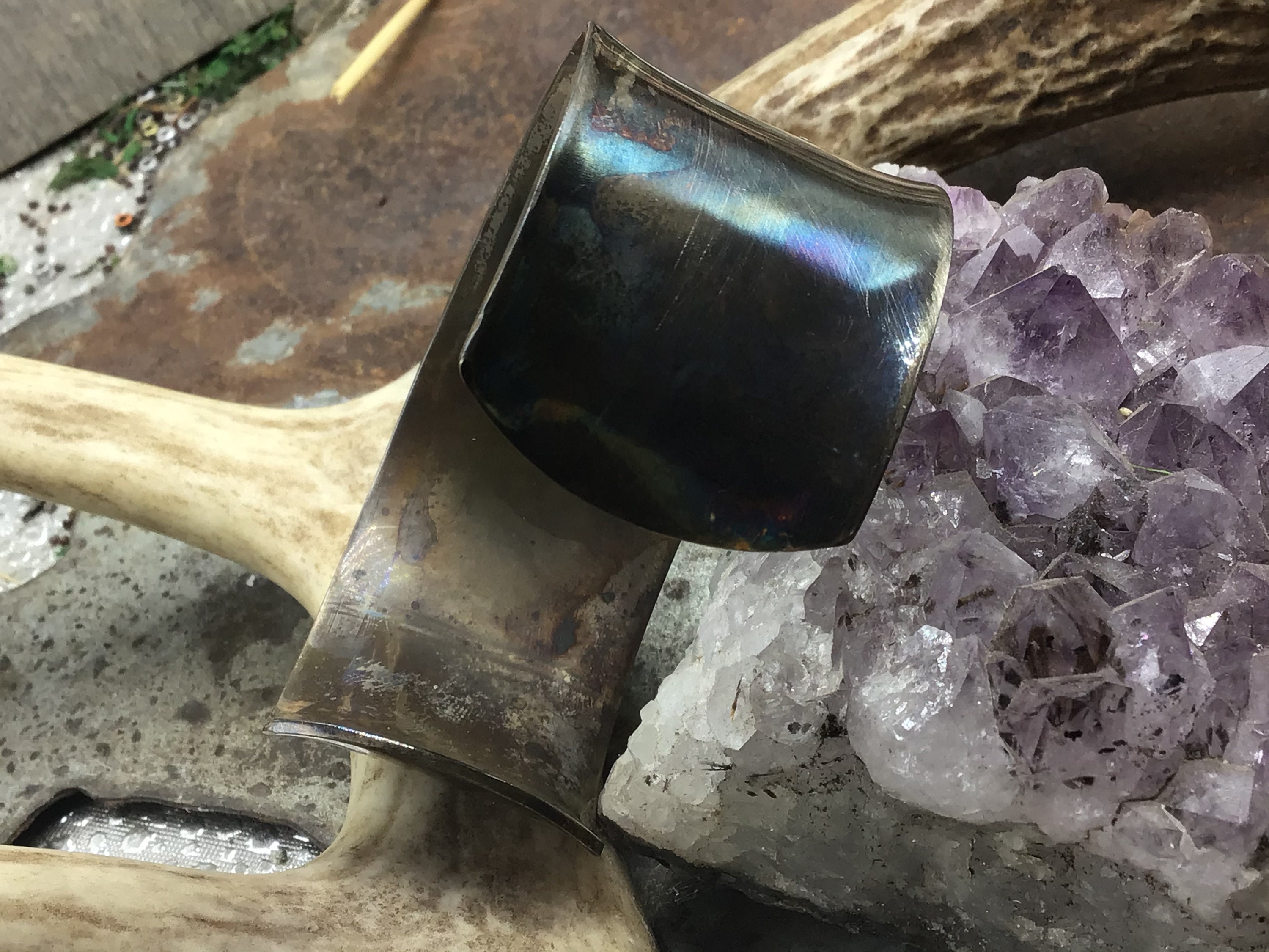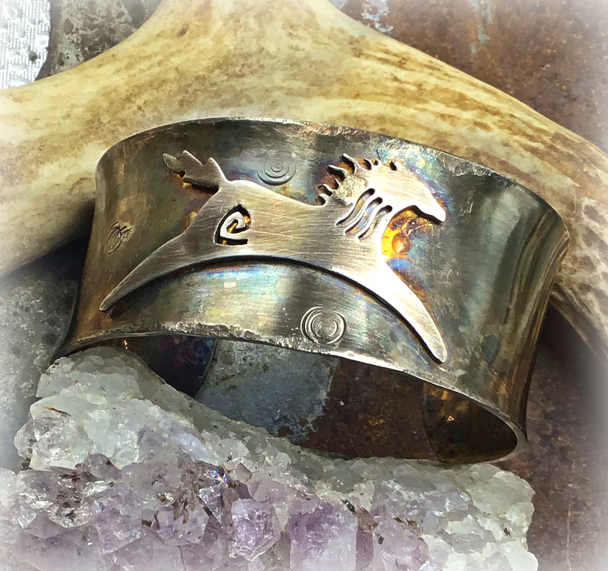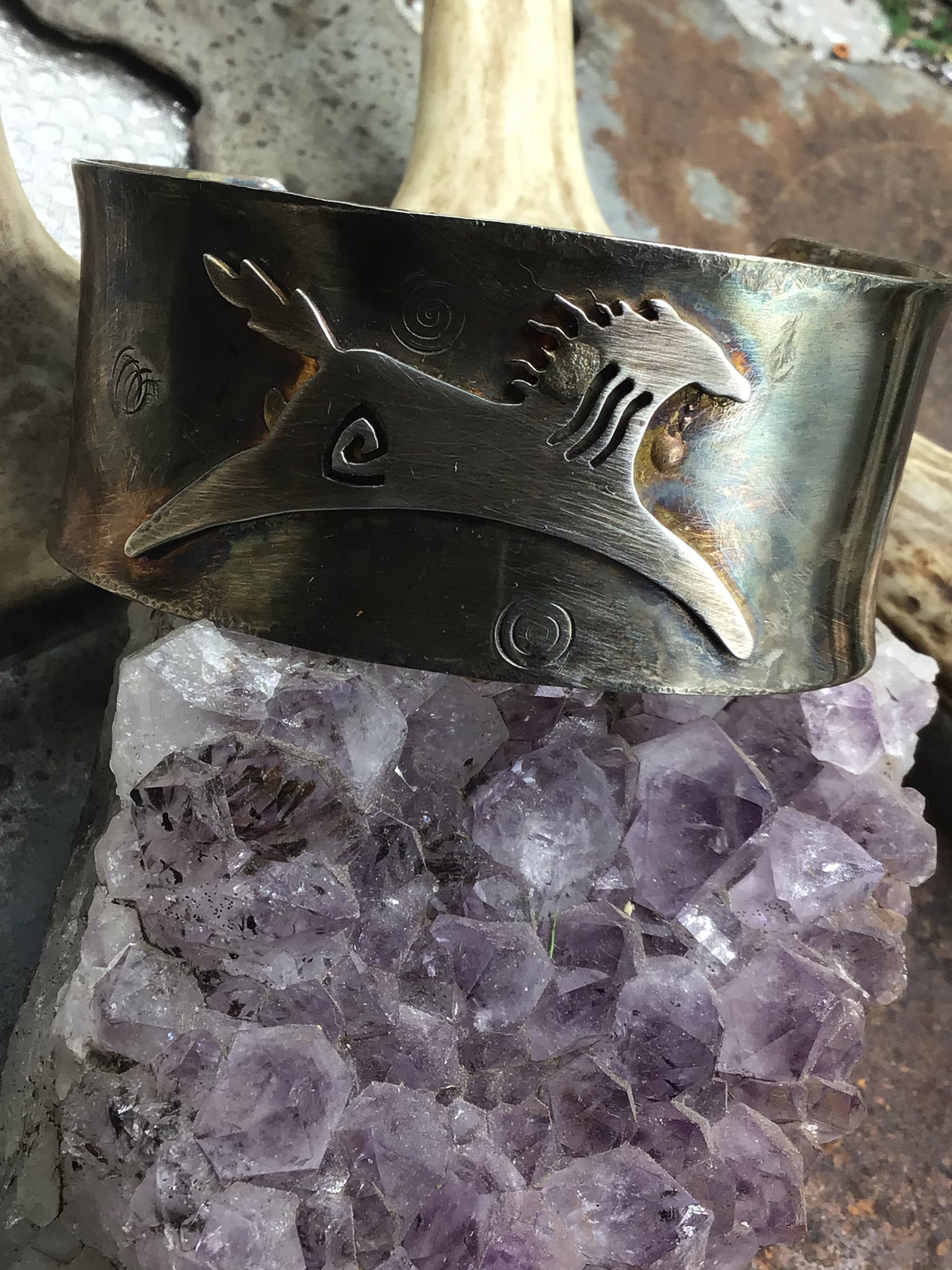 Rustic primitive pony wide sterling cuff bracelet by Weathered Soul, this cuff iis a very comfortable fit but has a strong rustic look. Fits medium wrist. A few tiny copper rivets are added to hold the tiny edges down tight.