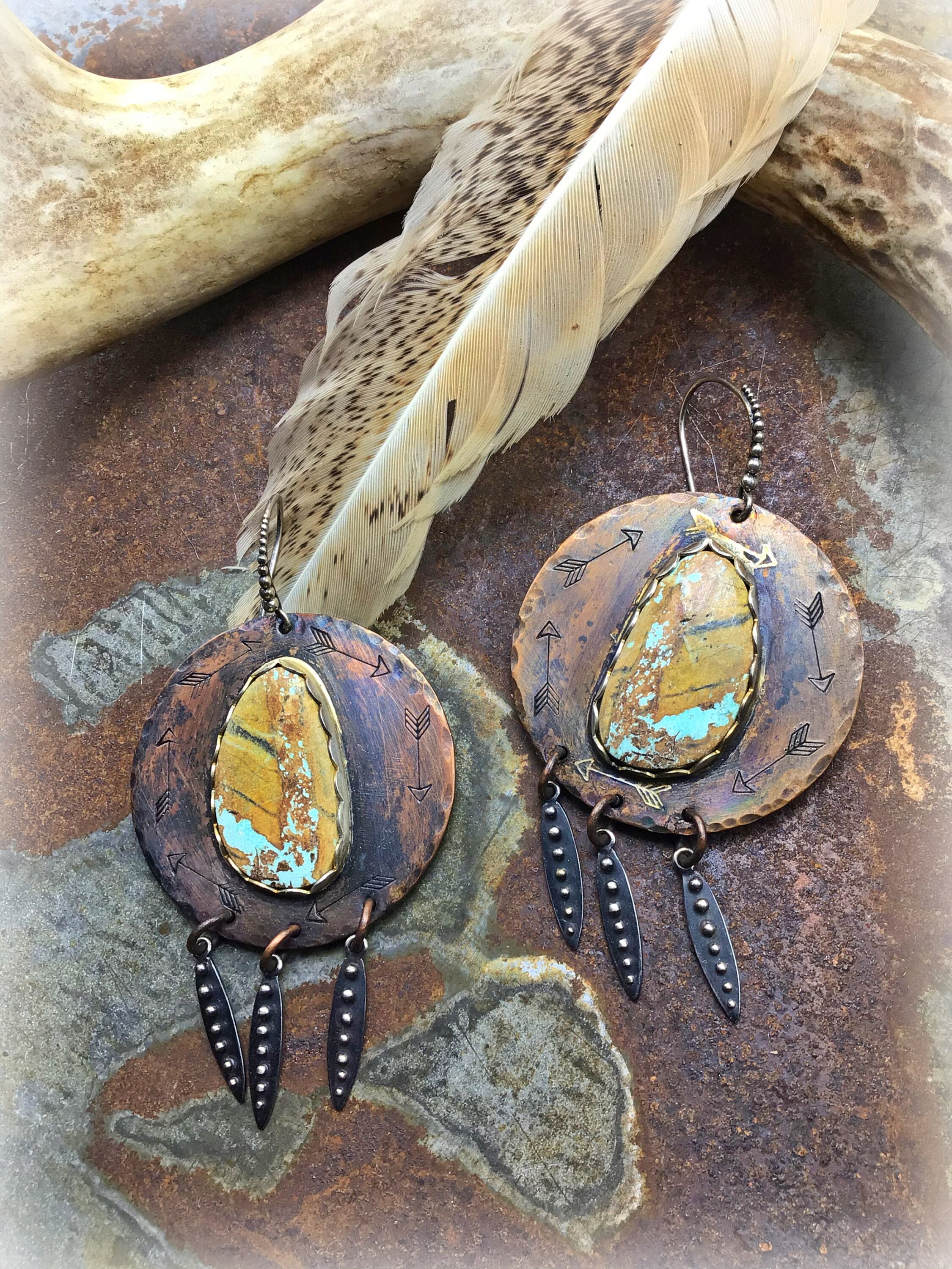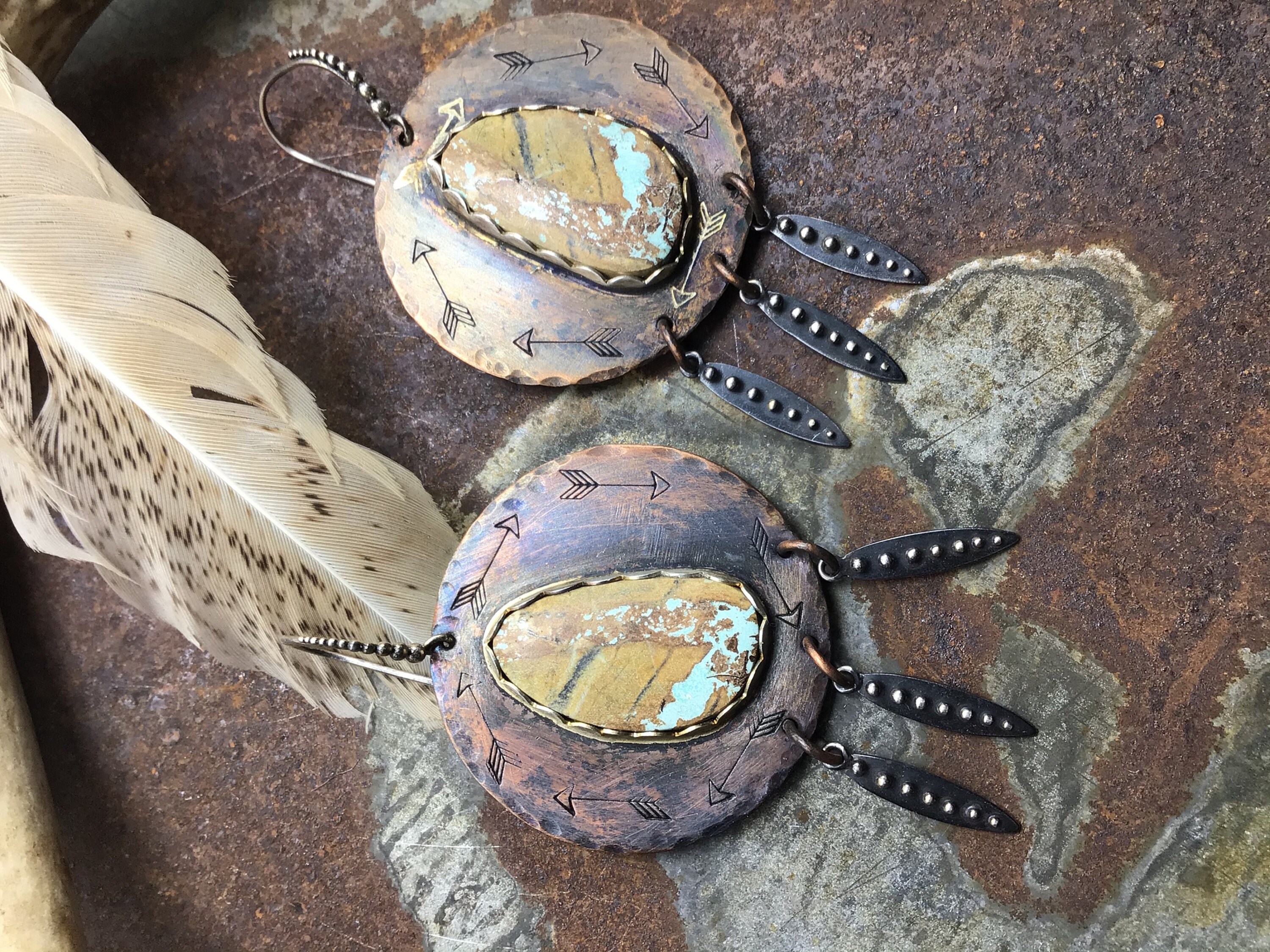 Royston ribbon turquoise drop statement earrings by Weathered Soul western vibe with arrows embossed on the perimeter copper and sterling . Discs are 1.5” diameter with ball sterling ear wires.