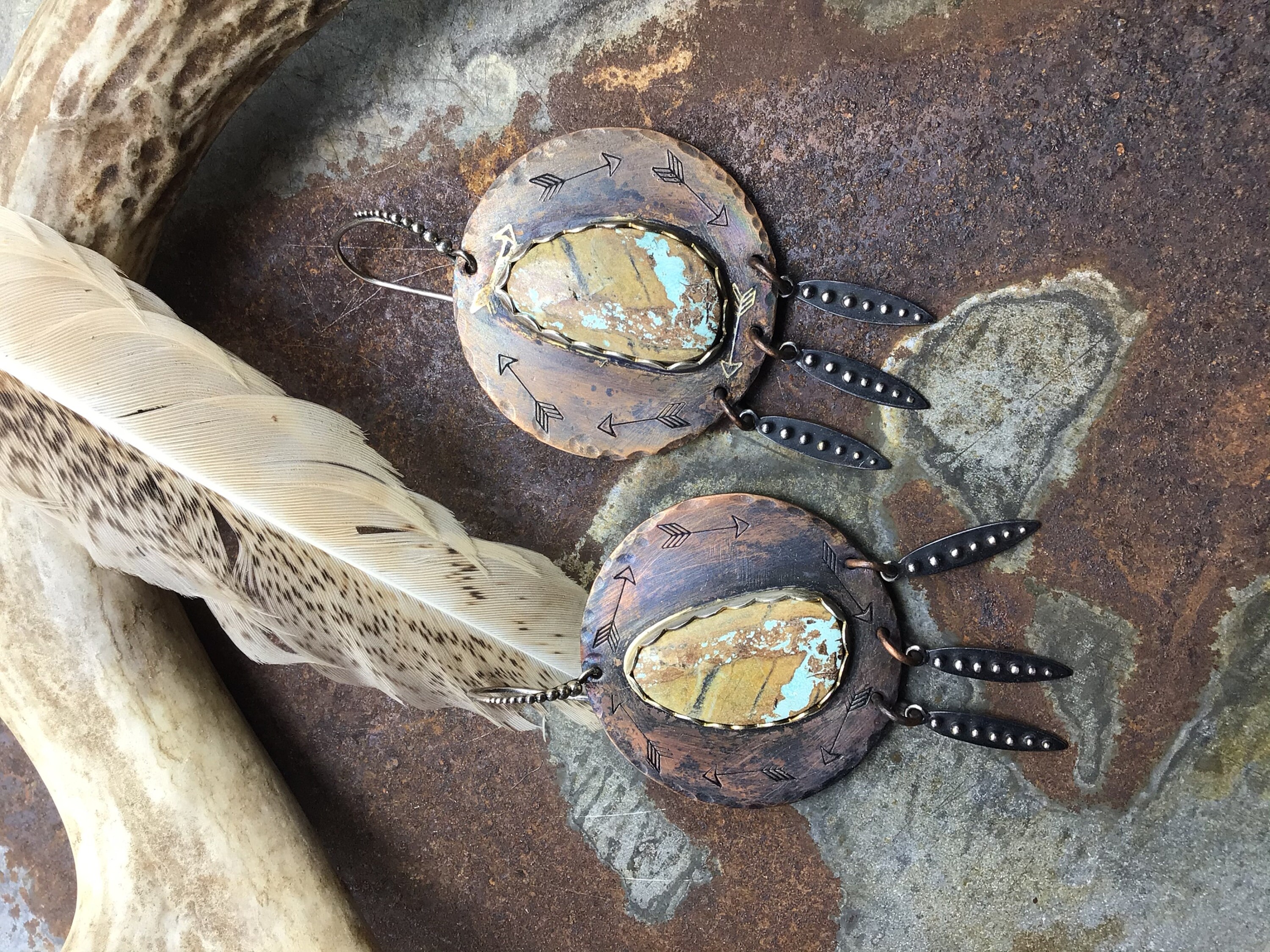 Royston ribbon turquoise drop statement earrings by Weathered Soul western vibe with arrows embossed on the perimeter copper and sterling