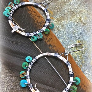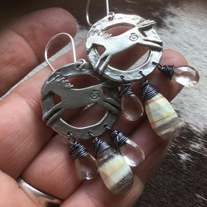 Rustic hammered sterling hoops with leather and quartz Crystal dangles, sterling artisan ear wires. Hoops measure approximately 1.25” in diameter.