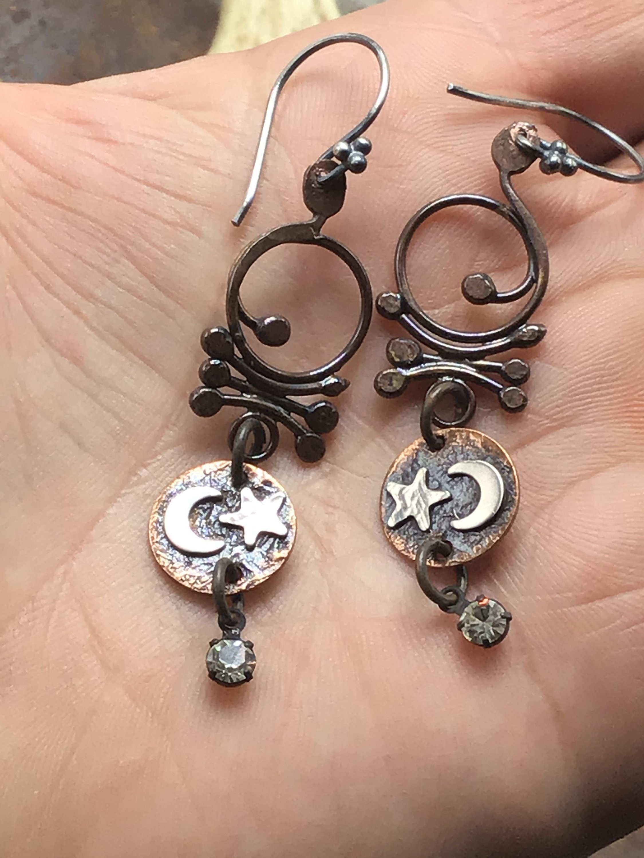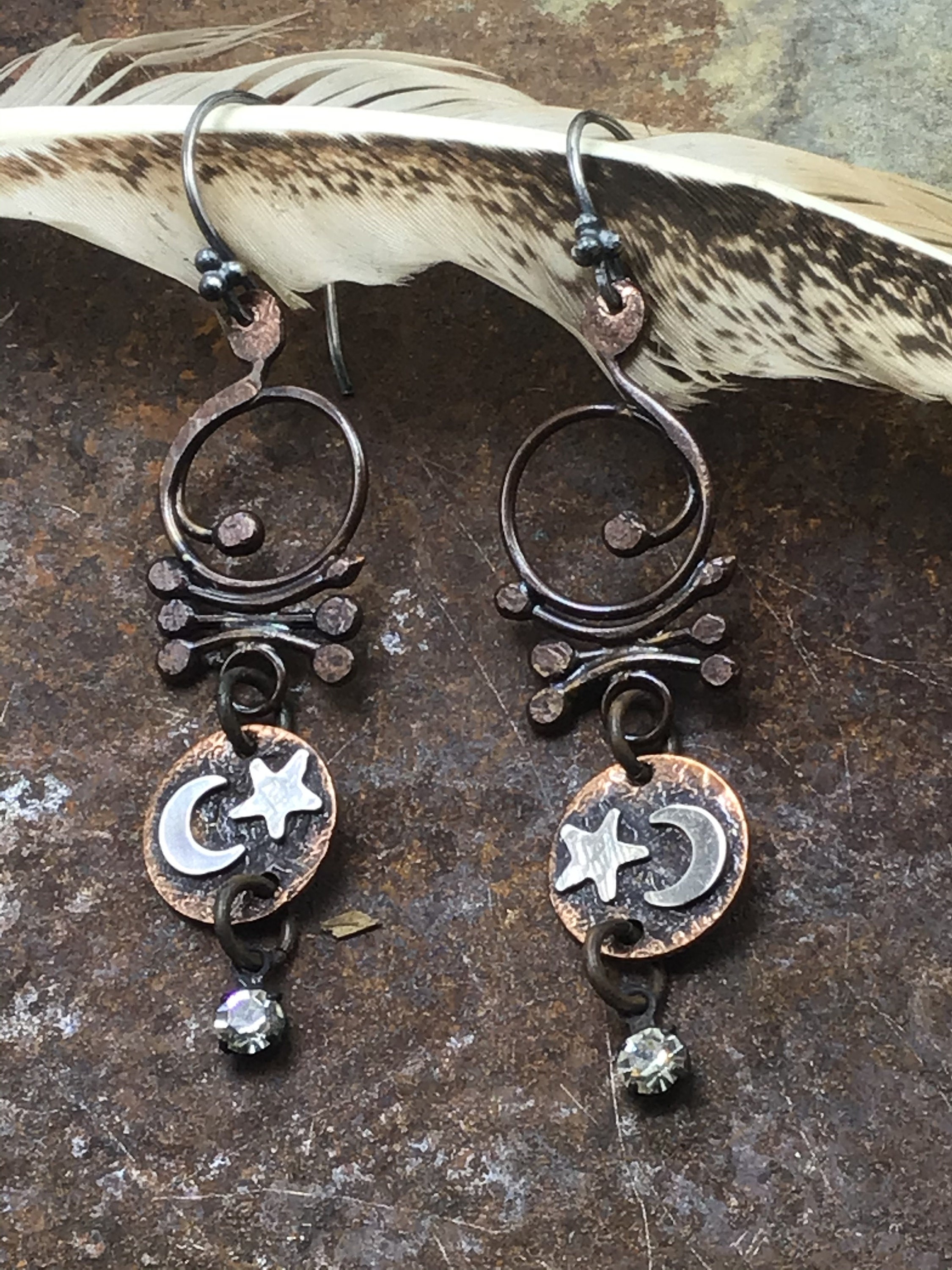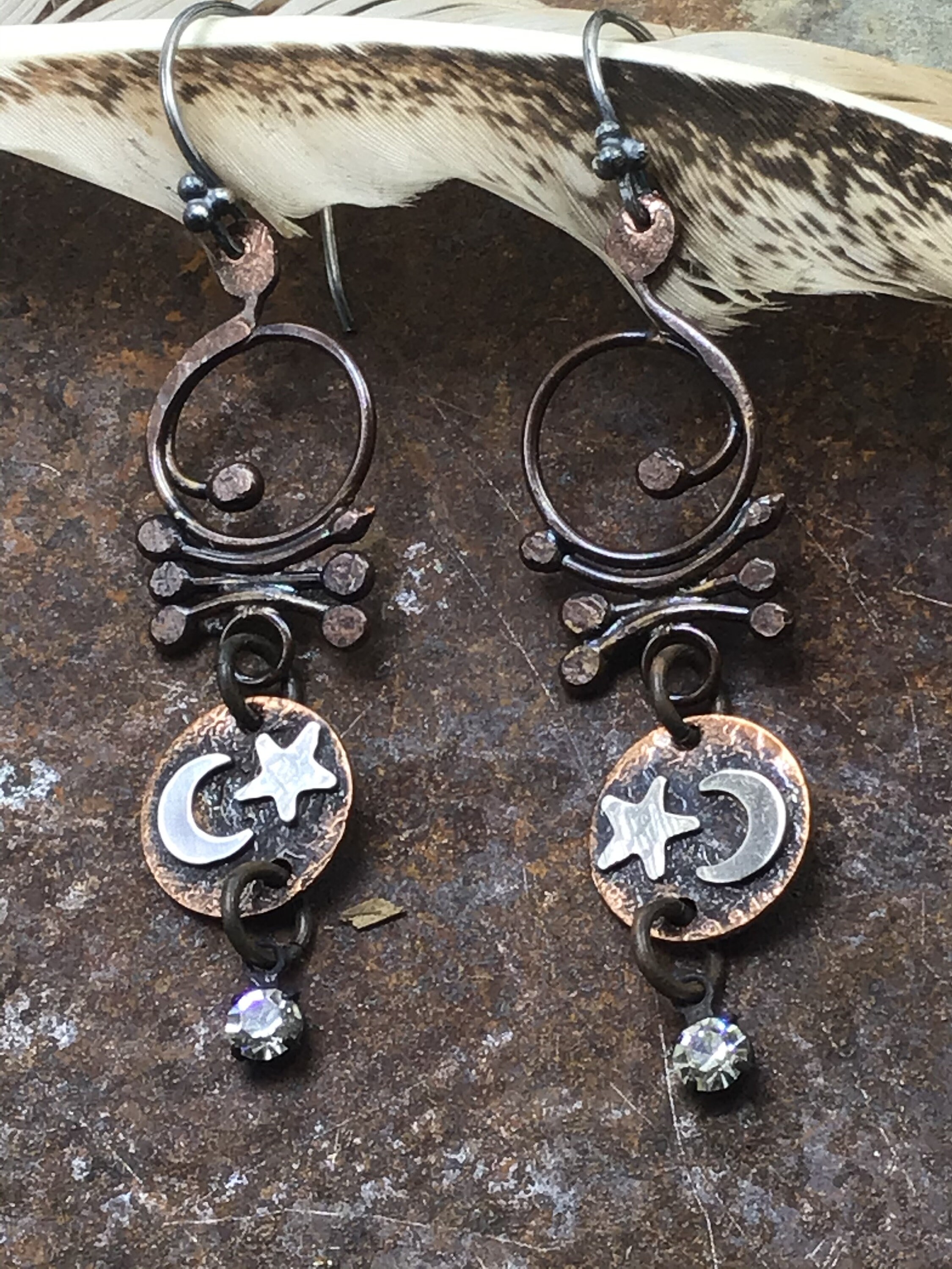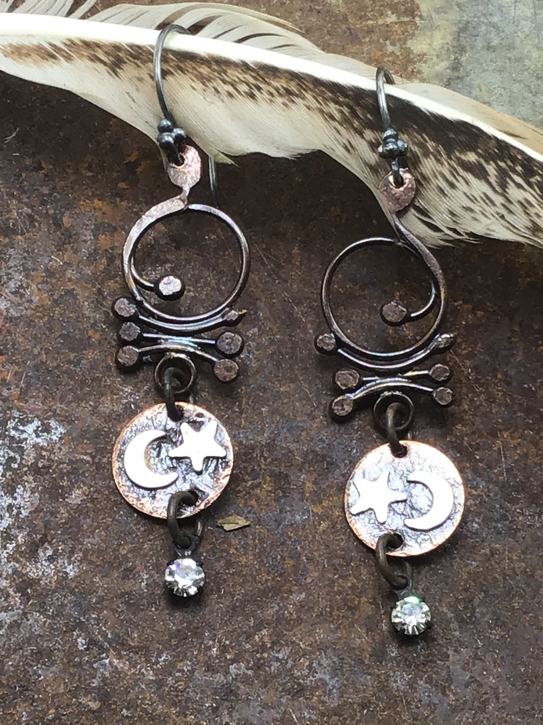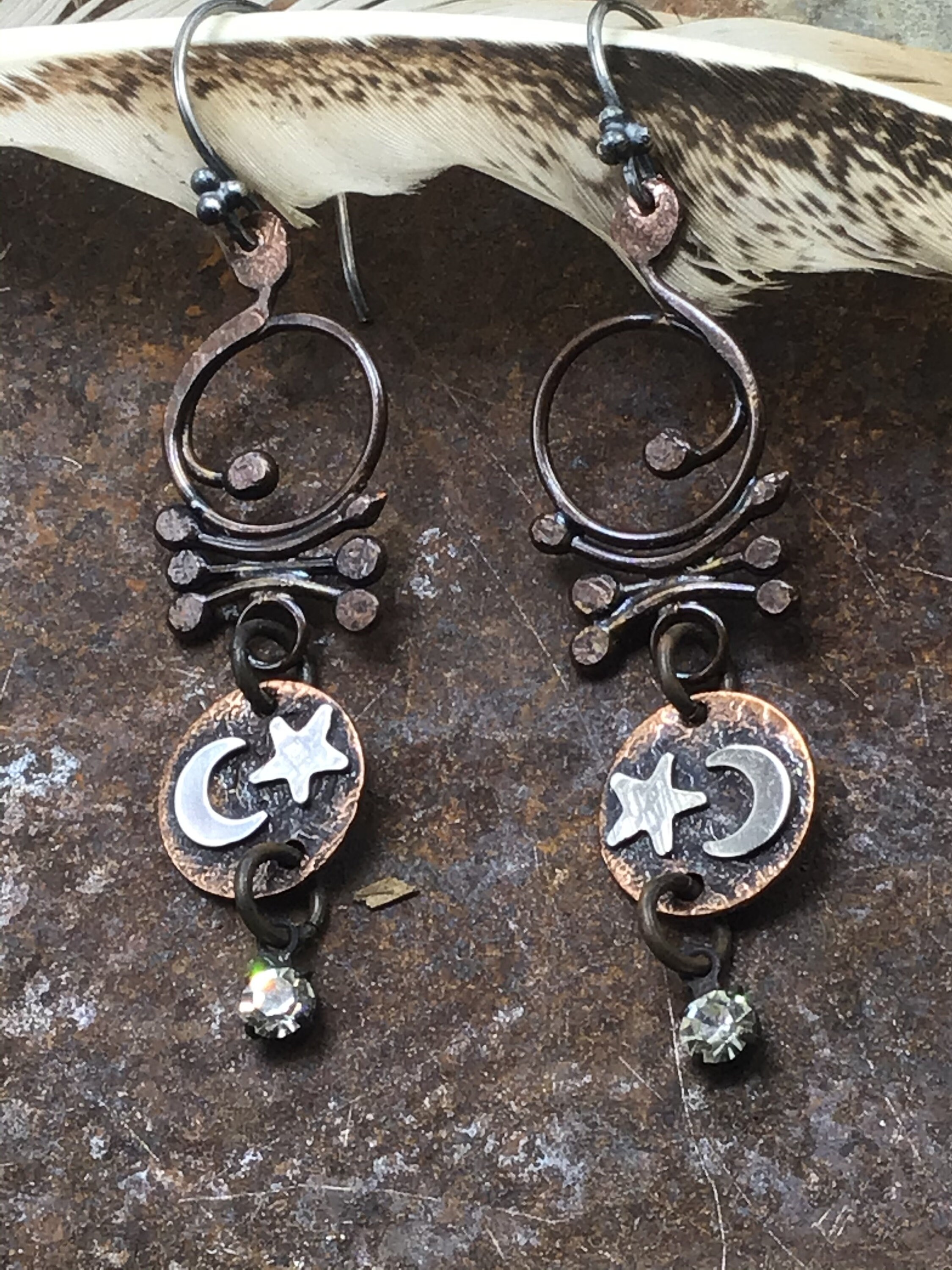 Super fun whimsical moon and star earrings by weathered soul with a touch of rhinestone bling oxidized copper and sterling. Sterling ball ear wires
