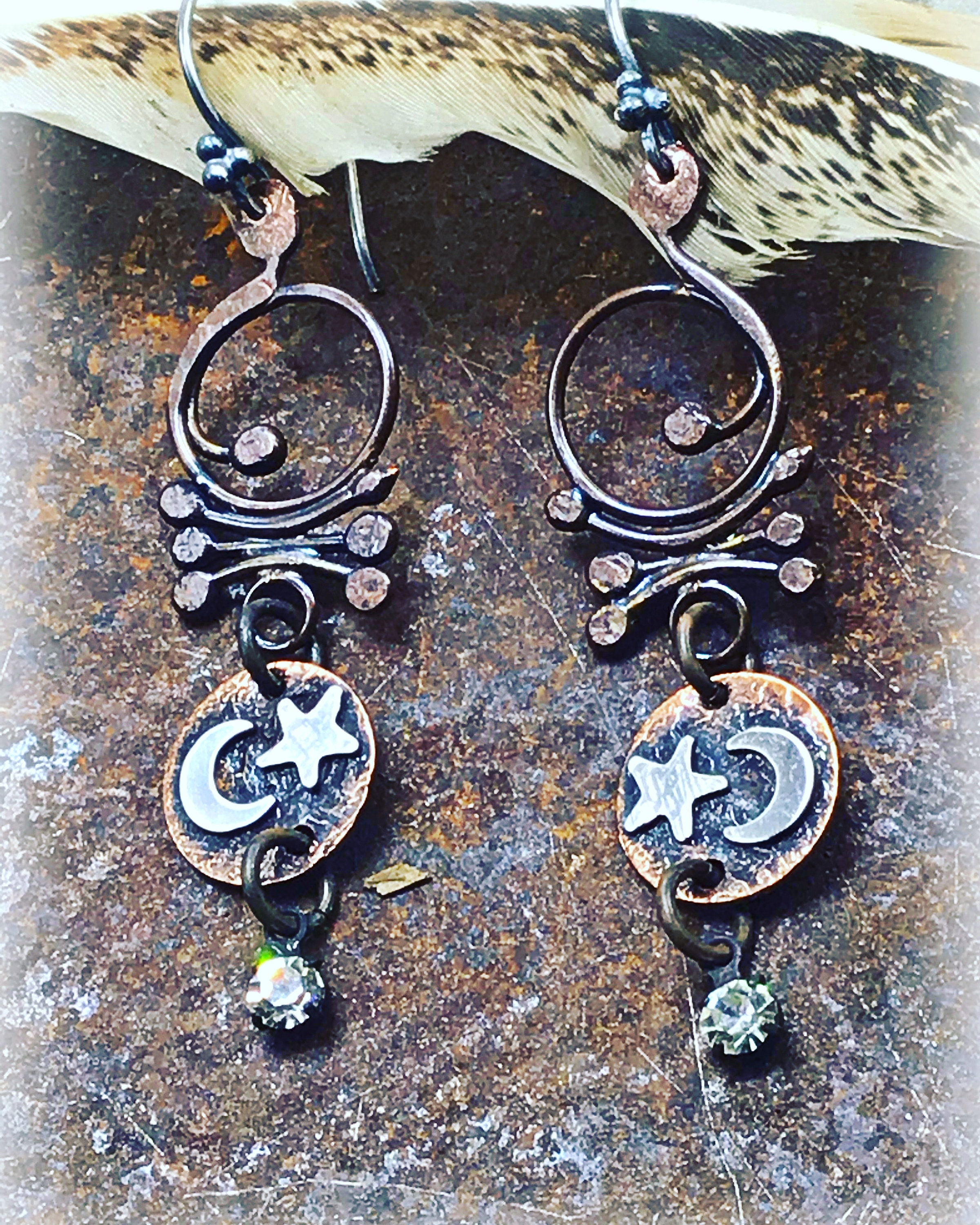 Super fun whimsical moon and star earrings by weathered soul with a touch of rhinestone bling oxidized copper and sterling
