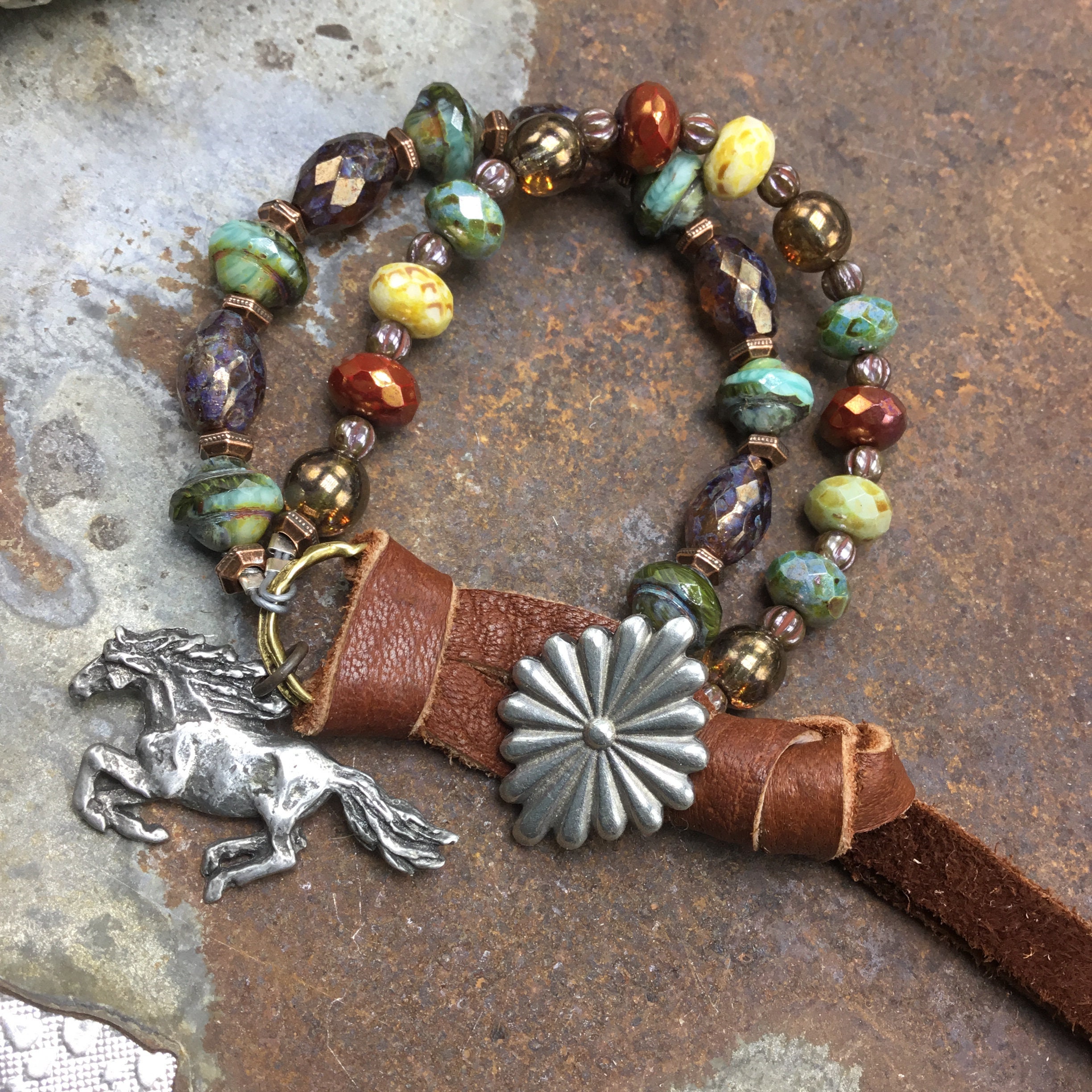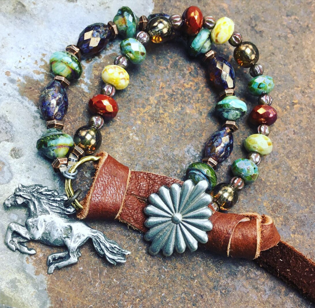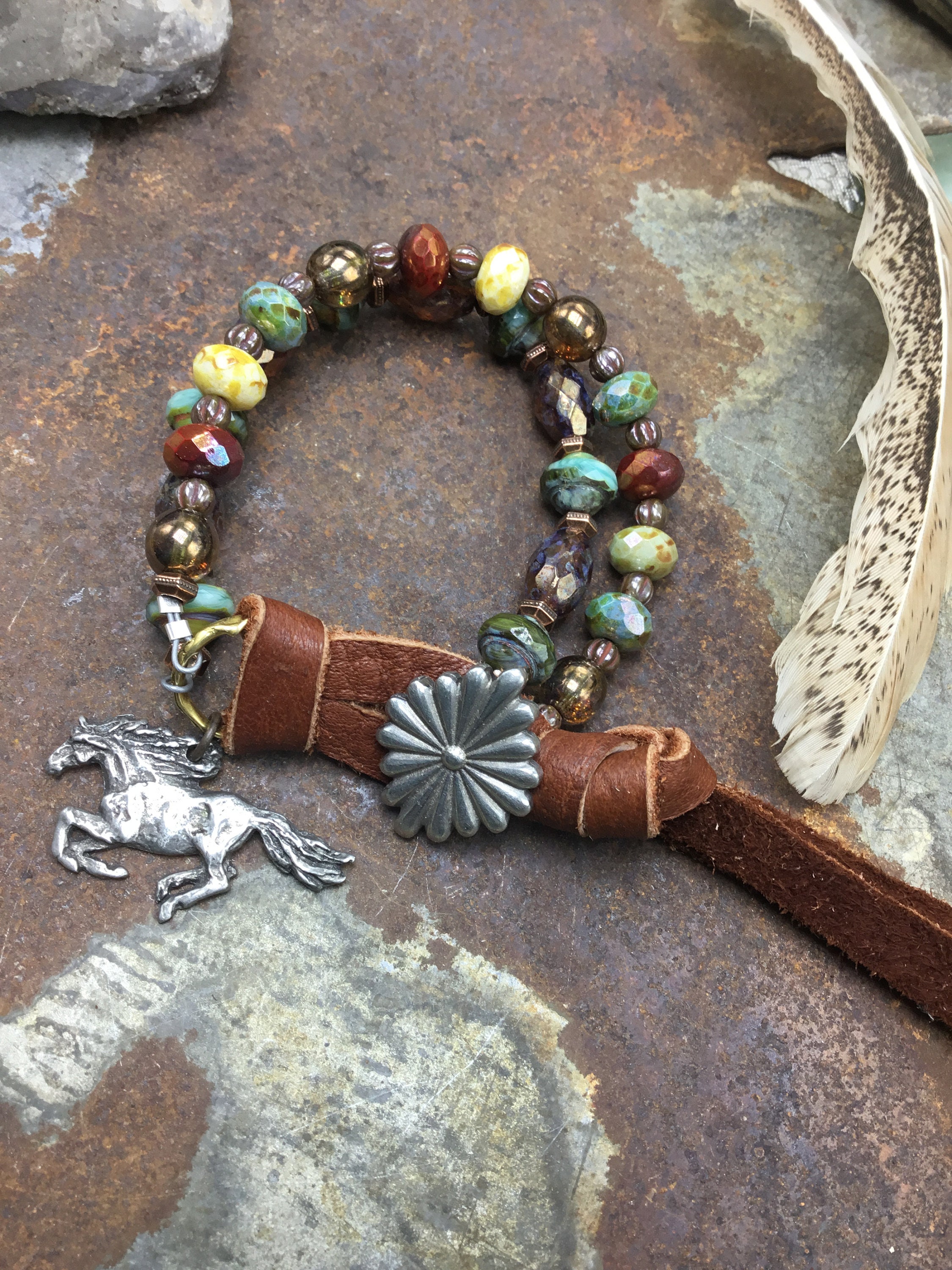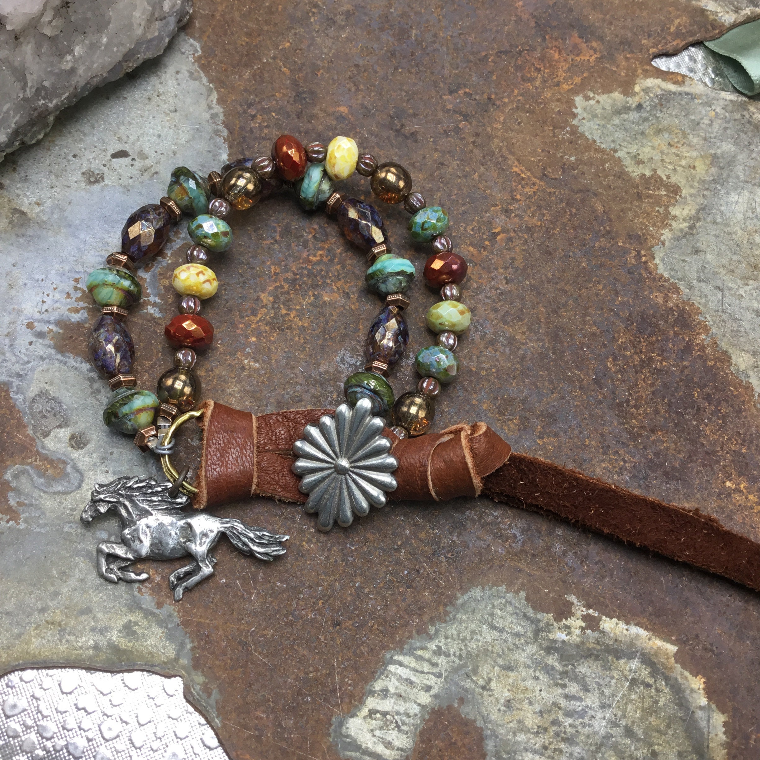 Stunning fire polished double layer Swarovski crystal beads with running horse and western concho style button cclosure. Stunning color tones in this chunky bracelet with leather and western concho button closure with elk leather and jumping pony charm, cowgirl style. Leather loops over button. Fits 7” wrist.