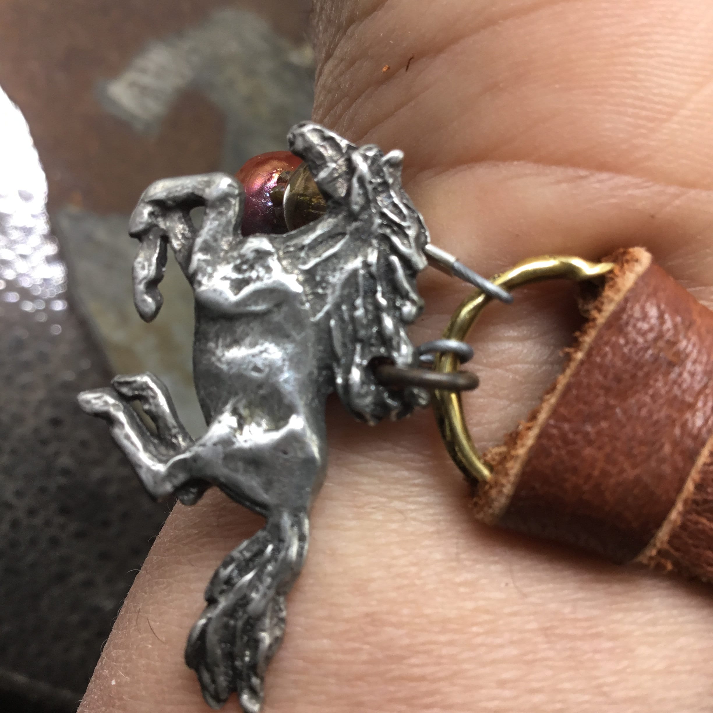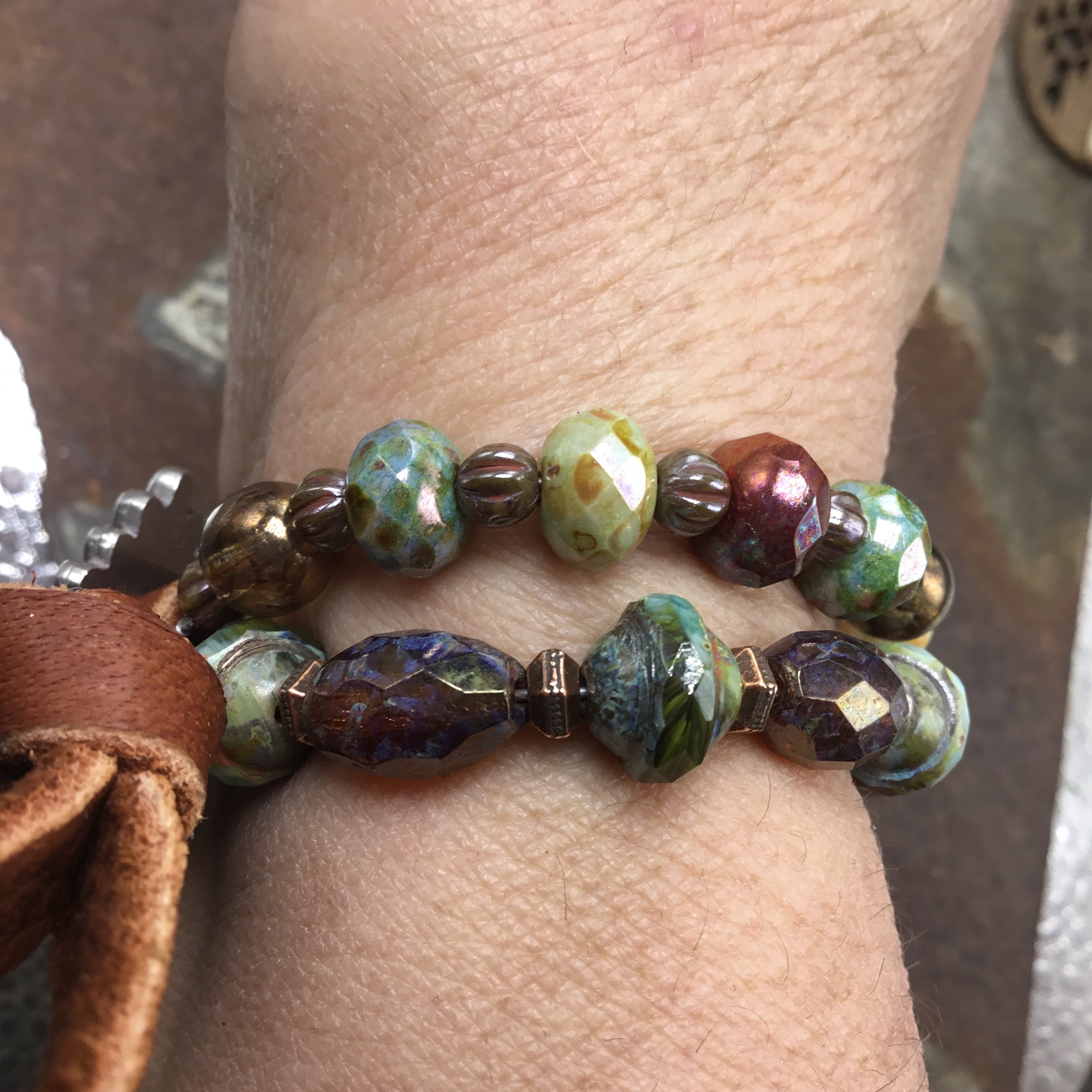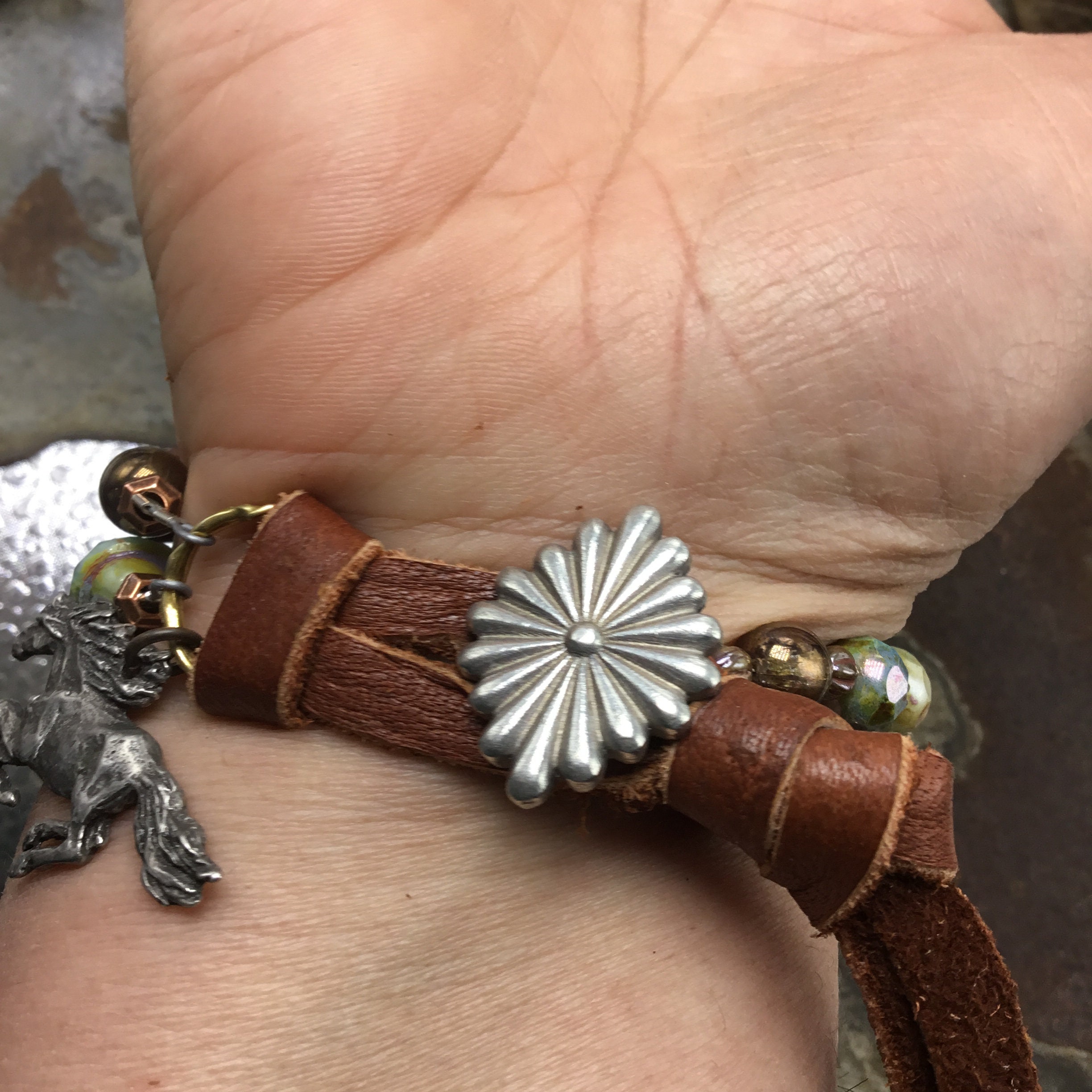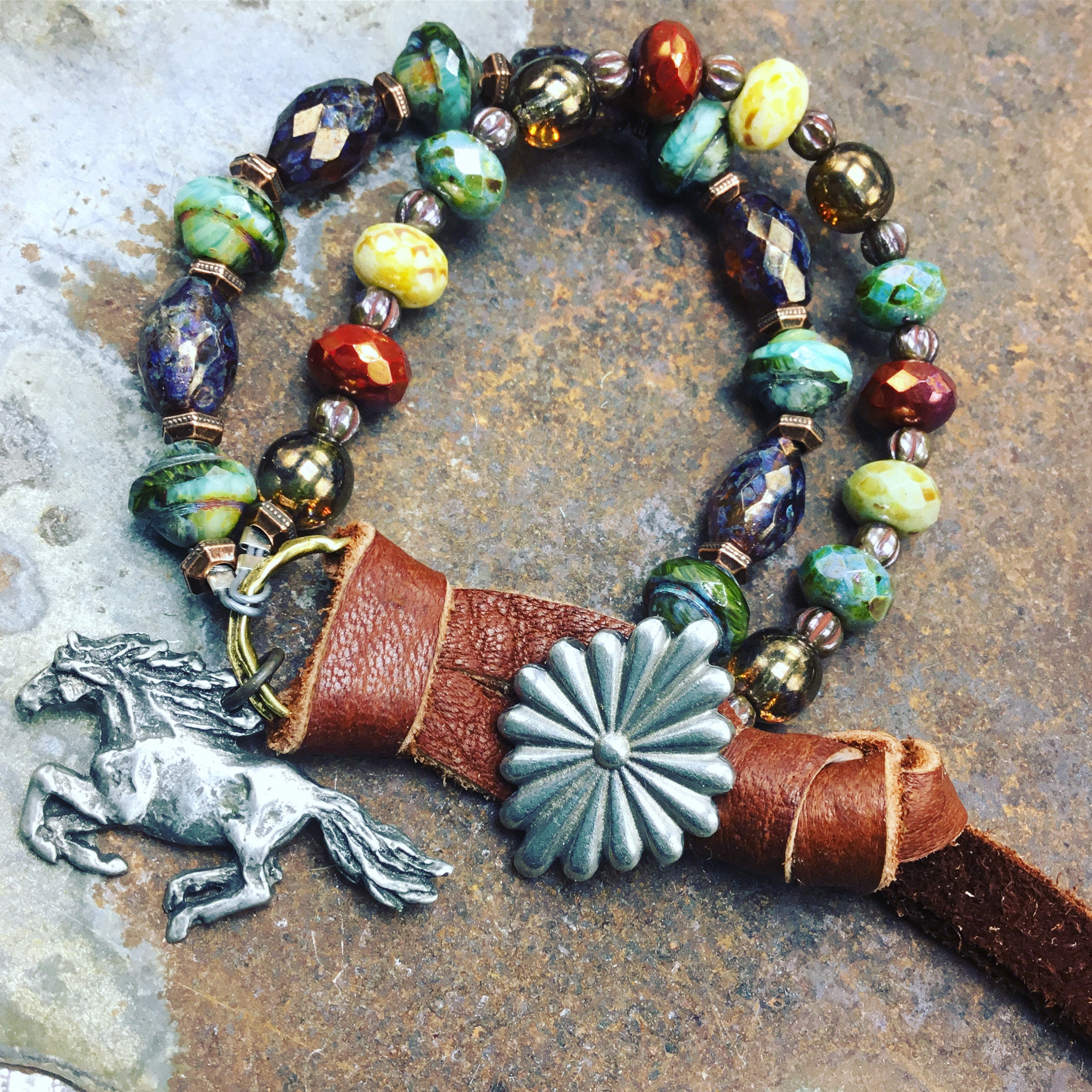 Stunning fire polished double layer Swarovski crystal beads with running horse and western concho style button cclosure. Stunning color tones in this chunky bracelet with leather and western concho button closure with elk leather and jumping pony charm, cowgirl style. Leather loops over button. Fits 7” wrist.