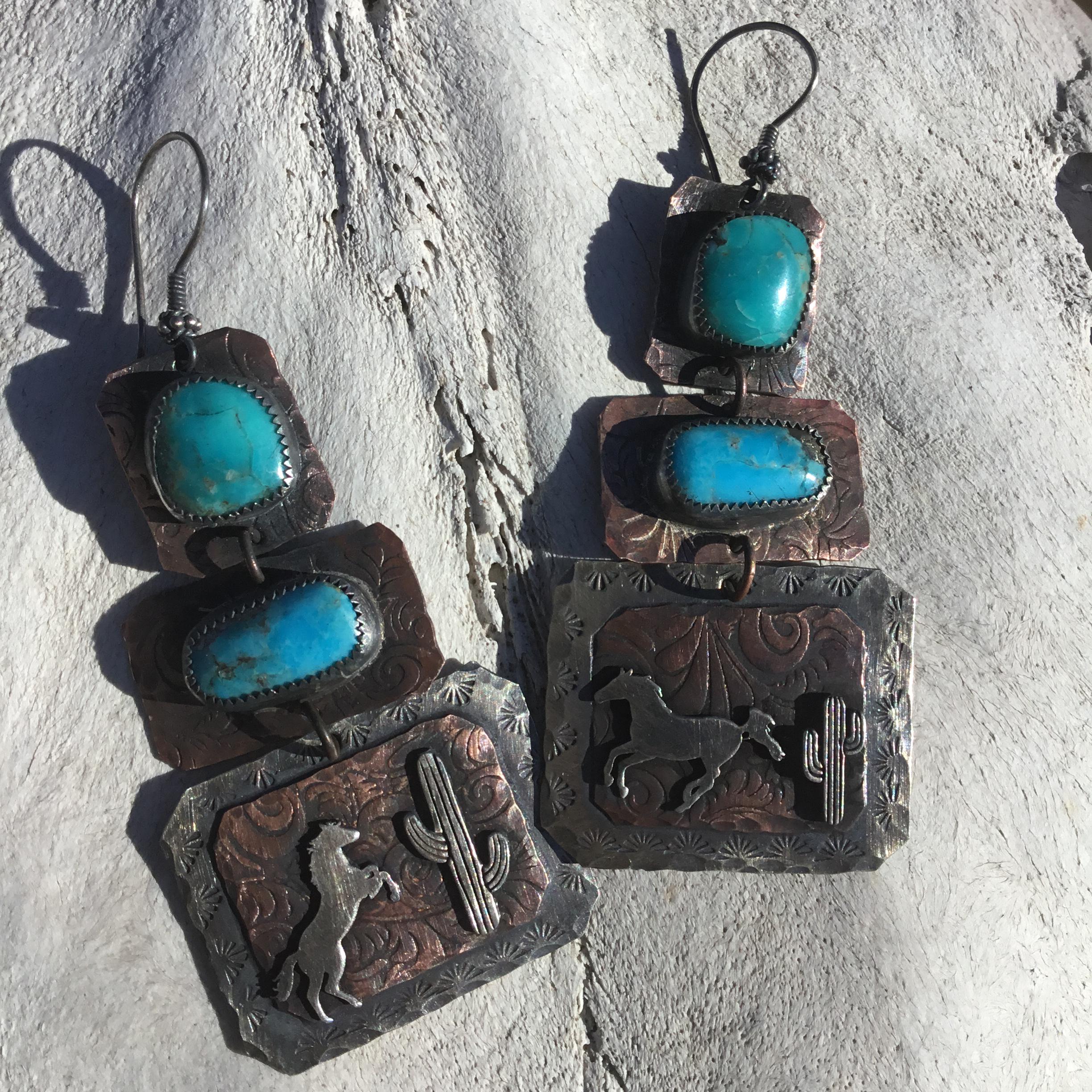 Silver screen cowboy earrings by Weathered soul with picked stones from my selection, western fashion,statement jewelry. These earrings are my most favorite of all. These are made to order so variations will apply! These are very large earrings but they are remarkably not overly heavy. Yes they have weight to them but definitely not an unbearable wear! Would probably not be comfortable for sensitive ears. I could always just add one stone instead of two for less weight. These are absolutely pieces of art! Sterling and copper blend beautifully on these! Sterling ear wires.
