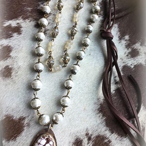 Beautiful all handmade sterling different chain sections with moonstone and soft long elk leather with slide to adjust. This leather mixed with bronze and turquoise touches are nice accents up against the dainty hammered textured hoop center that drops the large teardrop moonstone.