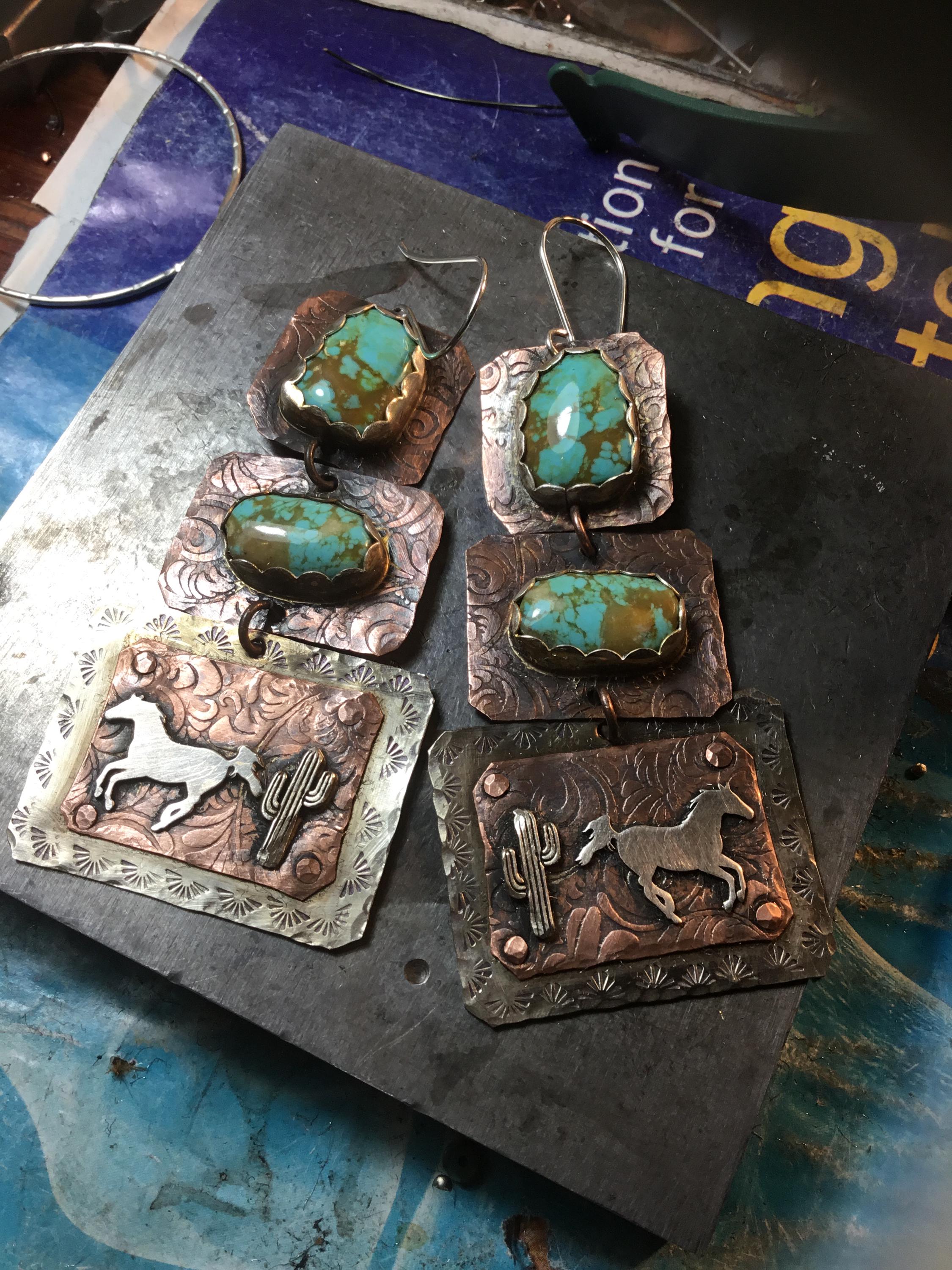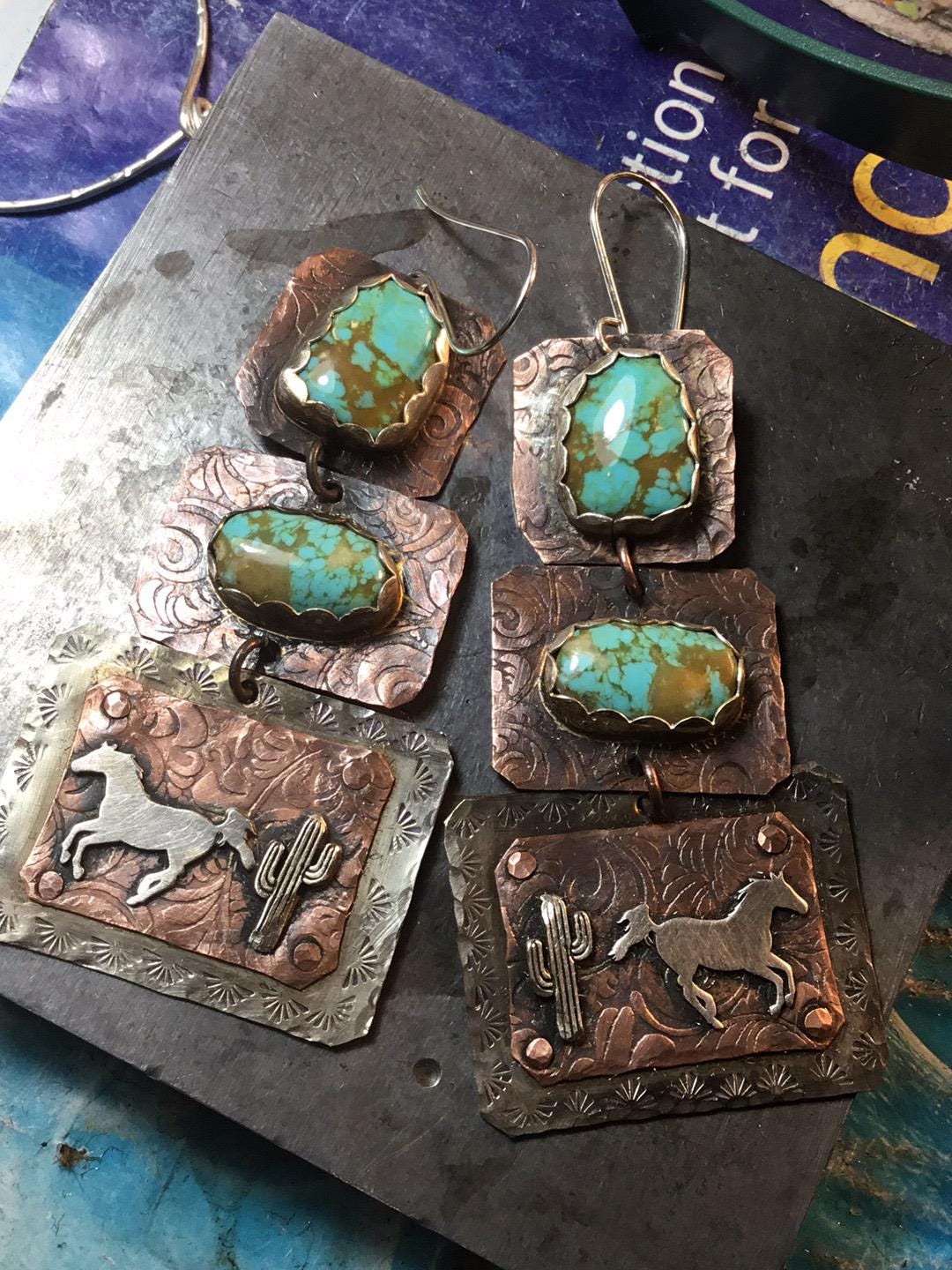 MADE TO ORDER silver screen cowboy earrings by Weathered soul you pick stones from my selection, western fashion,statement jewelry. These earrings are my most favorite of all time! Please note these are made to order. These are NOT the actual earrings you will receive but a pair similar with you choosing your stones from my collection! These are very large earrings but they are remarkably not overly heavy. Yes they have weight to them but definitely not an unbearable wear! Would probably not be comfortable for sensitive ears. I could always just add one stone instead of two for less weight. These are absolutely pieces of art! You can choose ponies running in the same direction or towards or away from each other. Sterling and copper blend beautifully on these! Sterling ear wires.