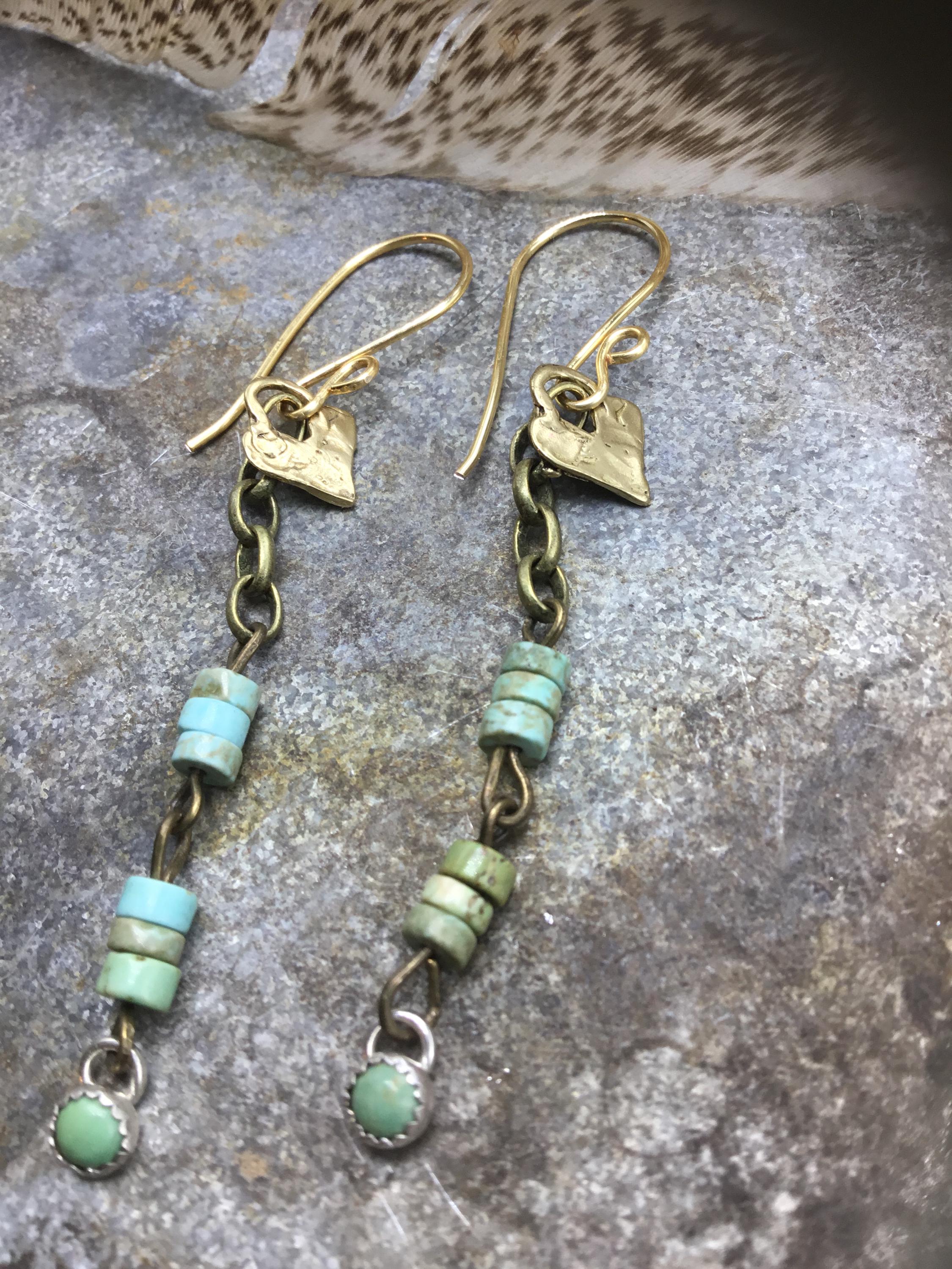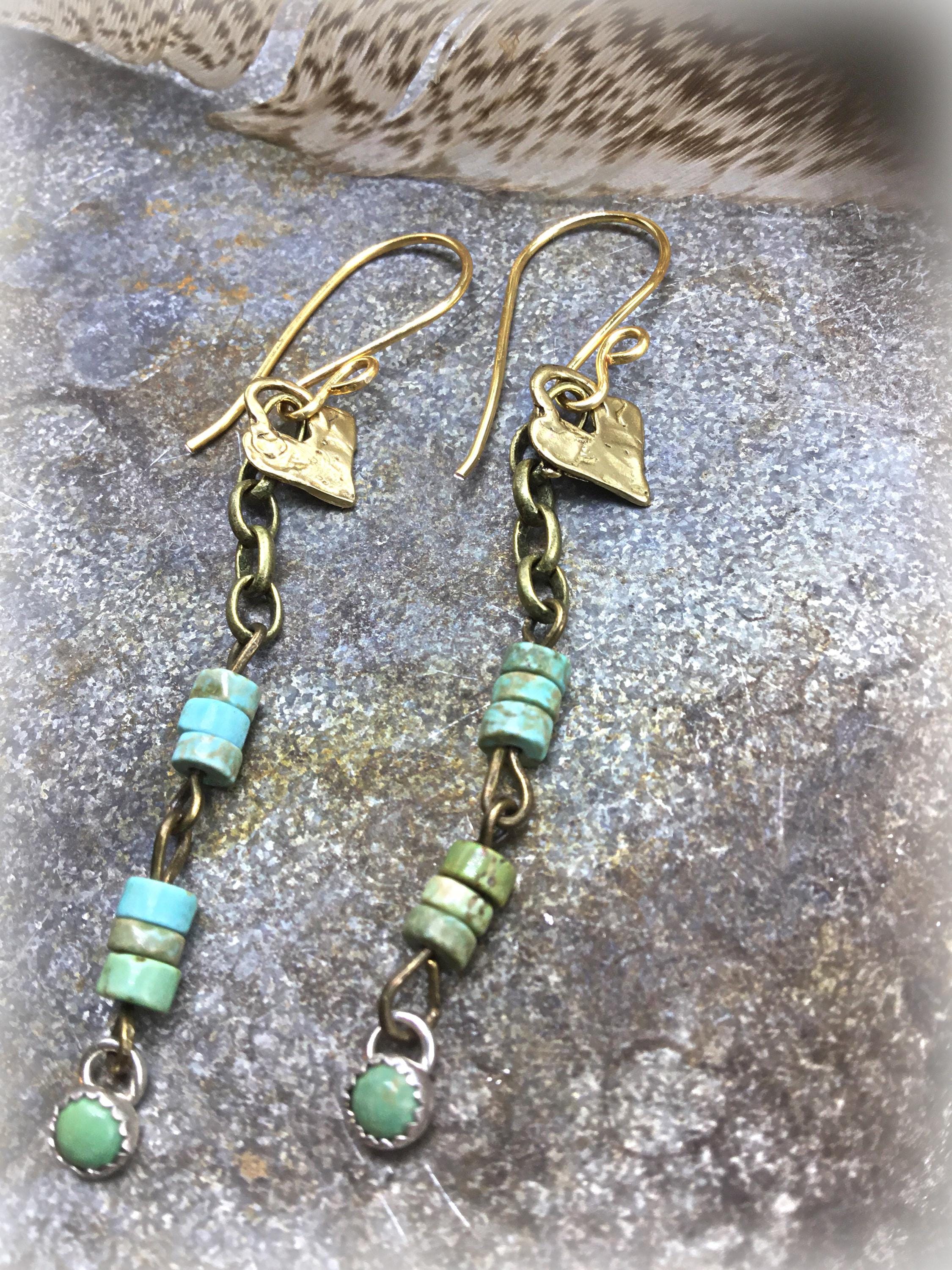 Sweet long dainty bronze heart earrings with turquoise tiny Kingman bezel set drop on rosary style wrap chain by Weathered Soul, boho style
