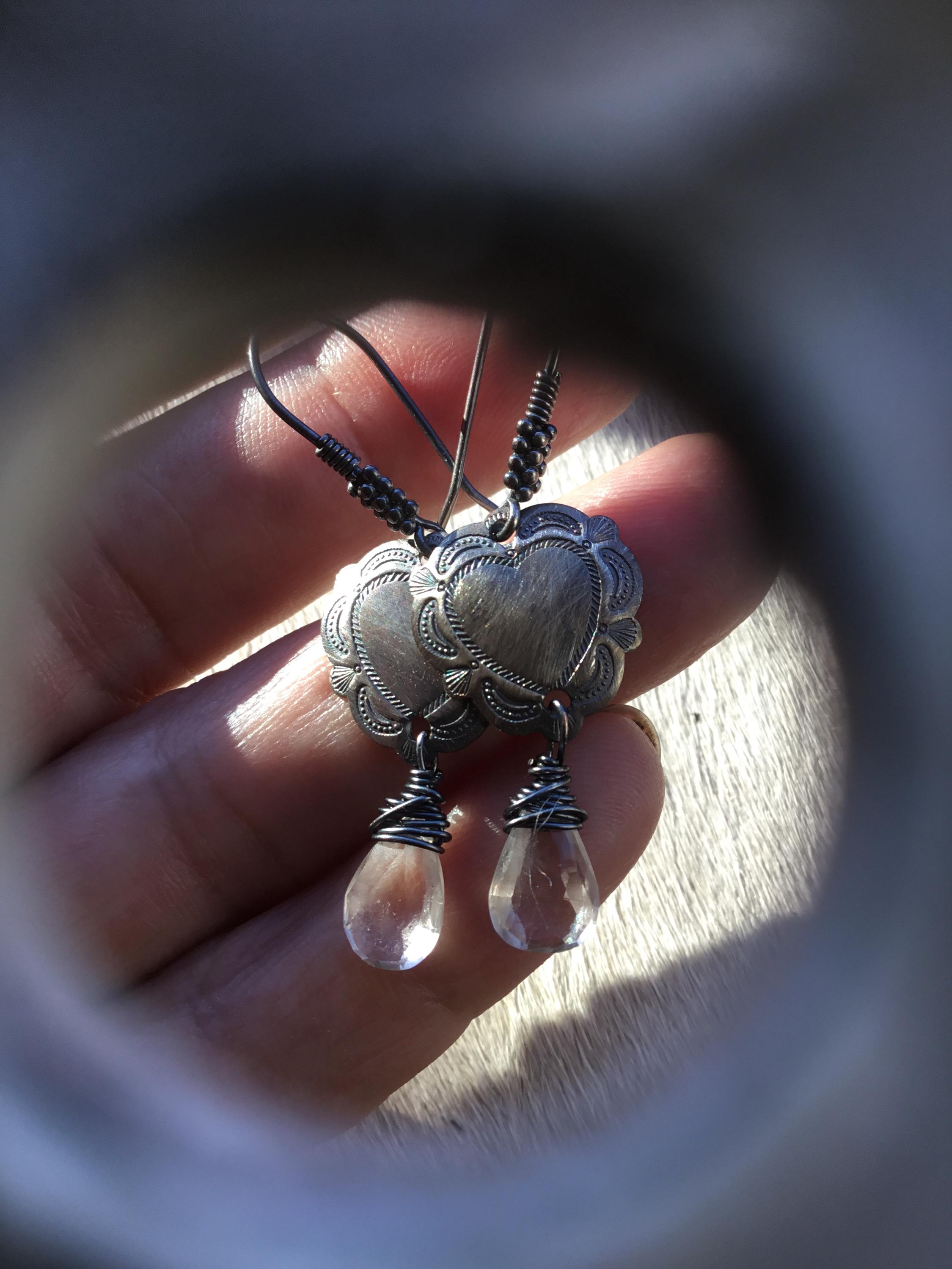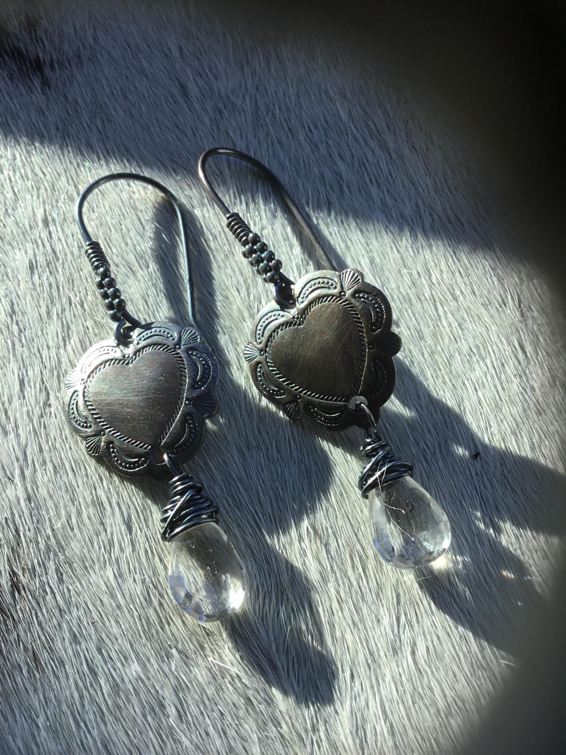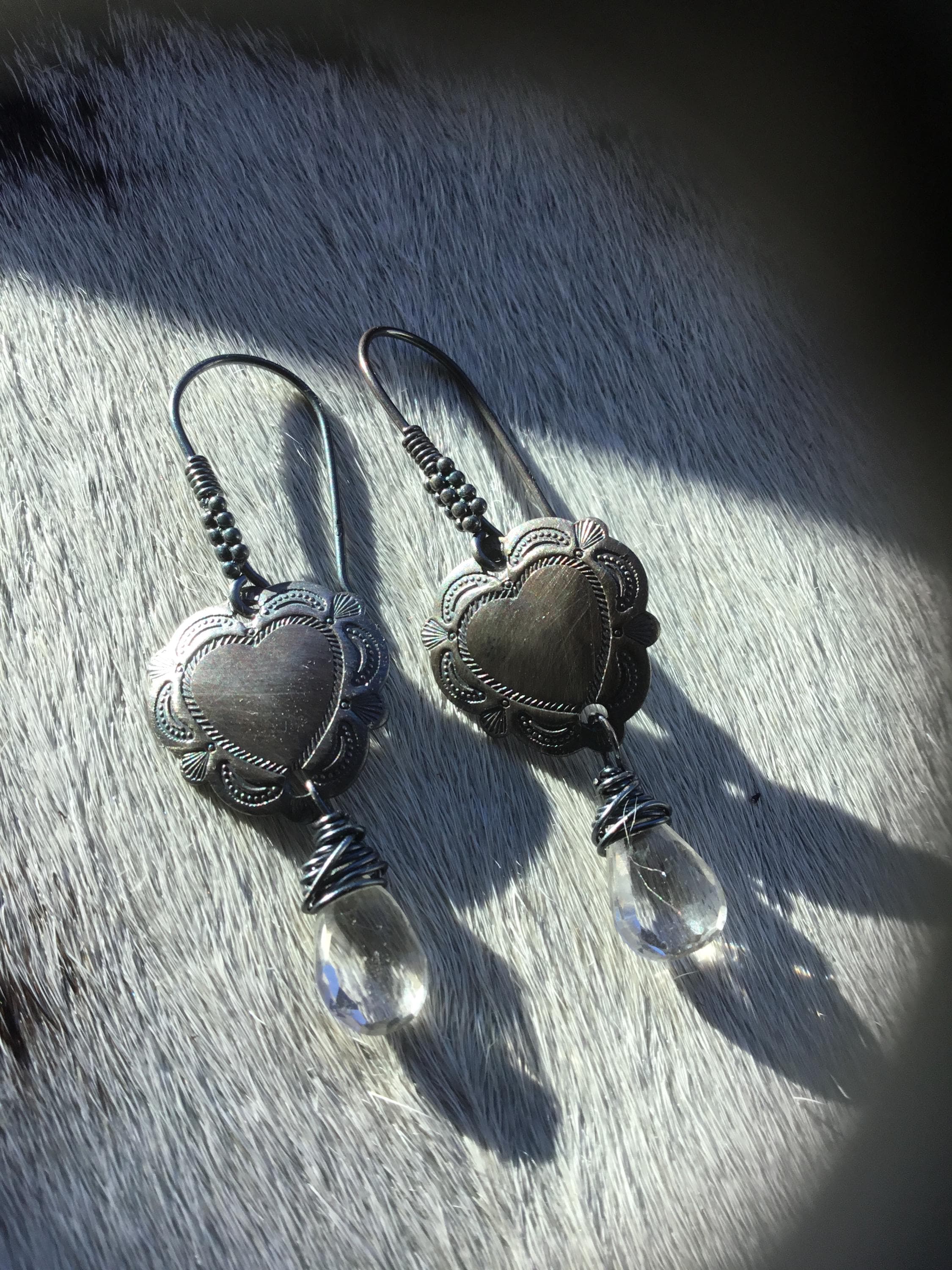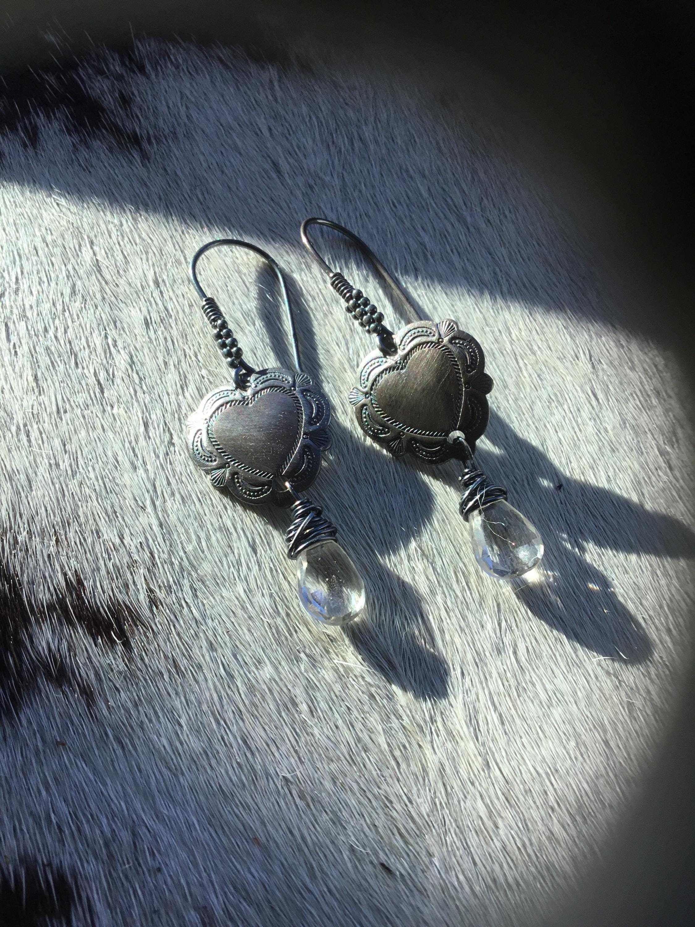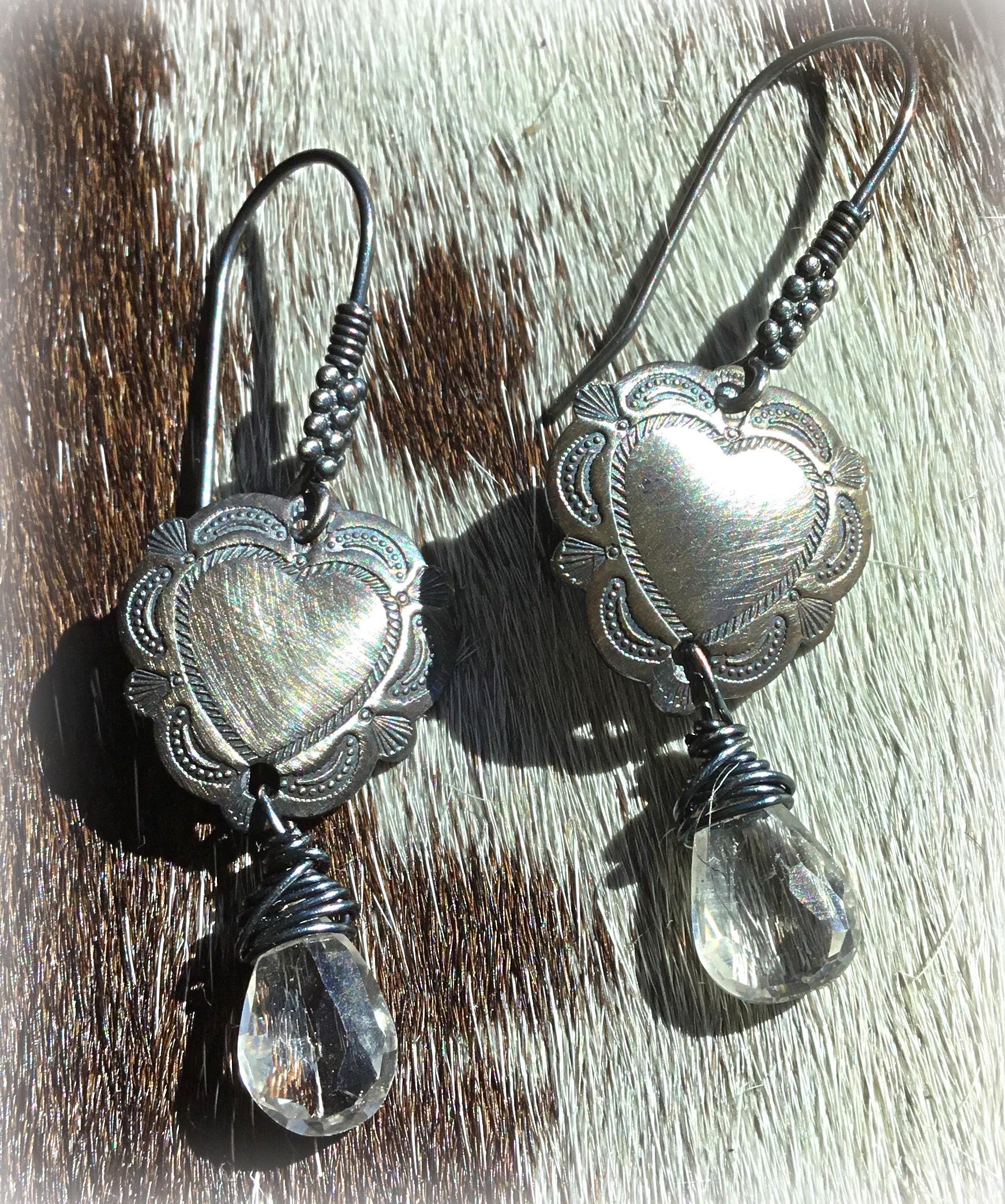 Dainty sterling hearts with topaz wire wrapped teardrop stones with silver ear wires by Weathered Soul jewelry with a little flash of bling!