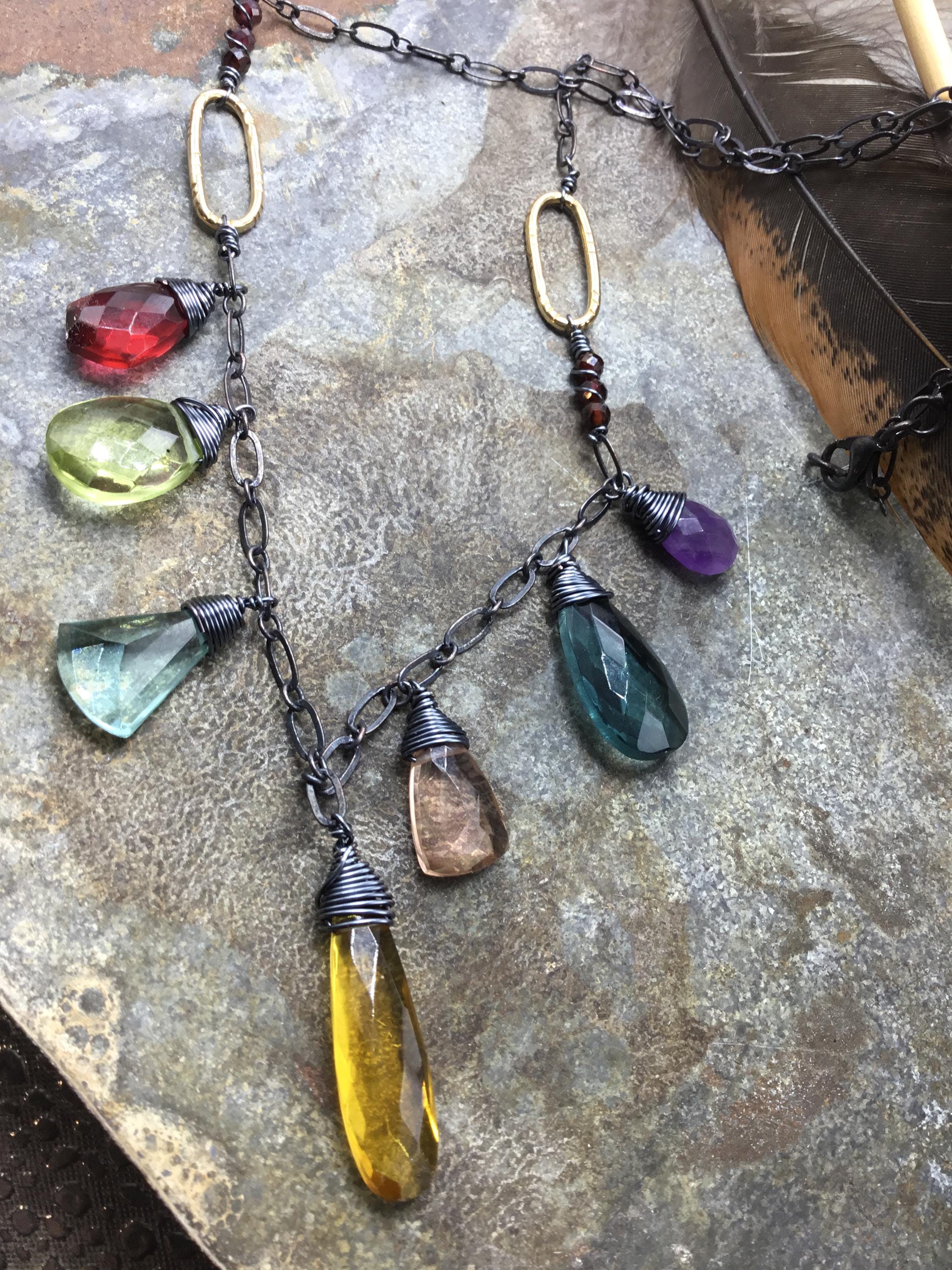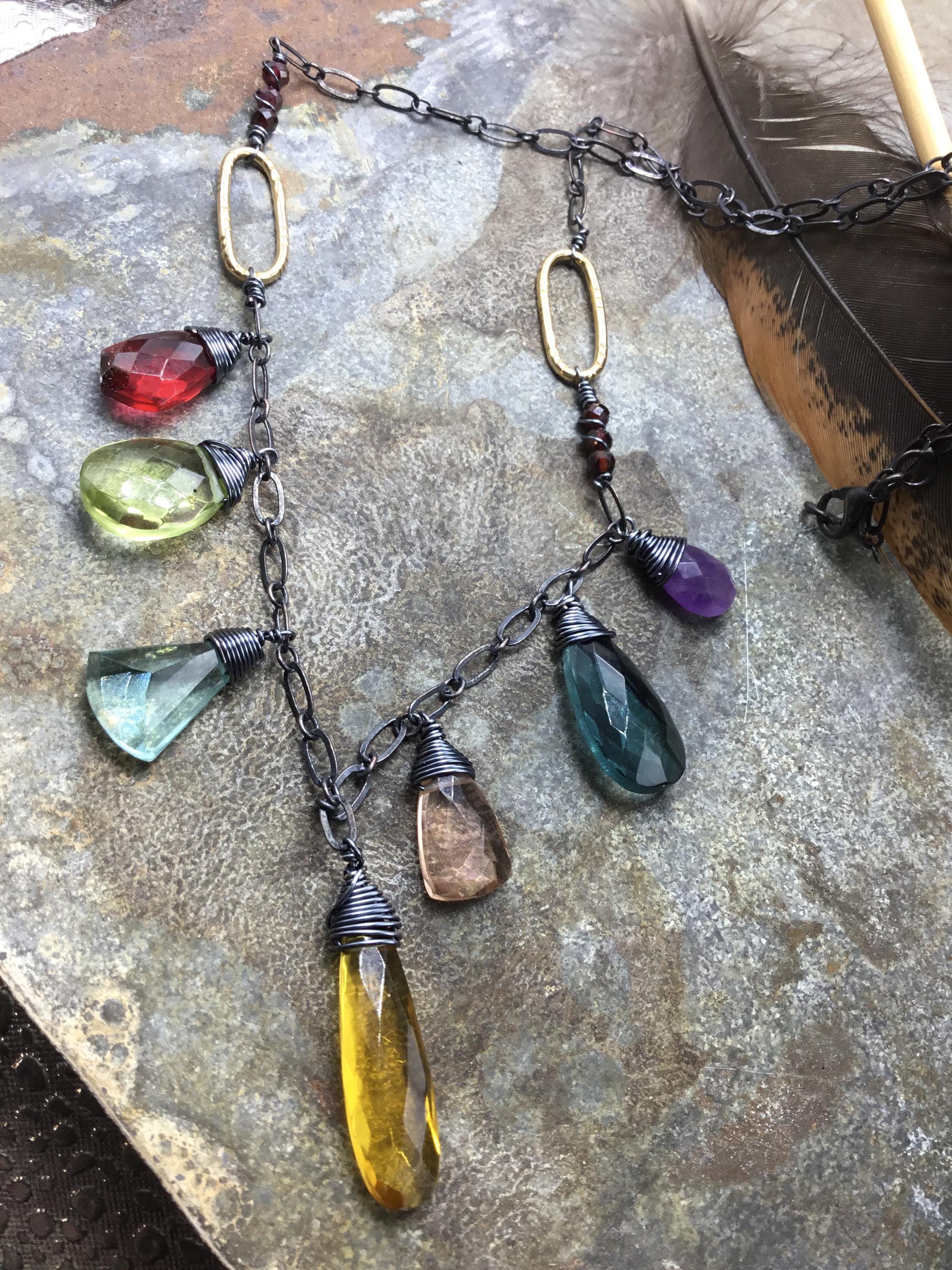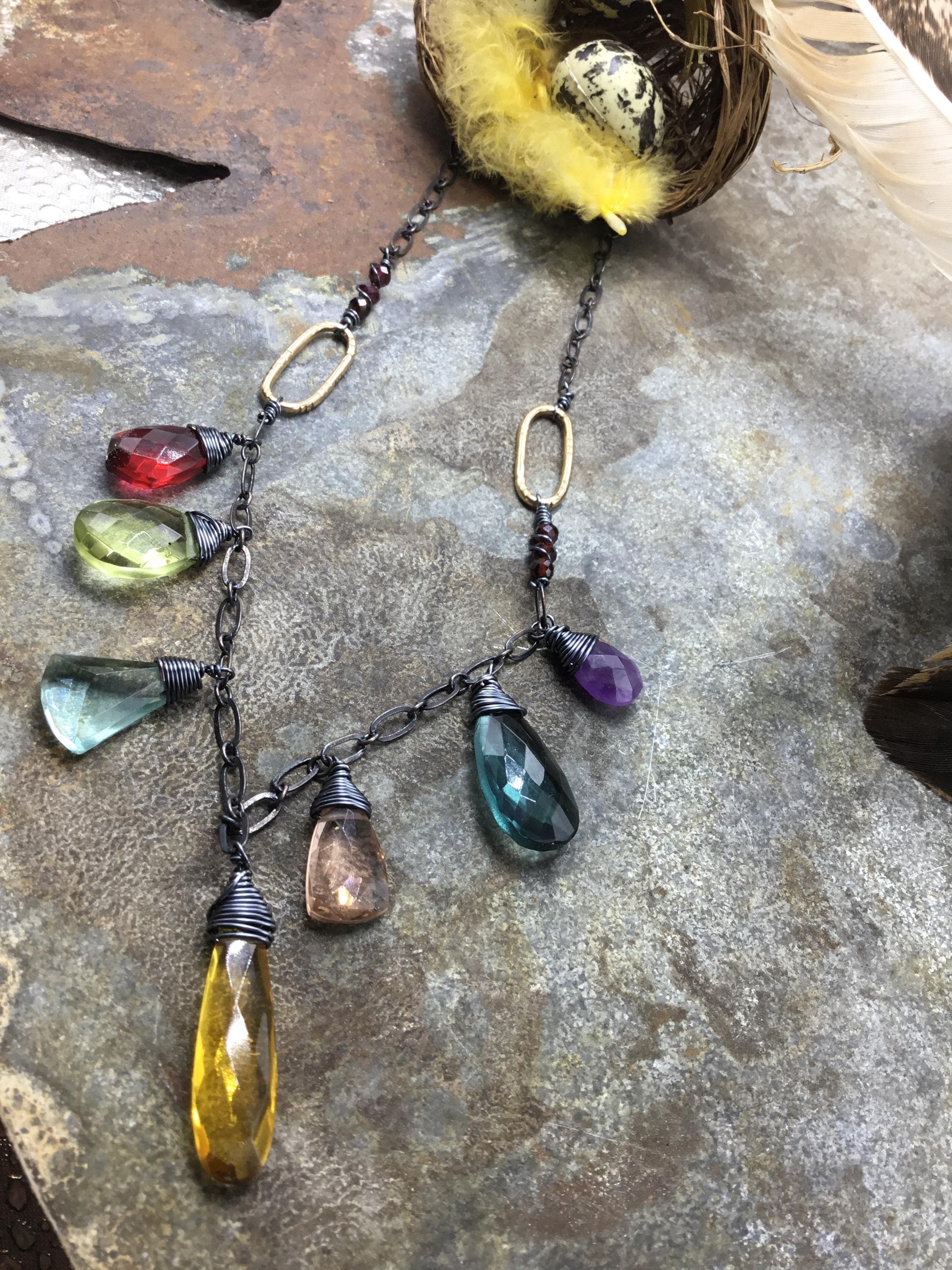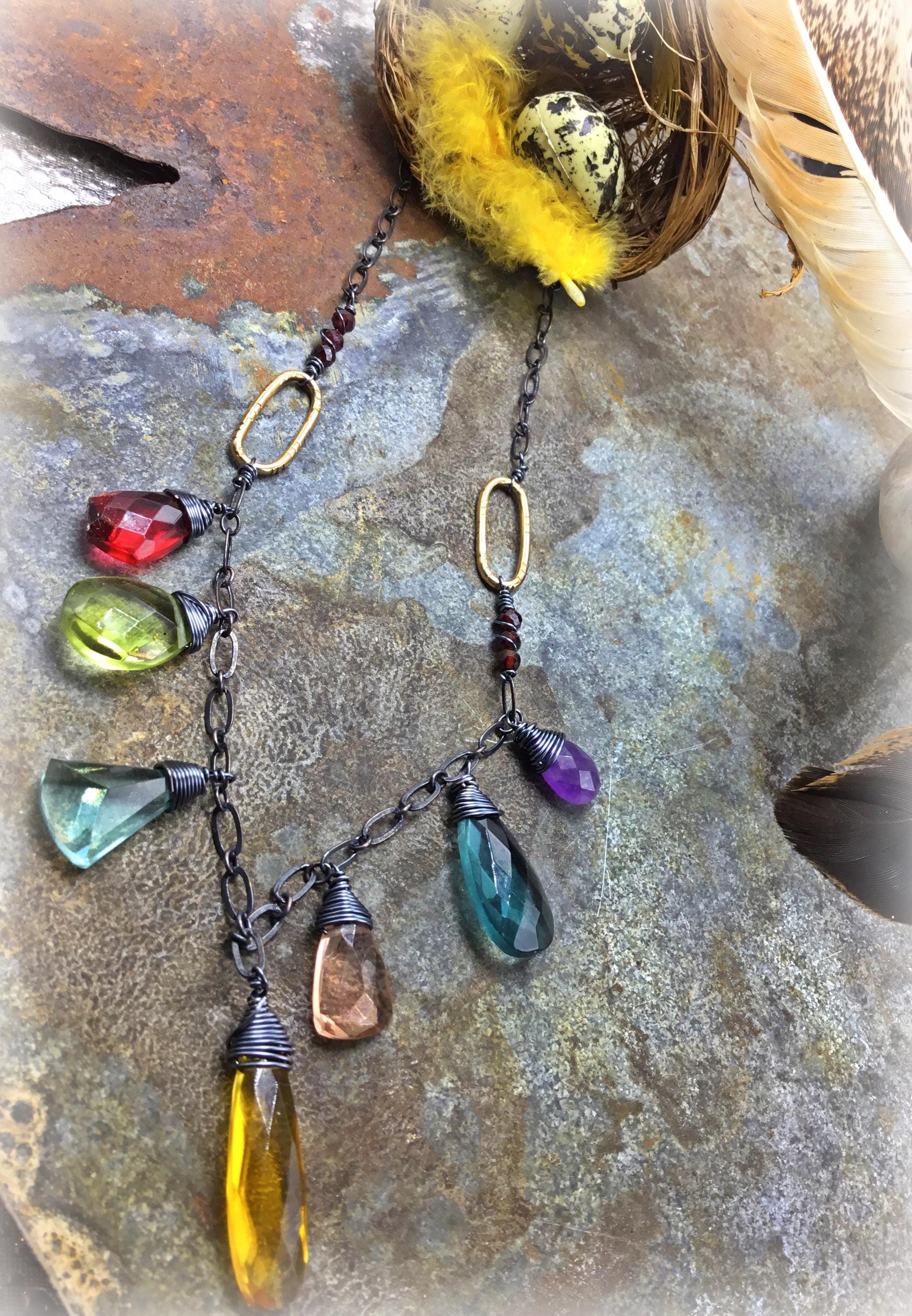 What a fun color combo on blackened oxidized copper rustic chain with topaz, quartz,aquamarine, amethyst citrine and more! Fun added bronze stamped over hoops with topsy turvy wire wrapped garnets on each side. Lobster closure. Stunning piece by Weathered Soul.