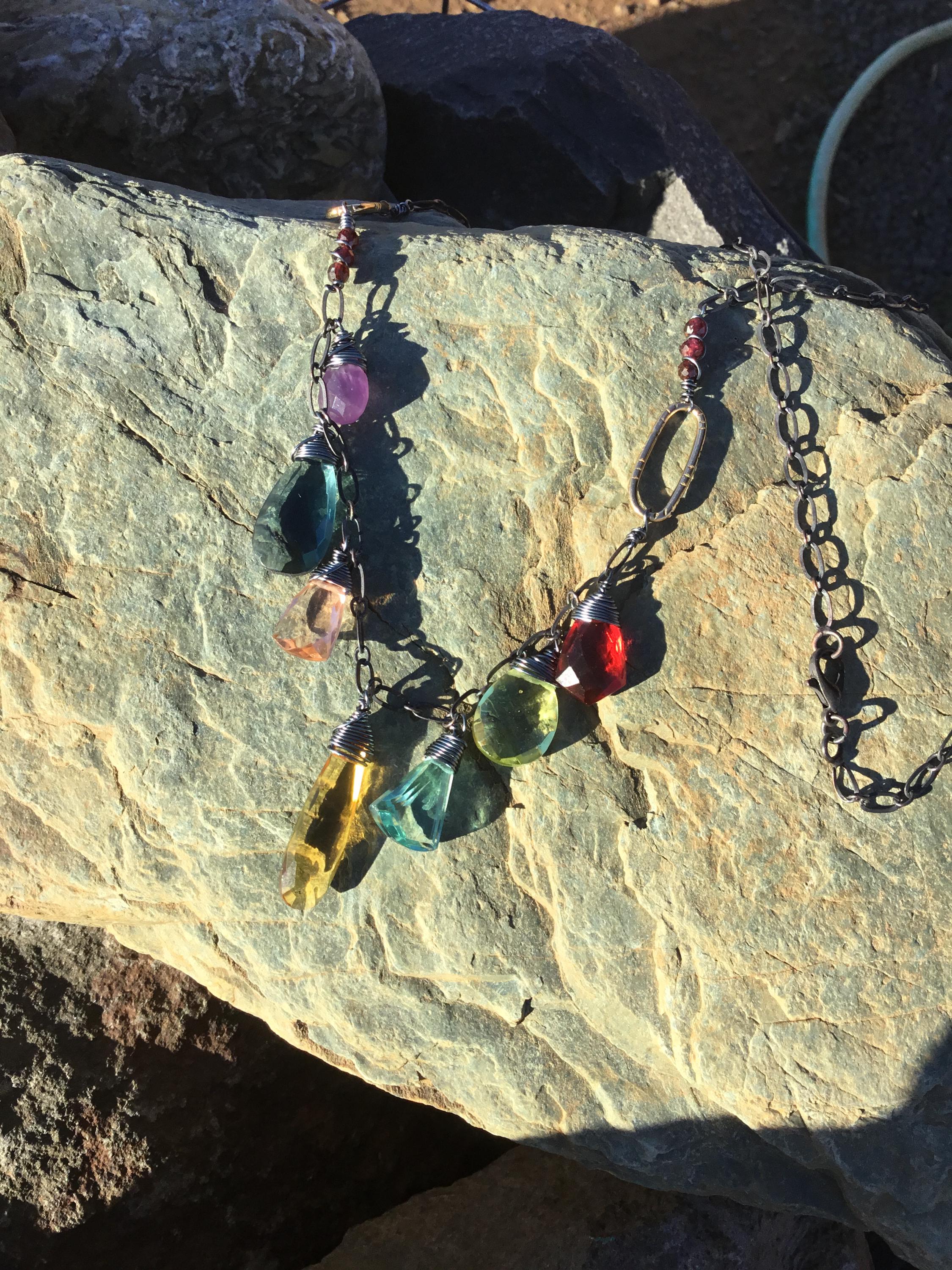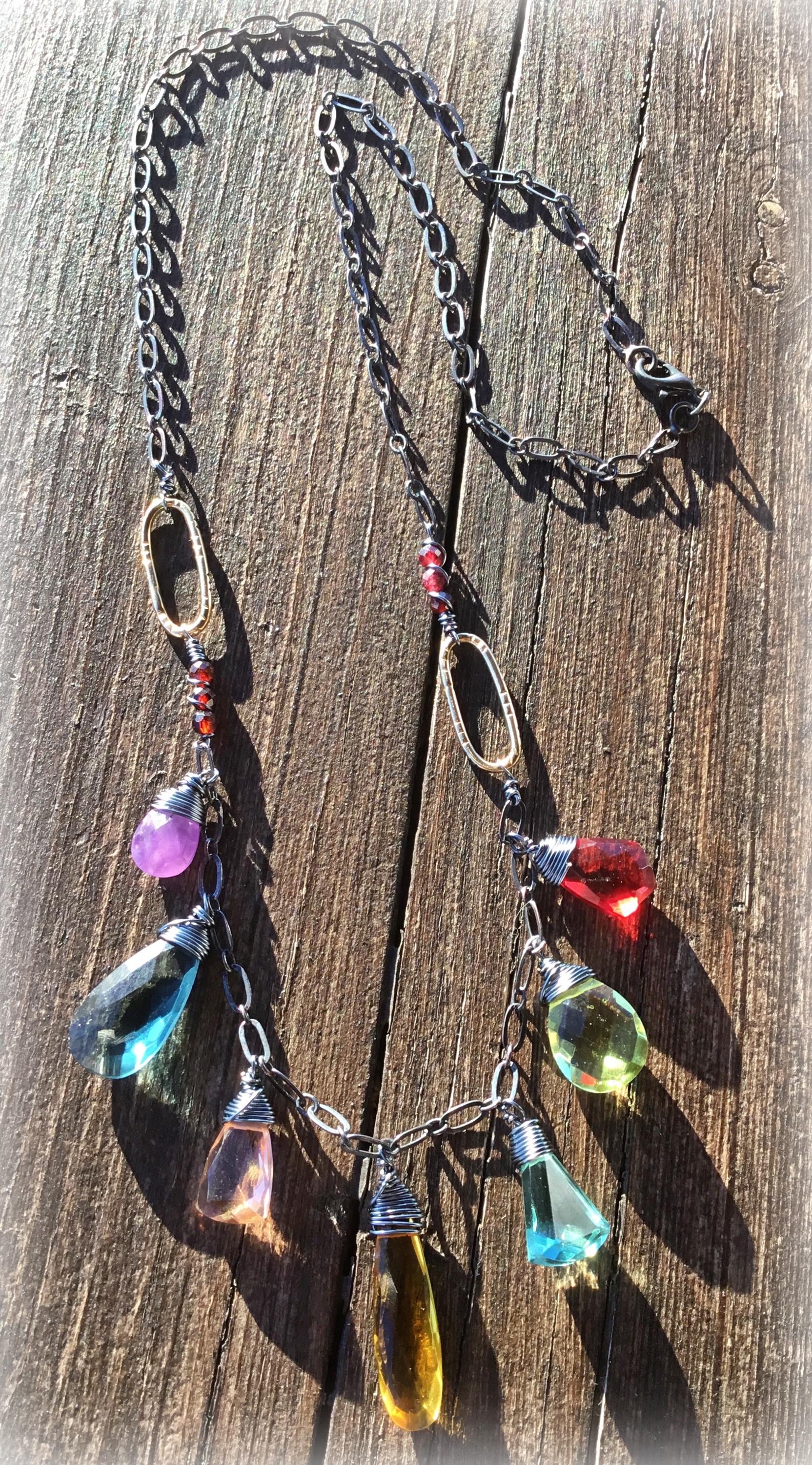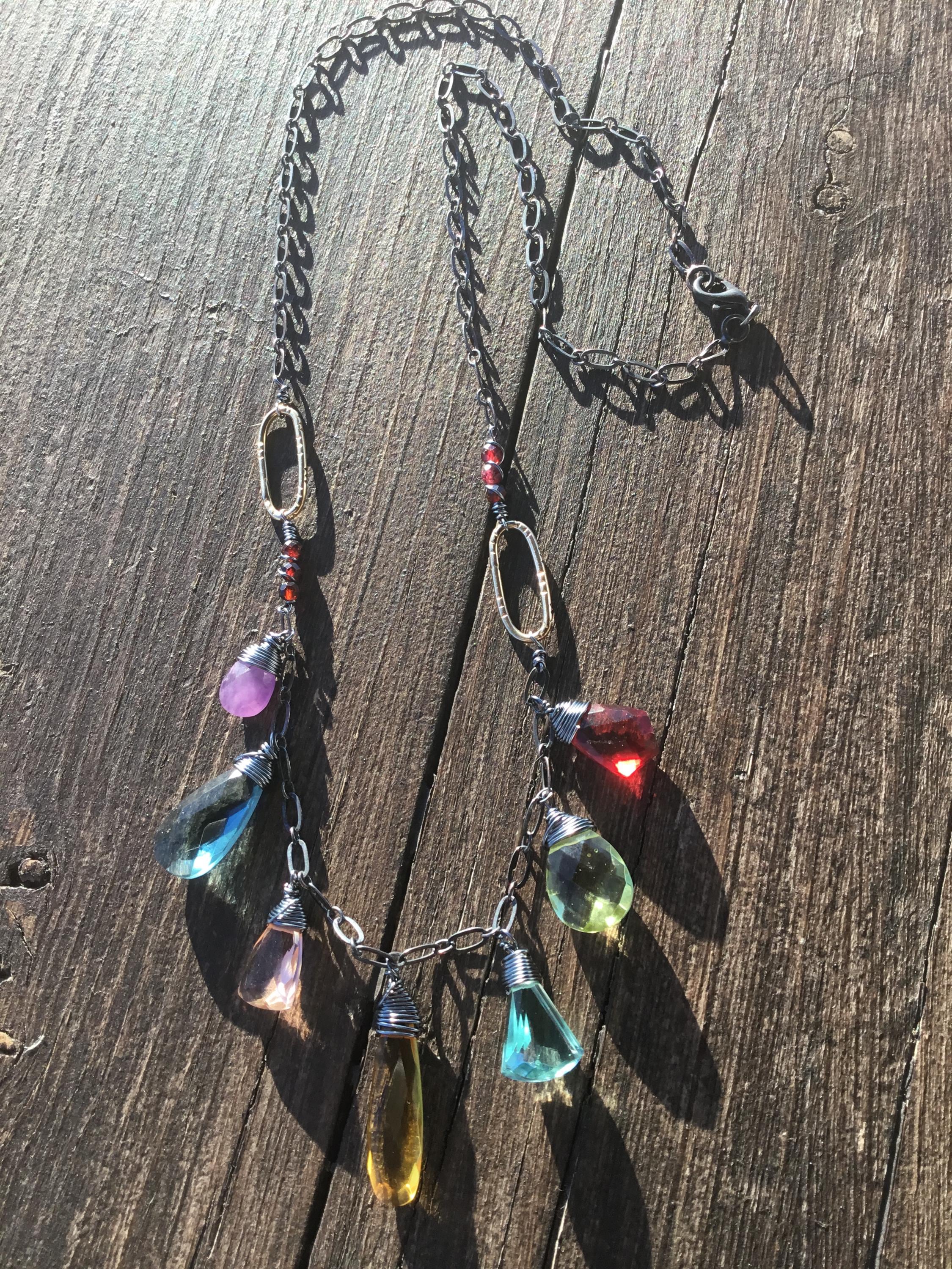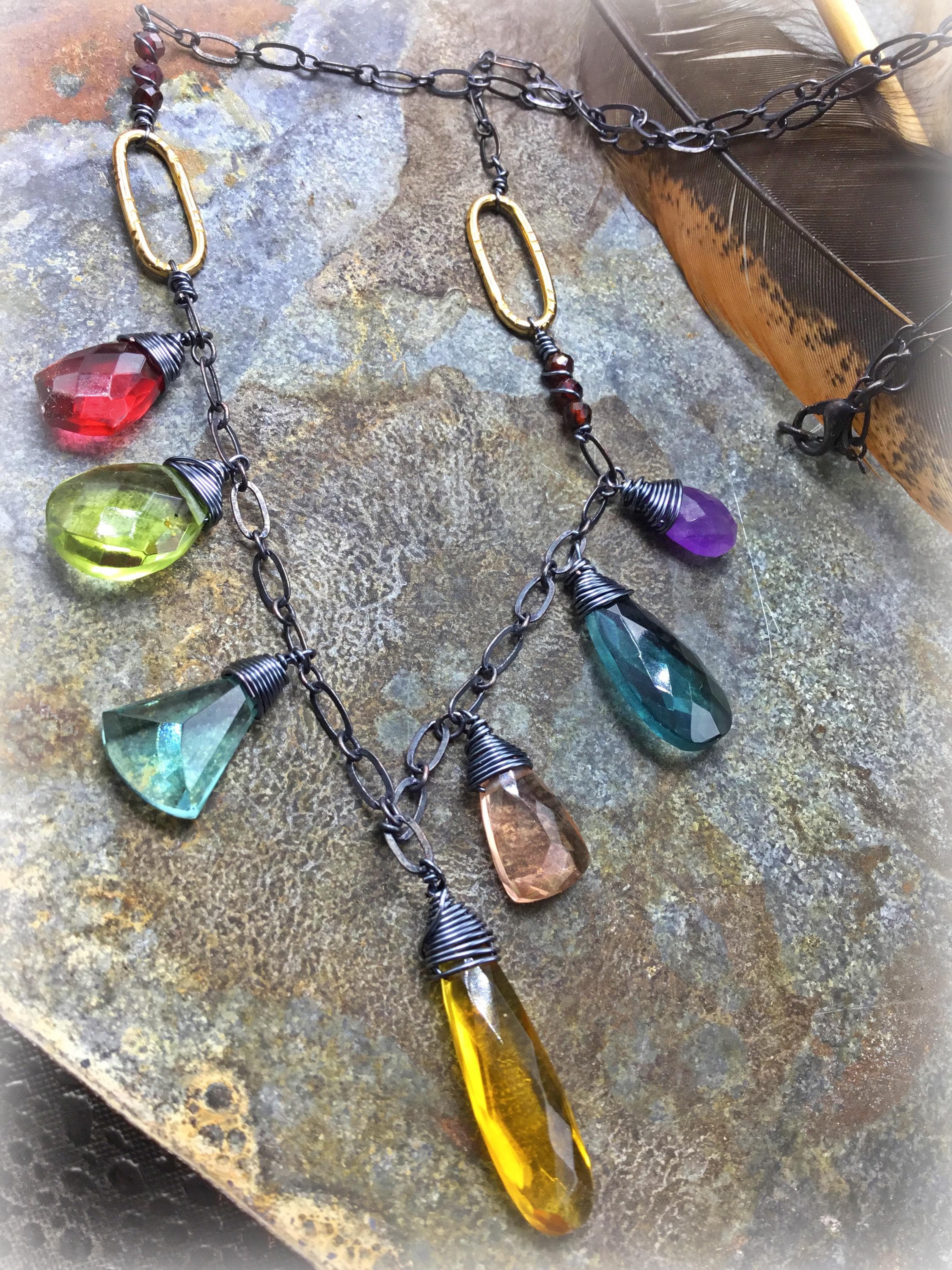 What a fun color combo on blackened oxidized copper rustic chain with topaz, quartz,aquamarine, amethyst citrine and more! Fun added bronze stamped over hoops with topsy turvy wire wrapped garnets on each side. Lobster closure. Stunning piece by Weathered Soul.