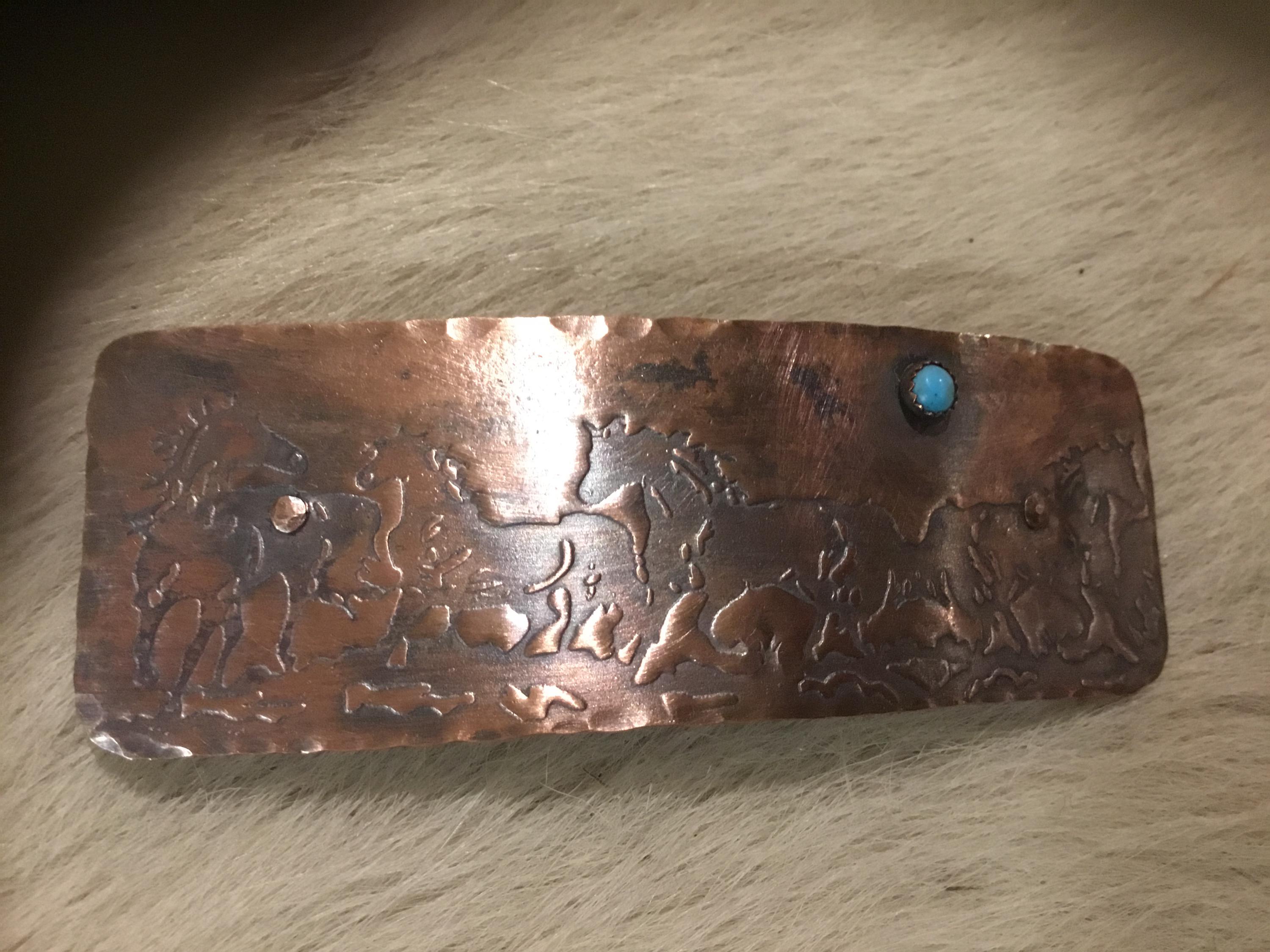 MADE to ORDER Running horse barette by Weathered Soul Copper with Kingman turquoise. Approximately 3” long by 1” wide. Clip itself is made in France,