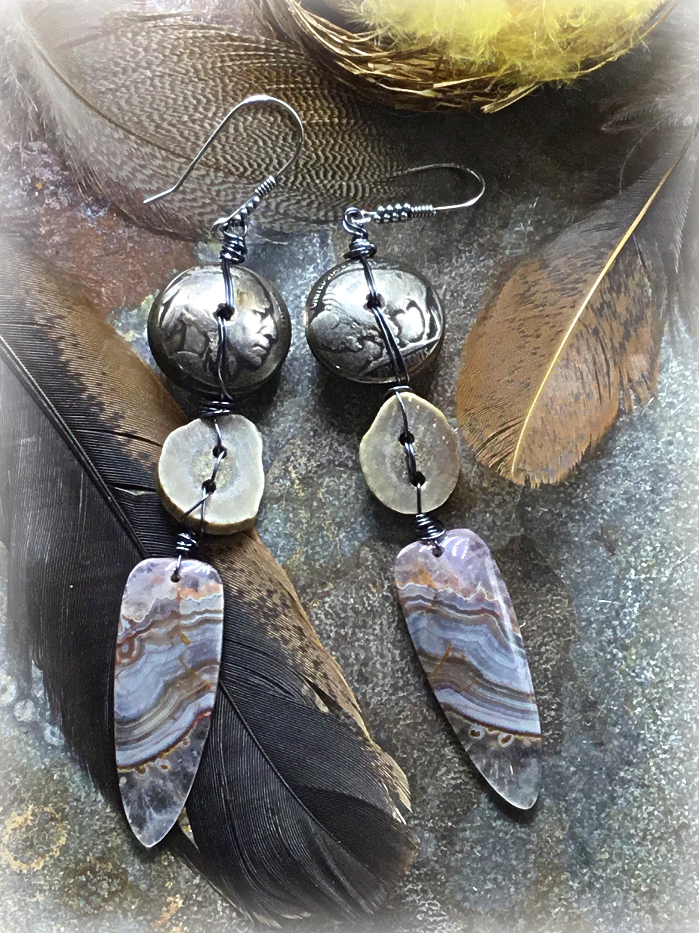 Vintage buffalo nickel beaded earrings with antler and agate by Weathered Soul