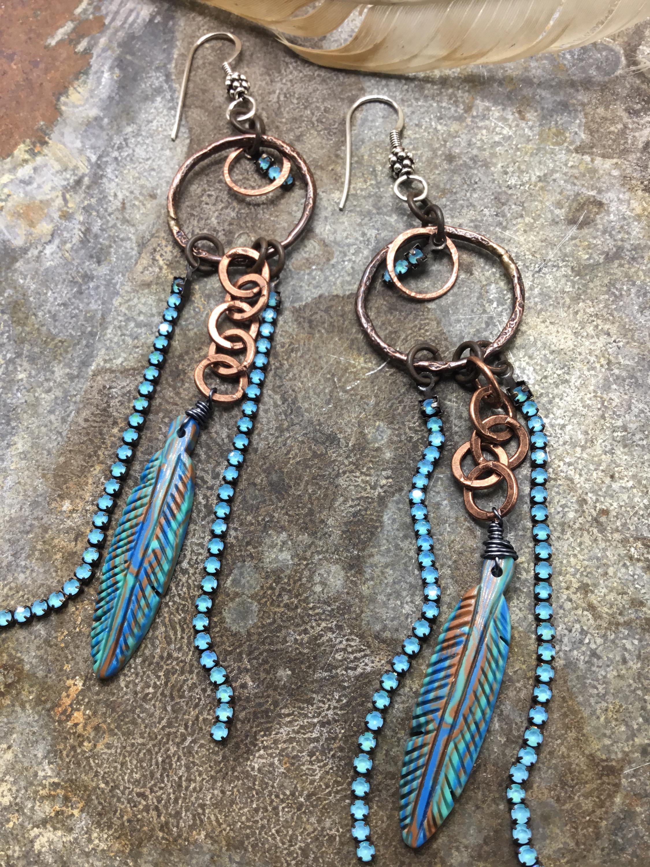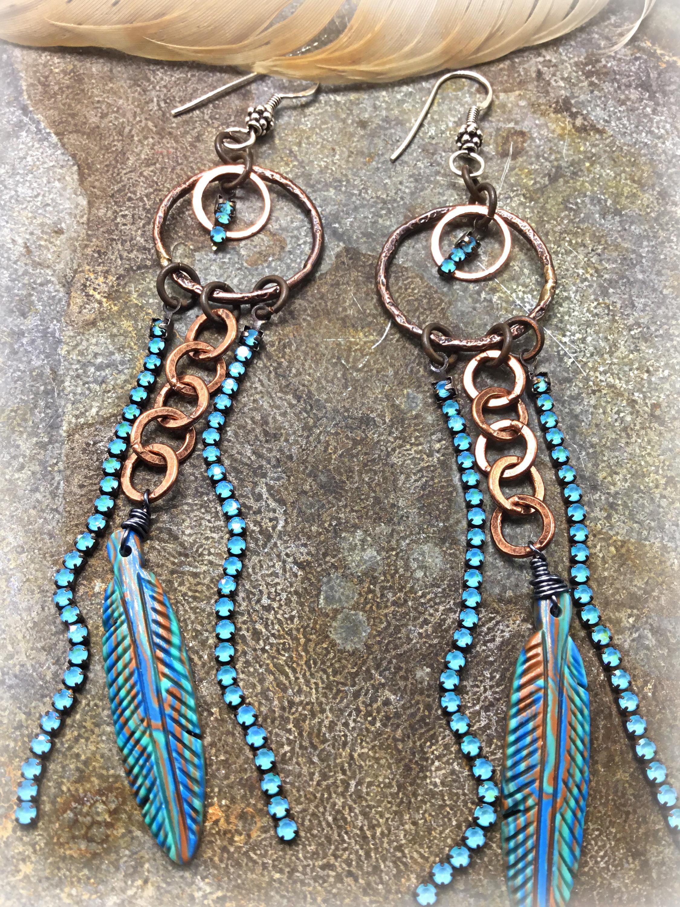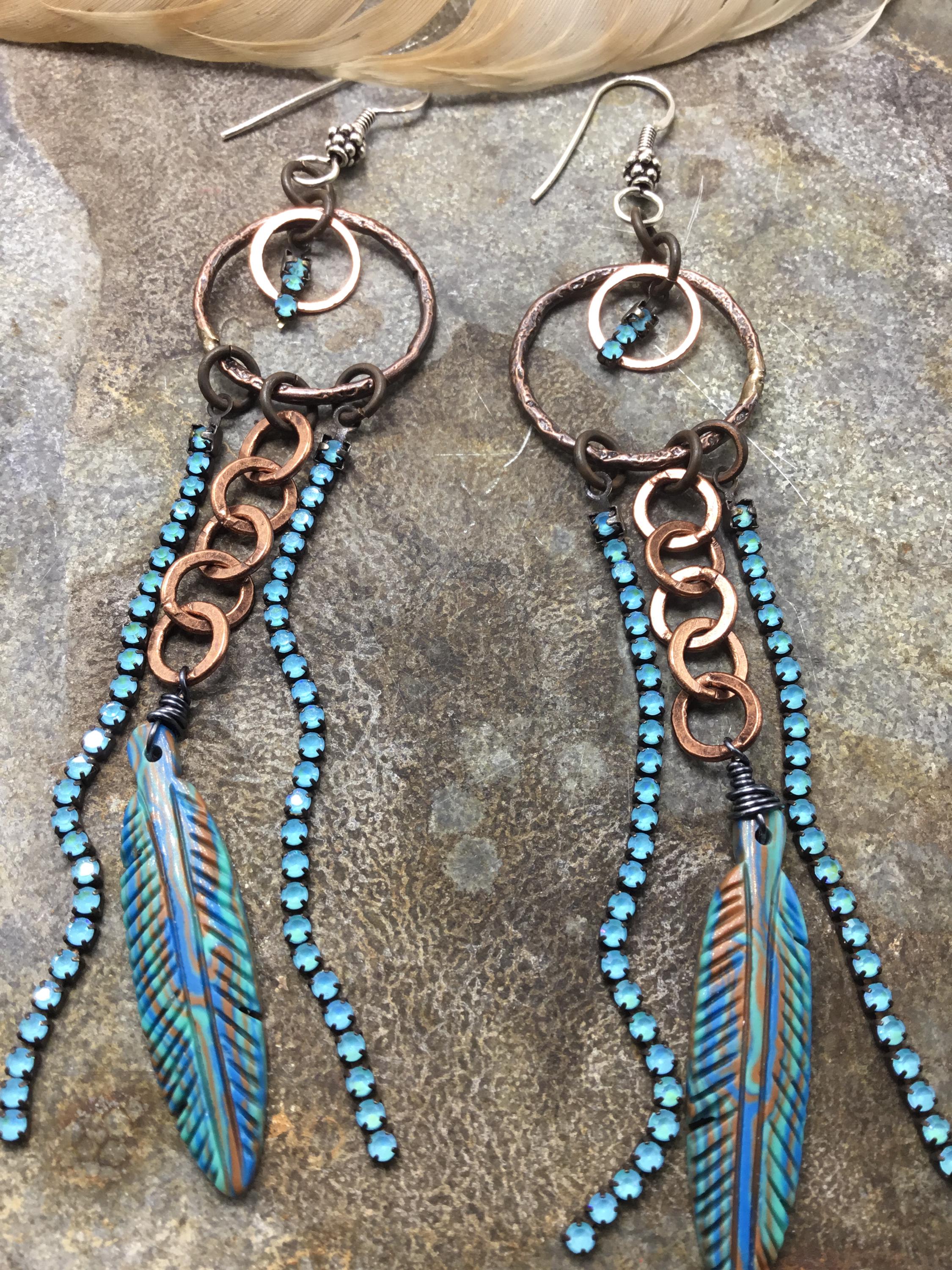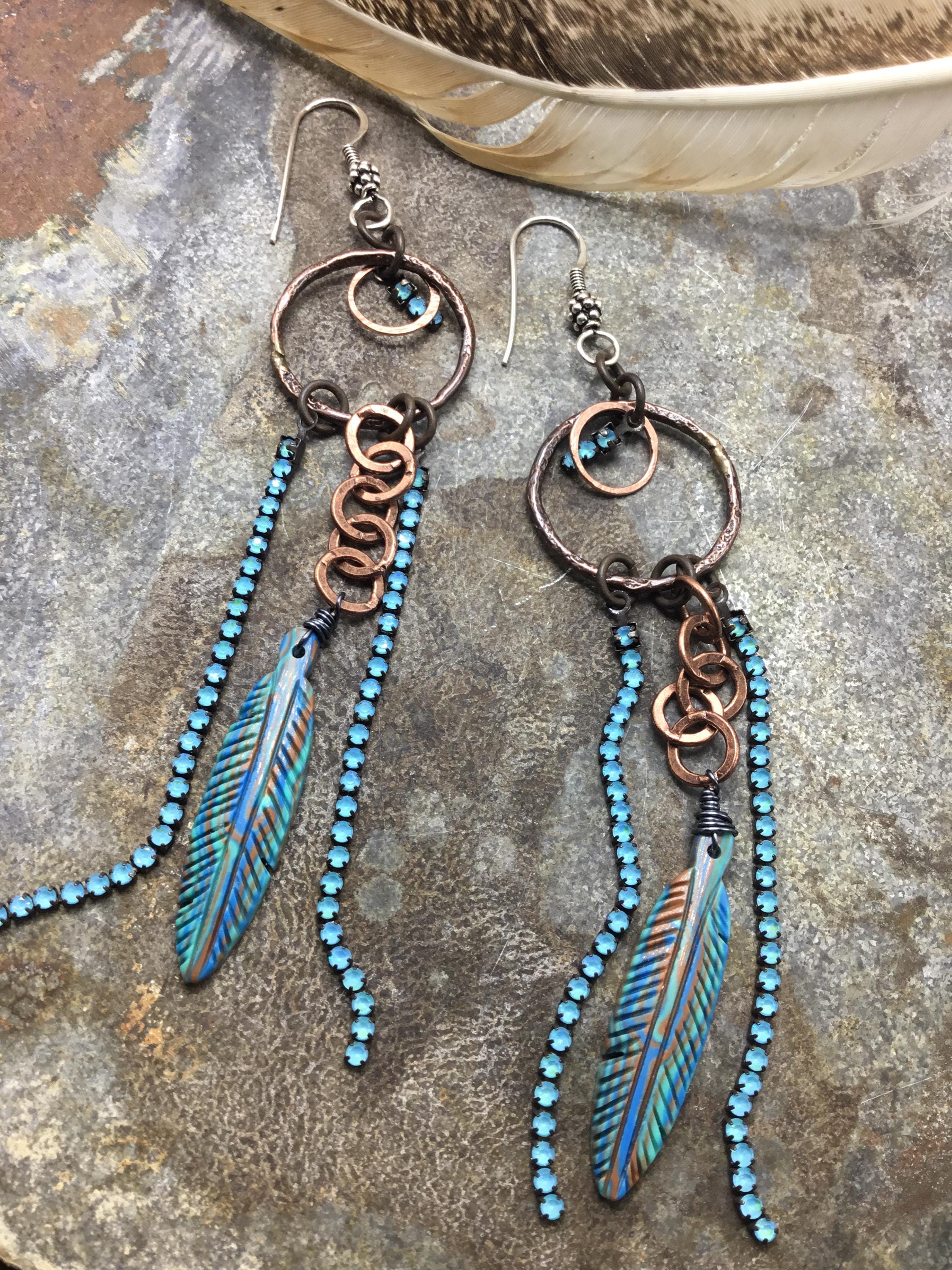Just dazzling long bling rhinestone artisan hoops by Weathered Soul jewelry. These are rustic hand forged copper hoops approximately 1” diameter with copper link chain, carved stone feathers, and fun strands of beautiful strands of turquoise rhinestones. Shoulder duster statement earrings. Sterling silver ear wires.