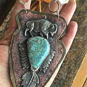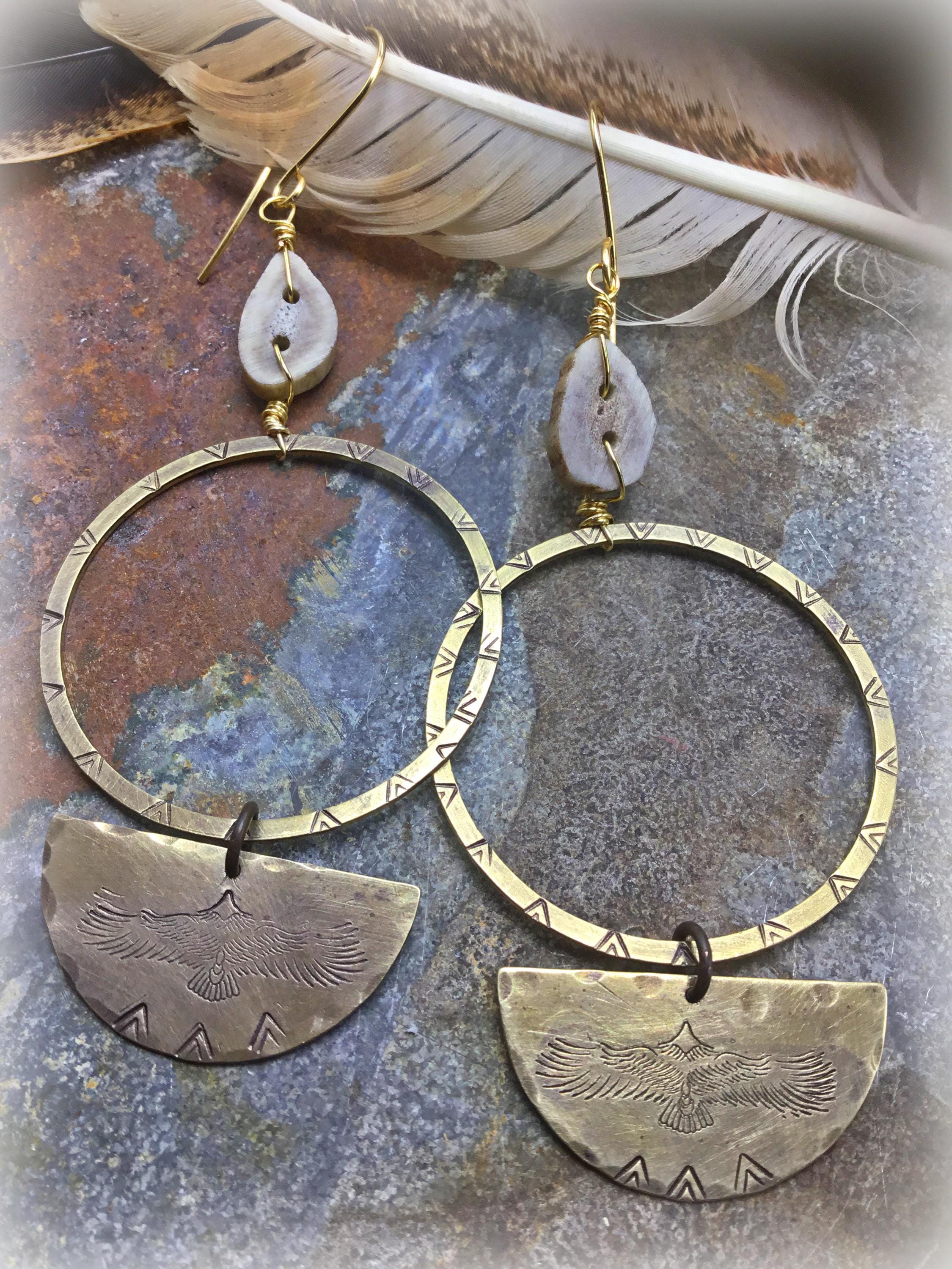 In flight bronze hoops by Weathered Soul Jewelry. Raven flying on bottom half moon under bronze 1.5” diameter hoops. Very lightweight for their size. Little Aztec stamping on hoops match the touches below the raven. Antler horn wire wrapped on top. Bronze ear wires.