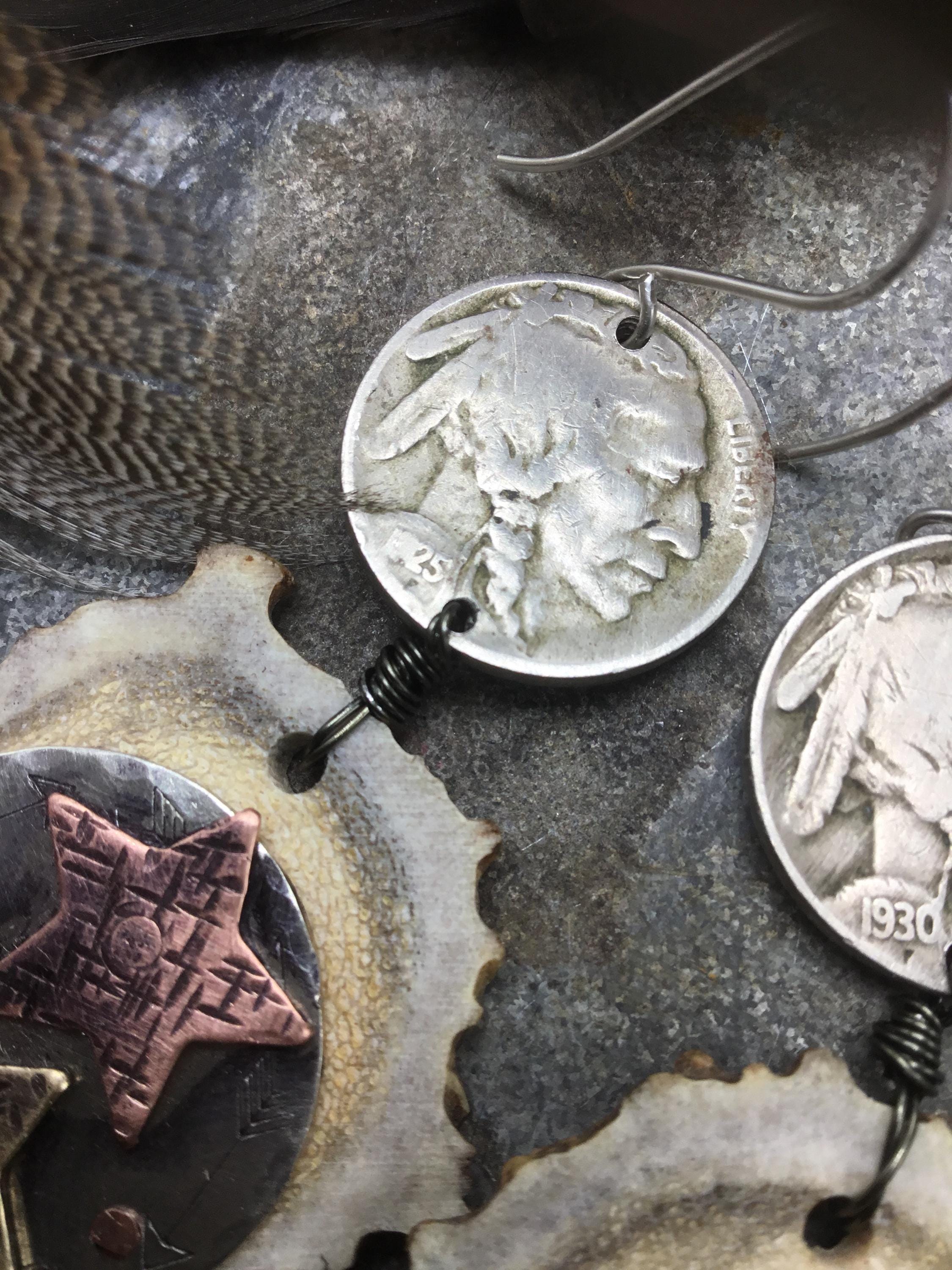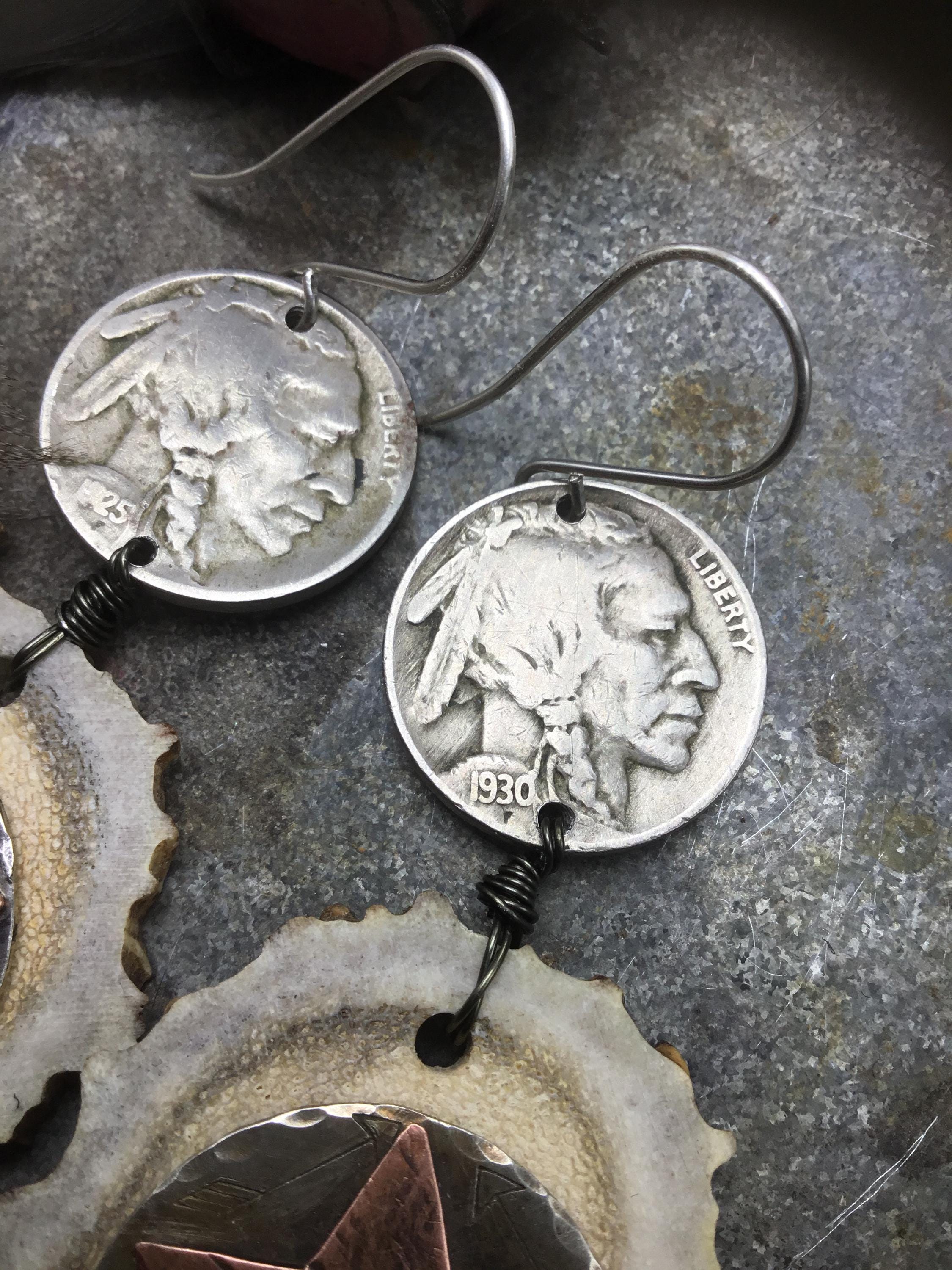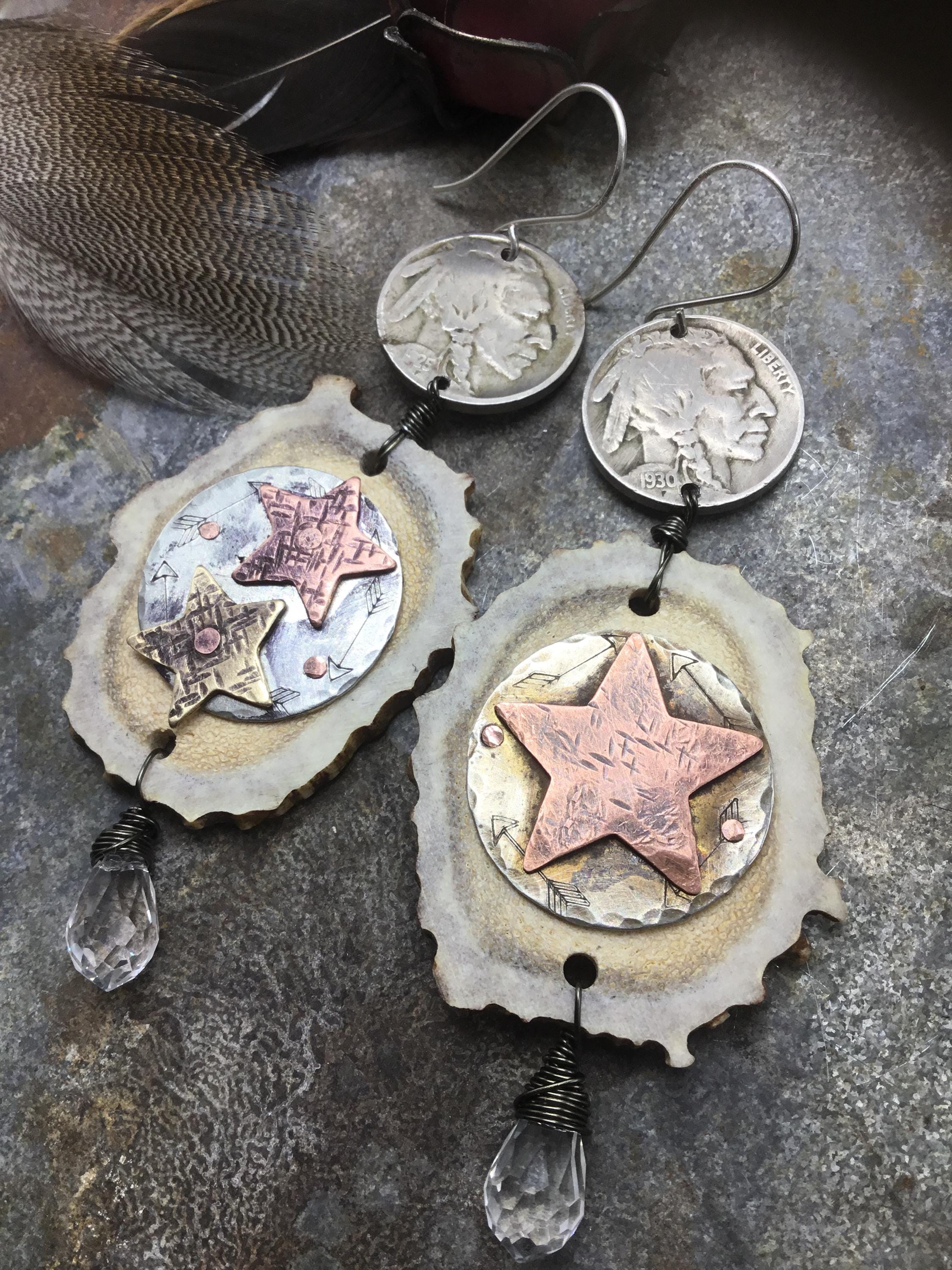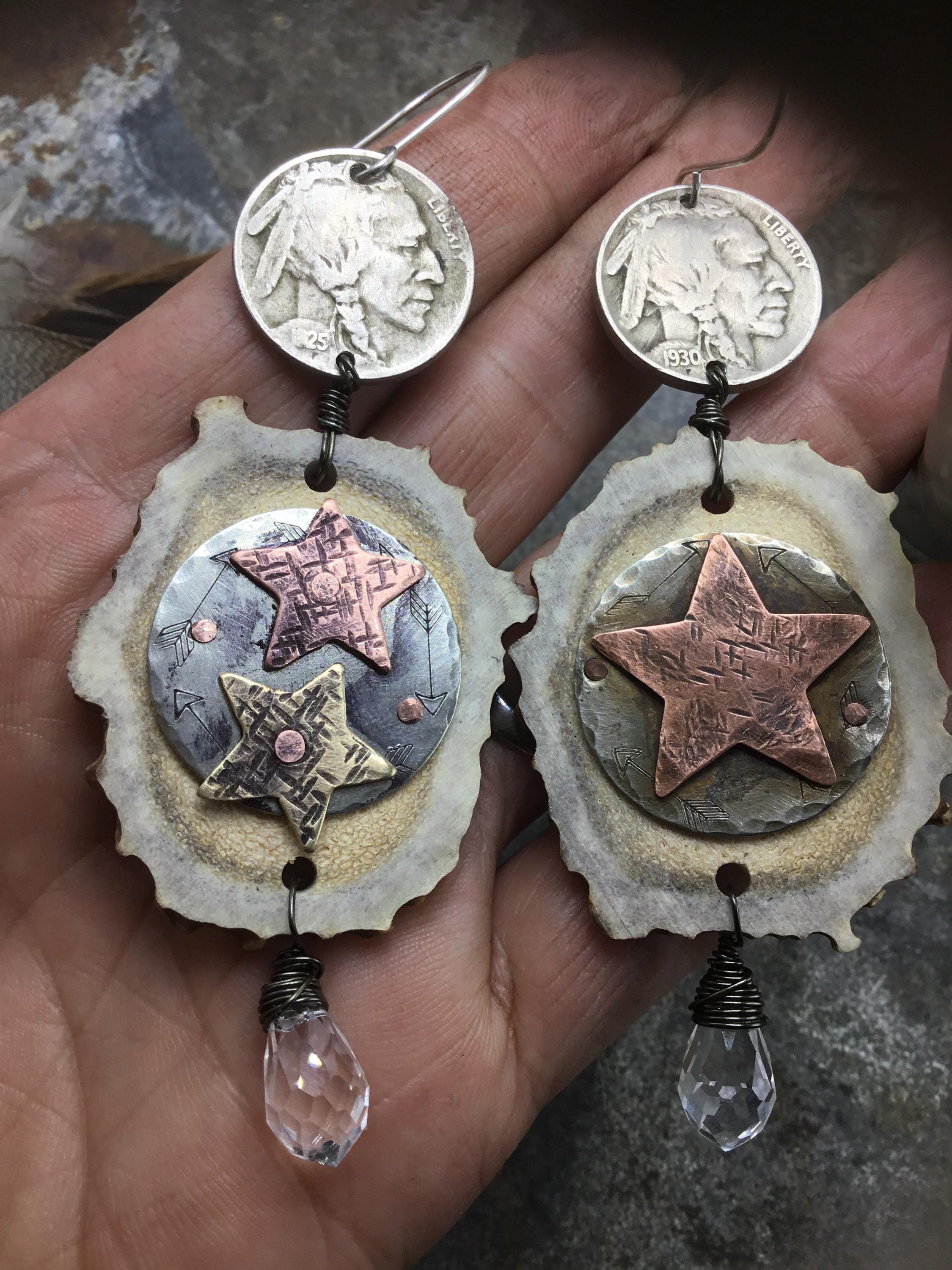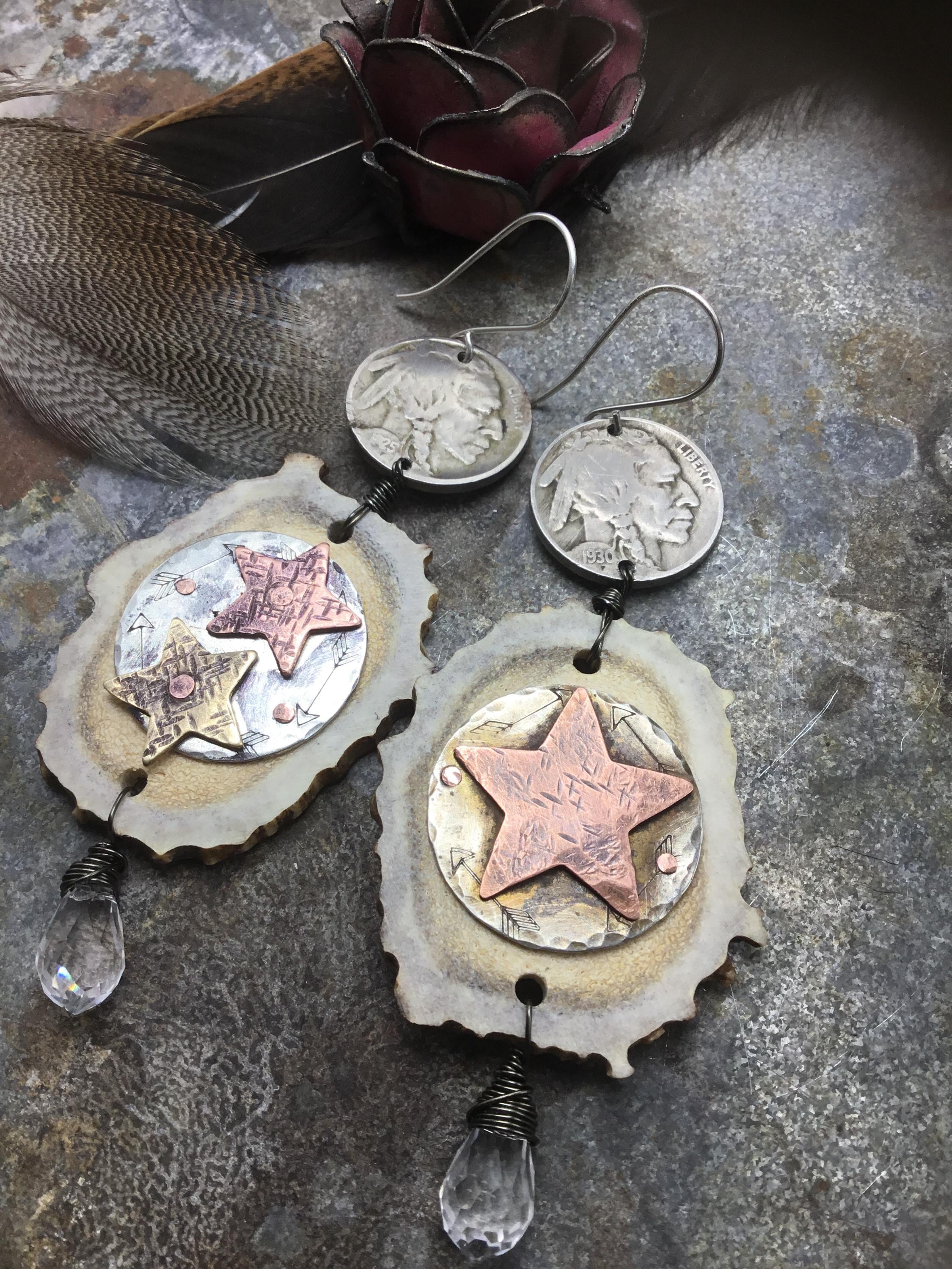 Western heritage earrings by Weathered Soul artisan jewelry. Large antler horn slabs with sterling discs riveted on to horn. Stars in copper and bronze with Vintage 1925 and 1930 buffalo nickels make these scream the old west! Just a little Swarovski crystal drop for that NFR feel!