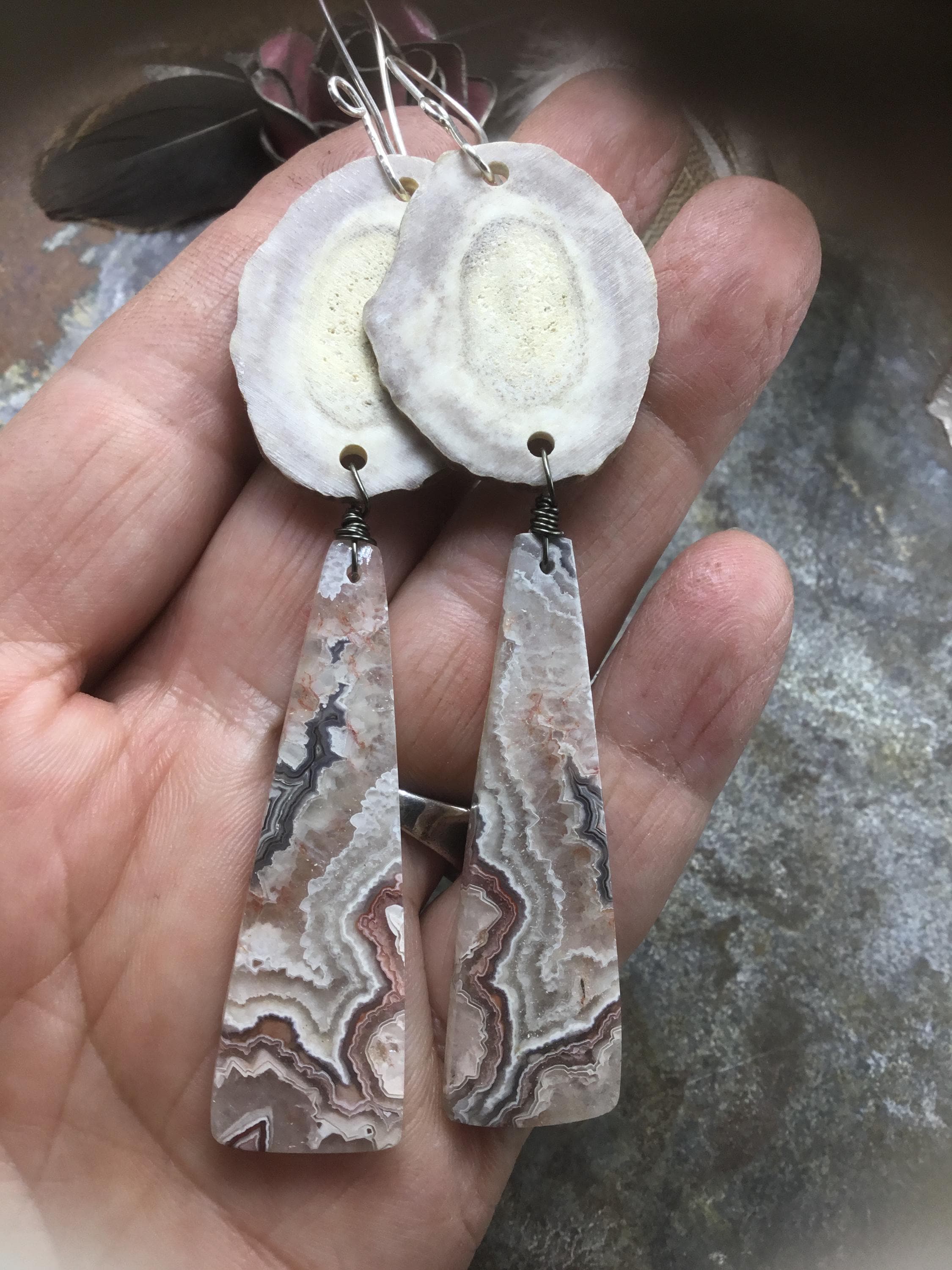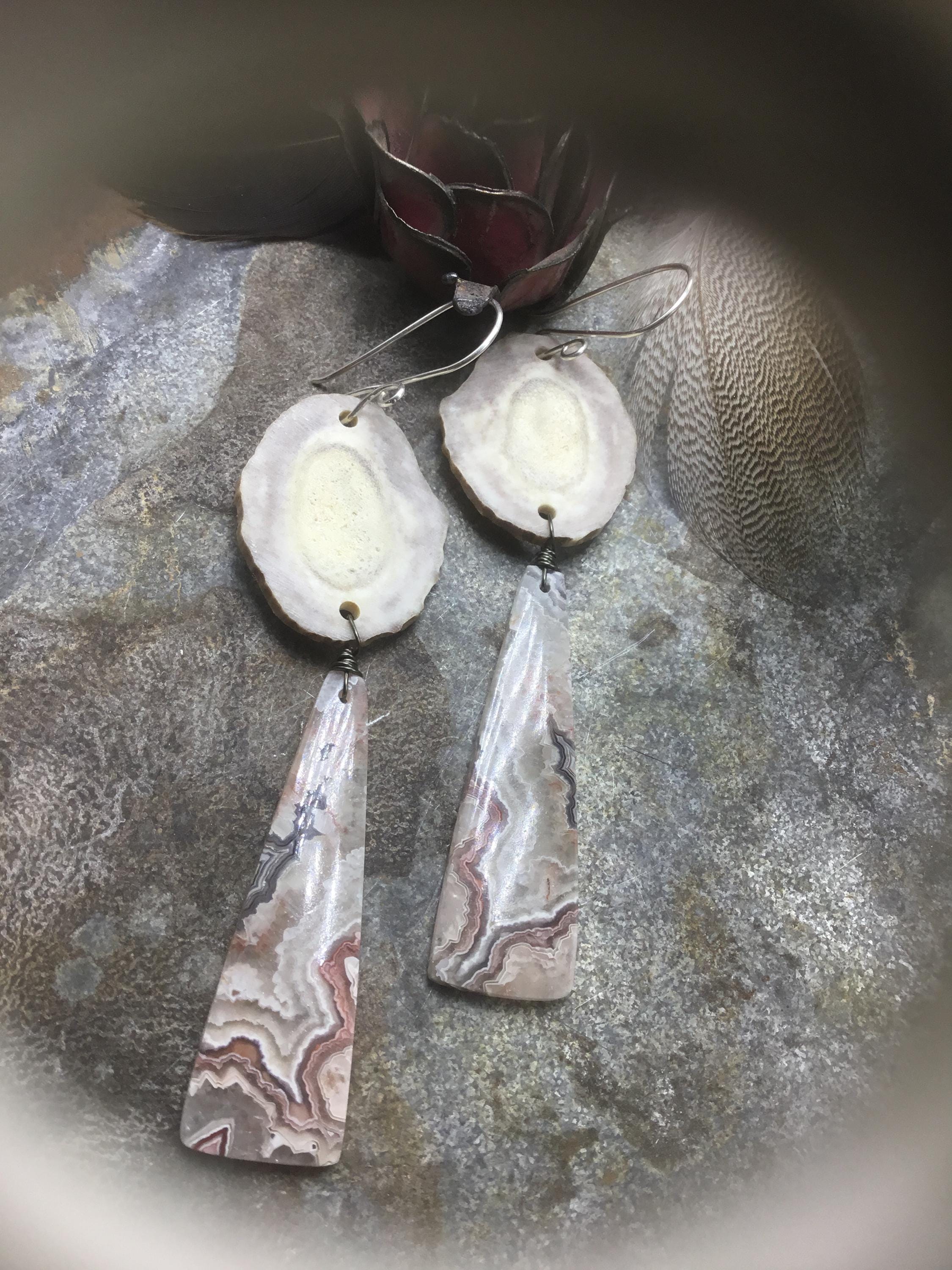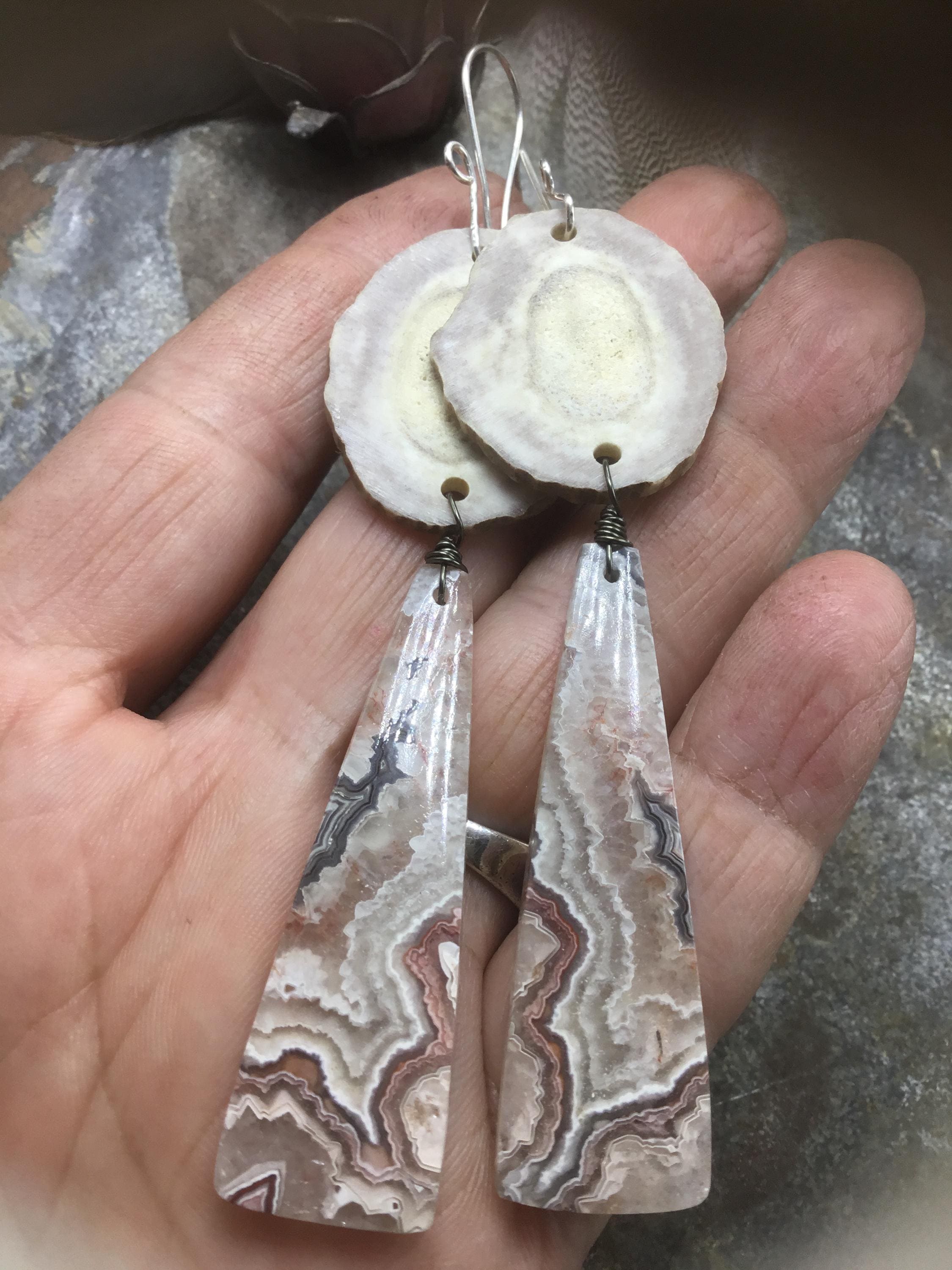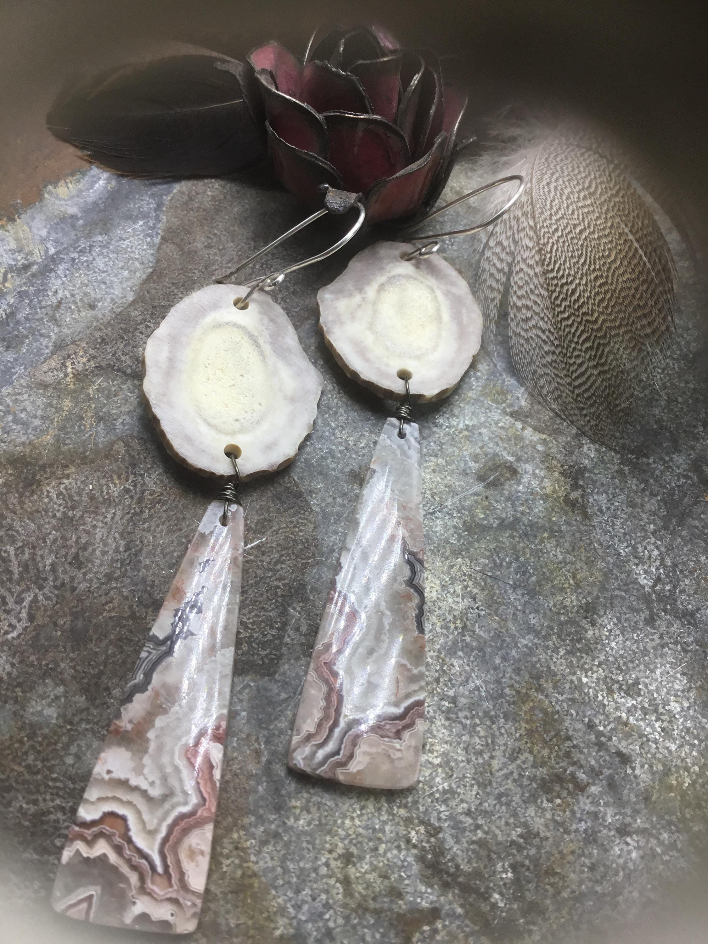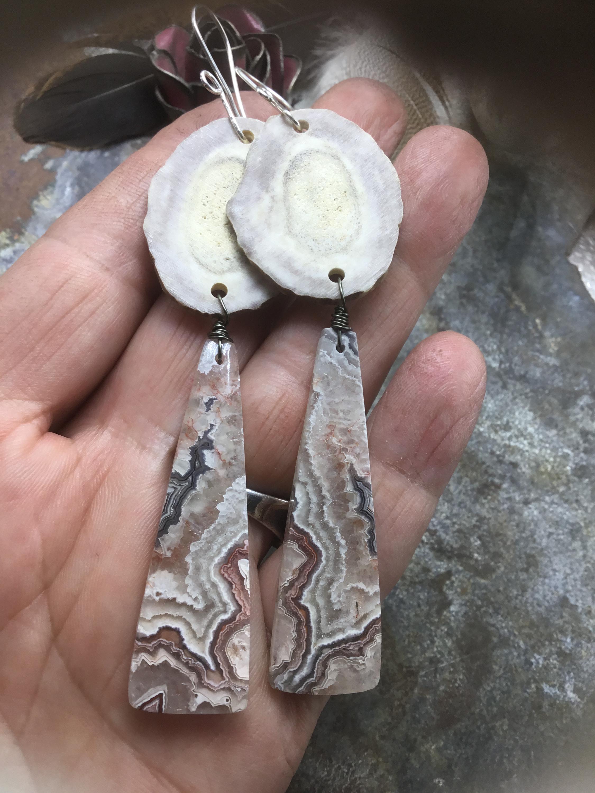 Large antler and crazy lace agate earrings by Weathered Soul