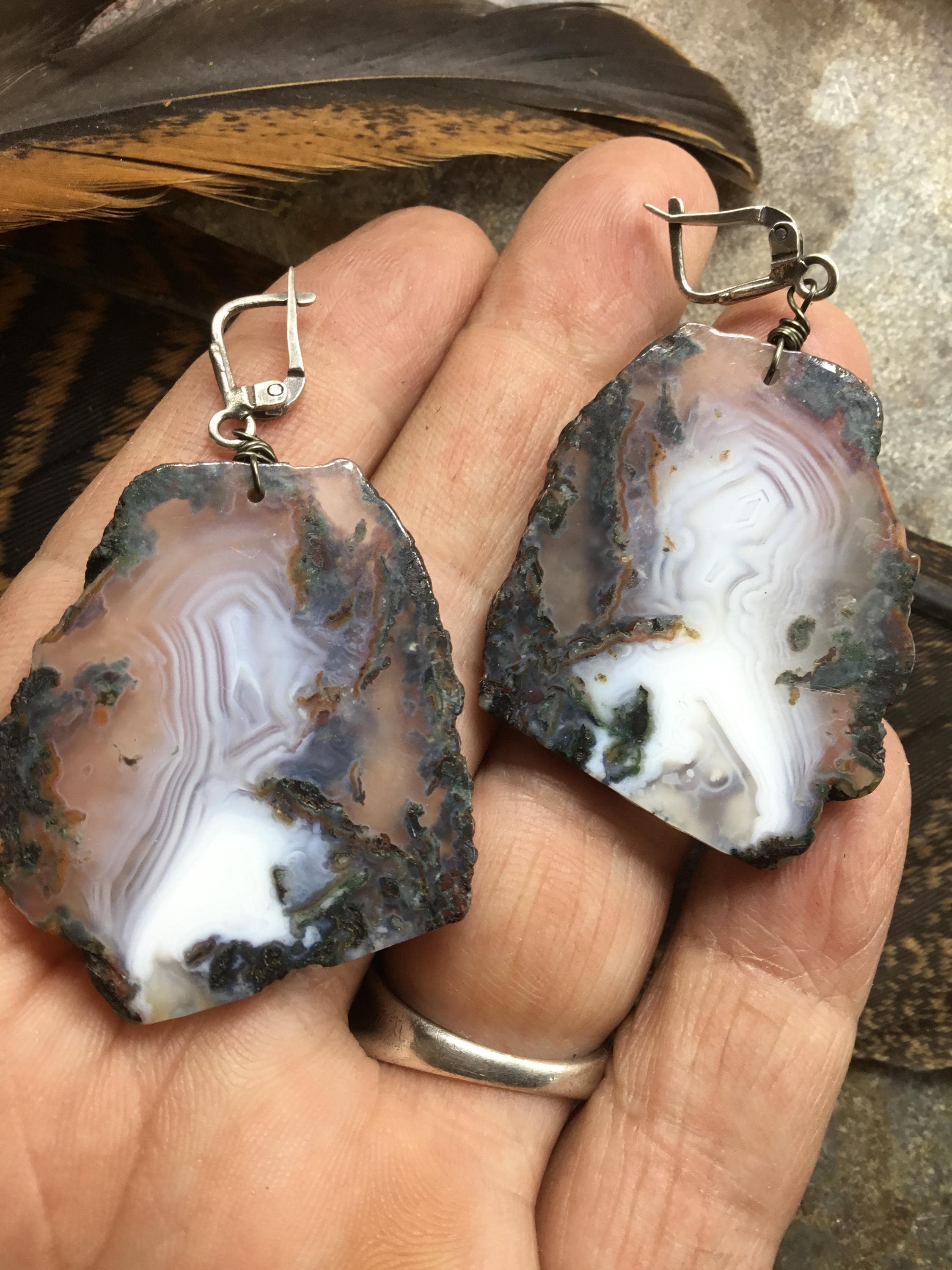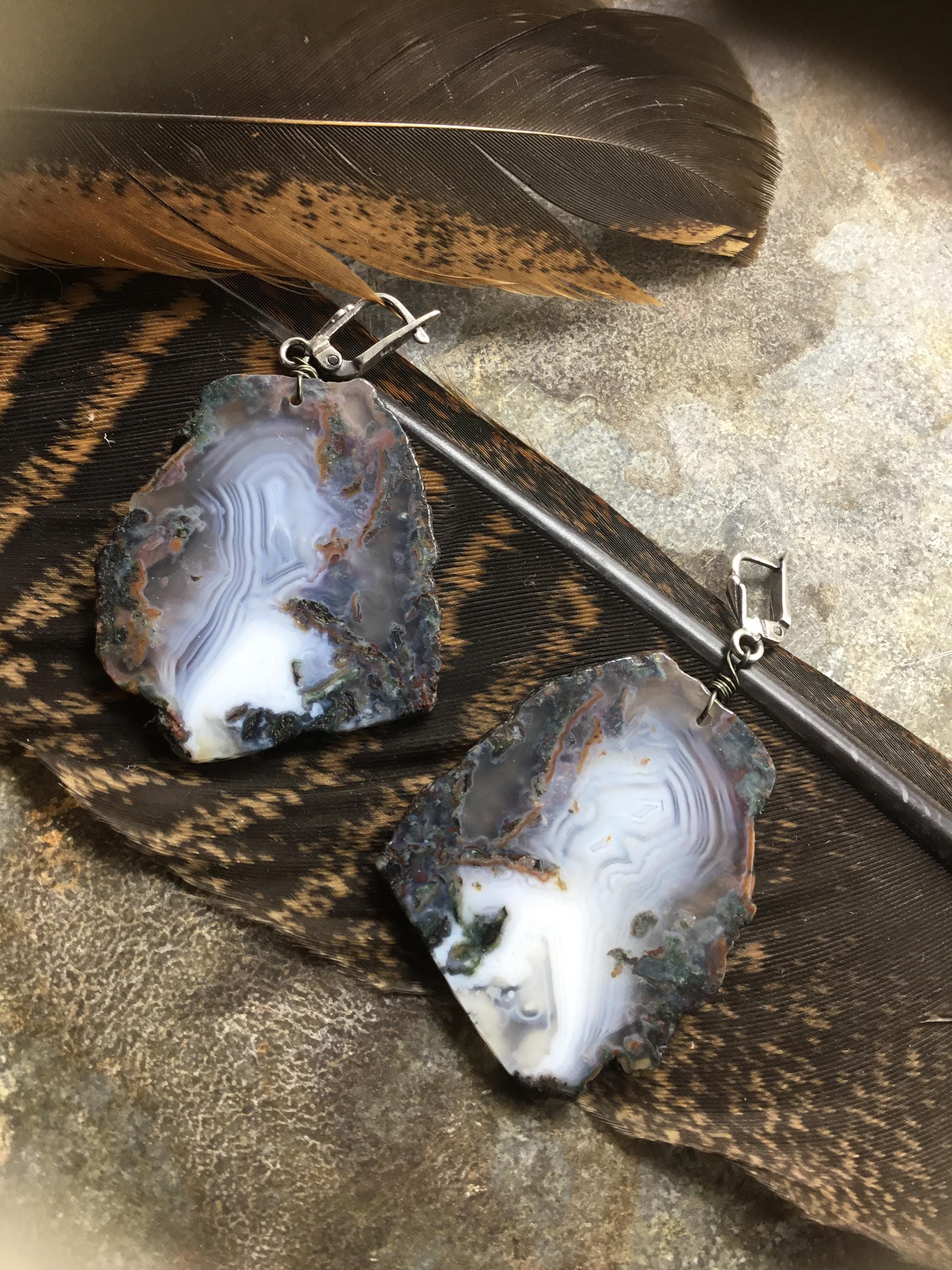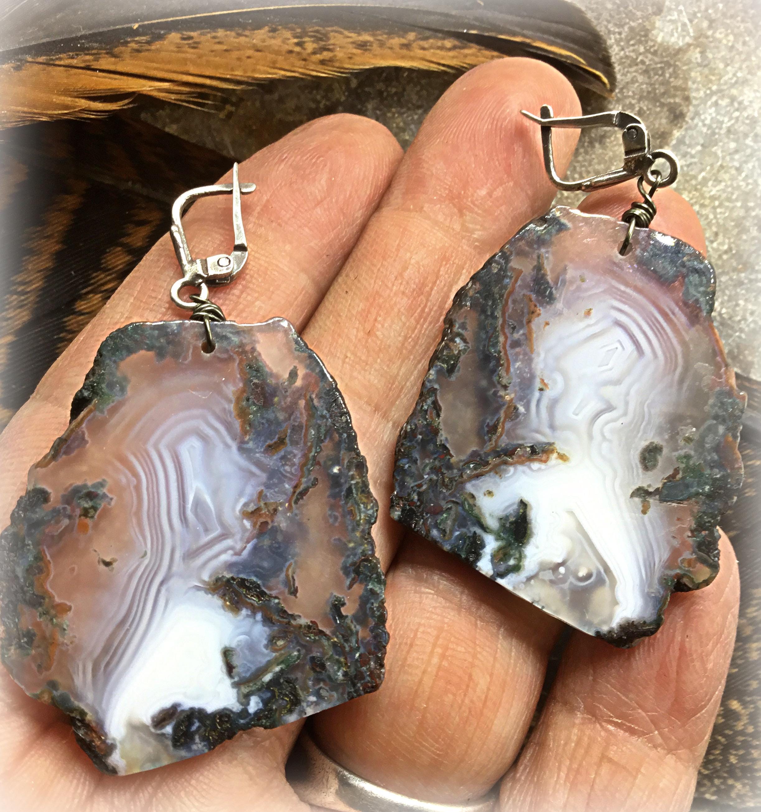 Huge agate slab stunning earrings with beautiful tones of Fall colors in these slabs by Weathered Soul,sterling artisan French clips
