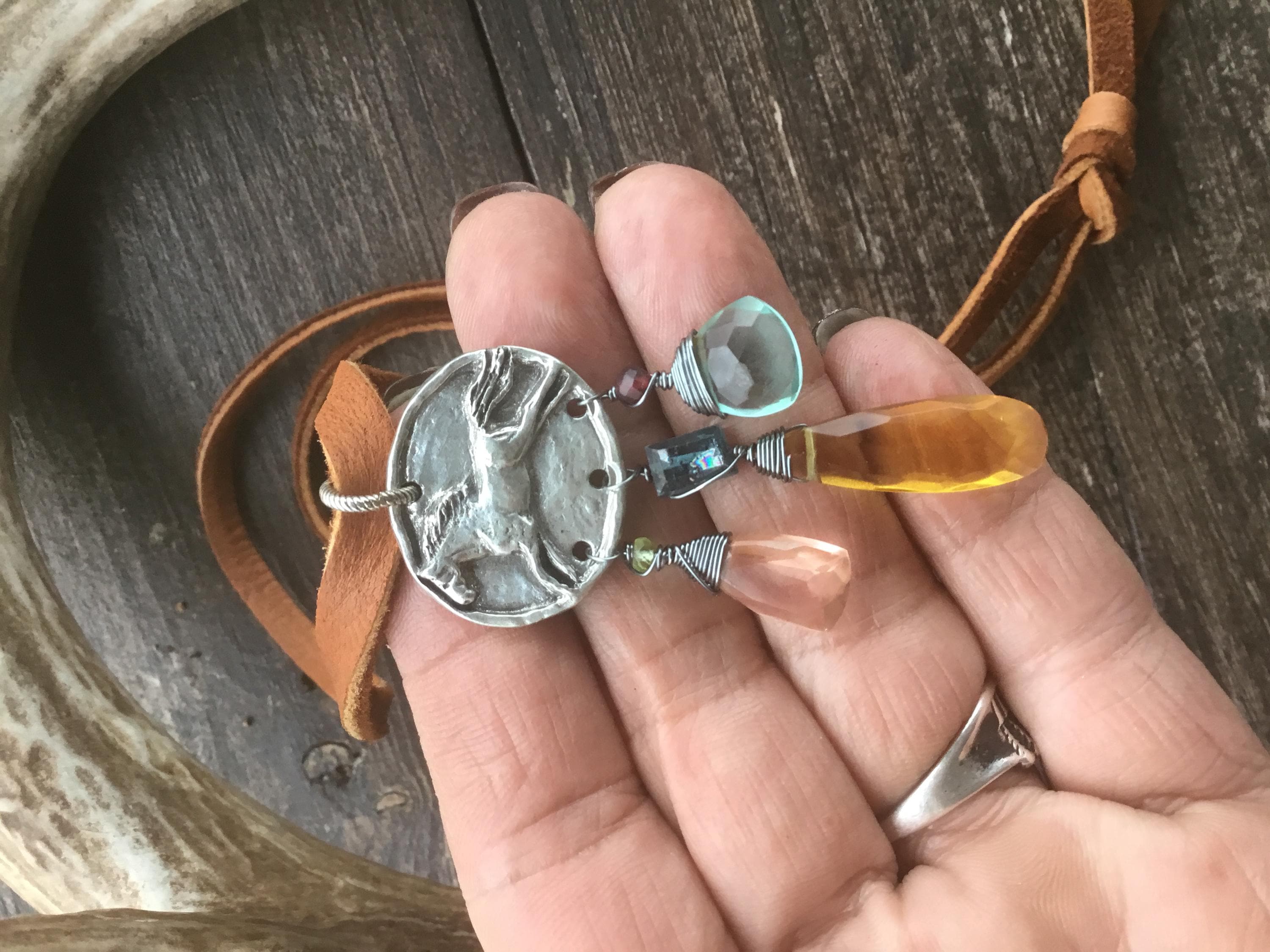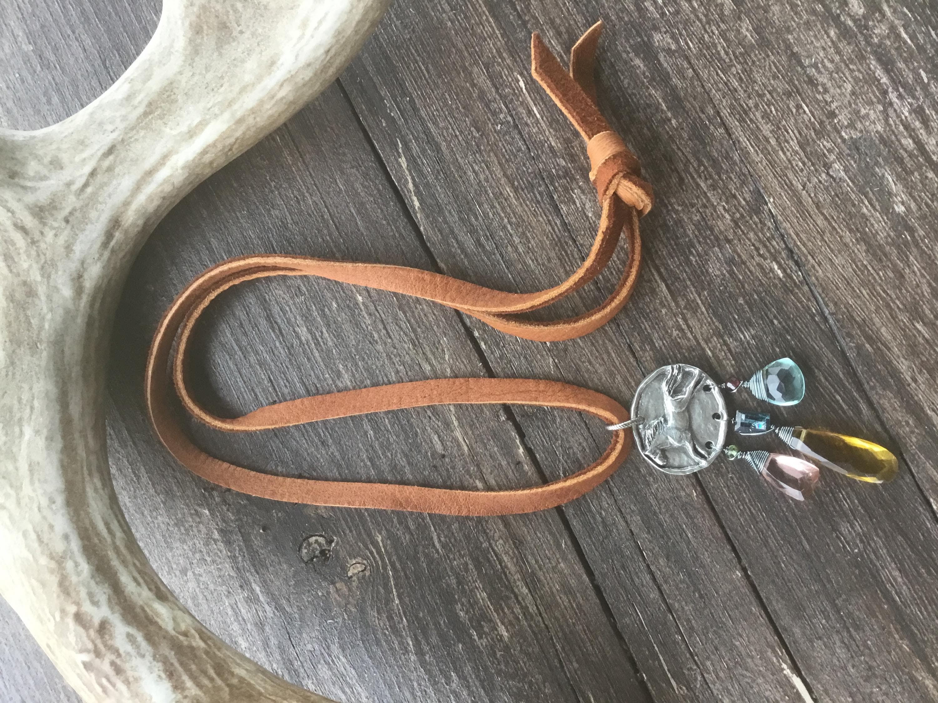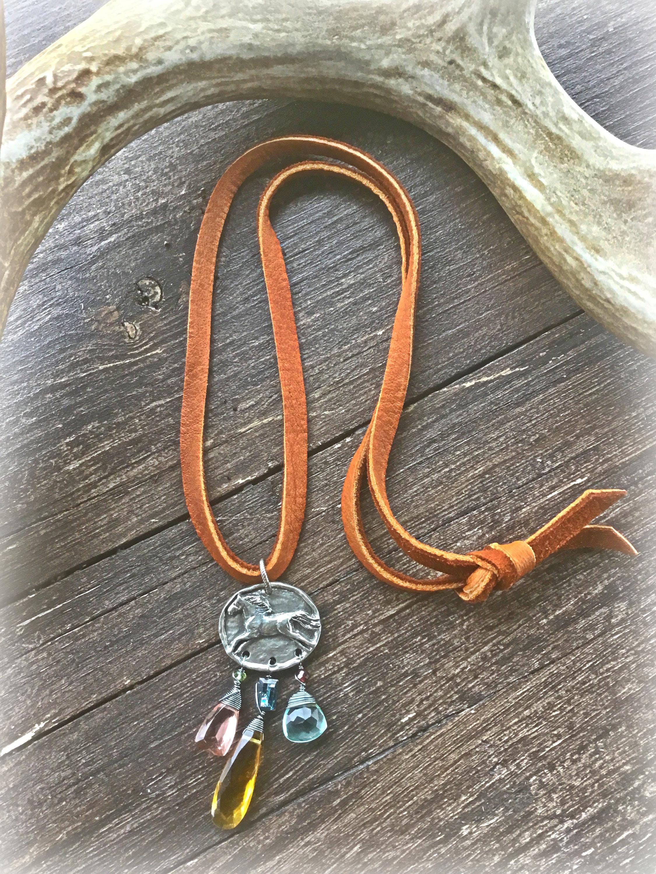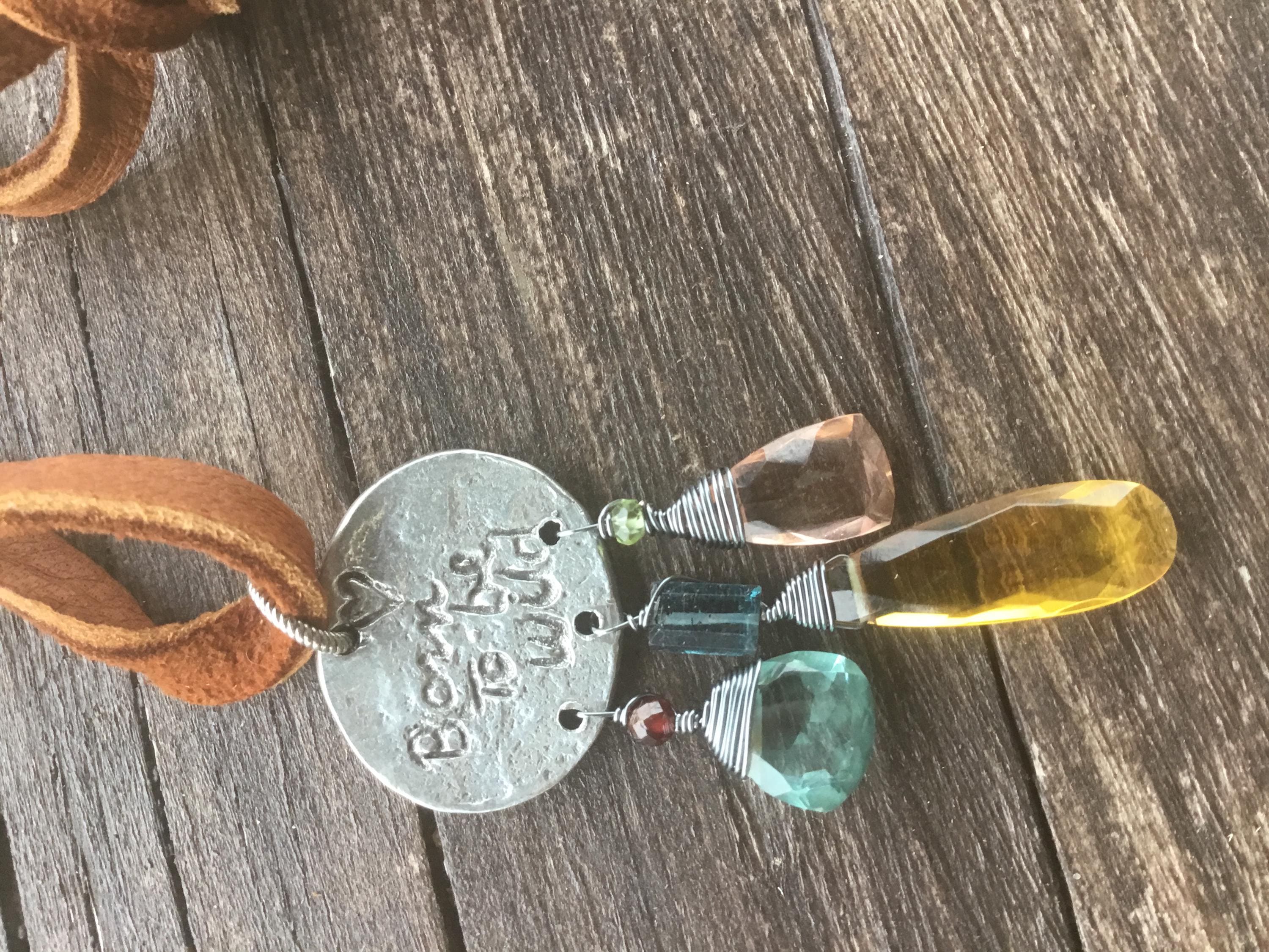 Born to be wild necklace by Weathered Soul jewelry for the horse lover!Elk leather and gemstones galore! Back of necklace reads Born to be Wild! Easy over the head styling with a fancy rustic vibe! Topaz, Kyanite,Citrine, Peridot, and quartz.