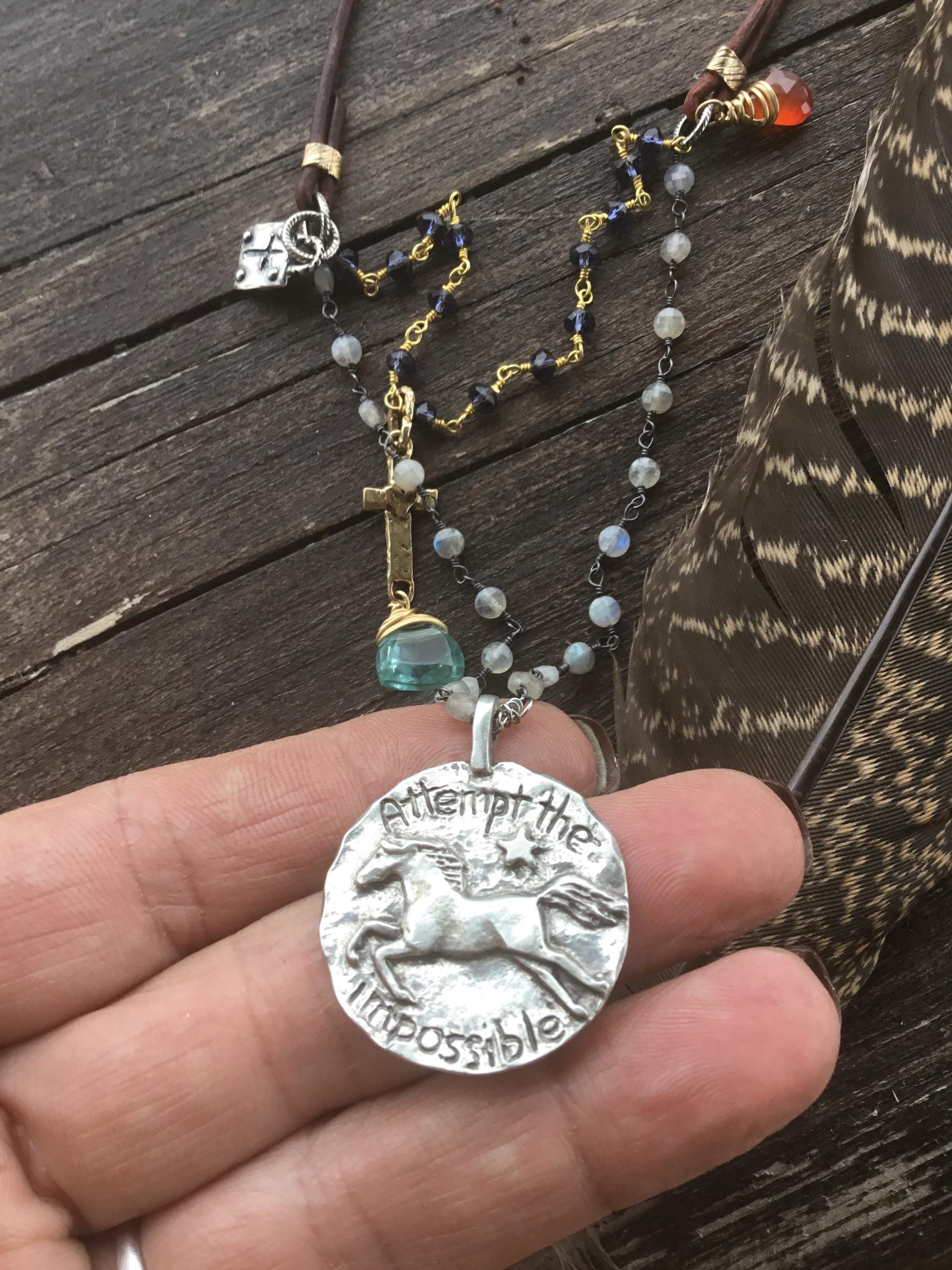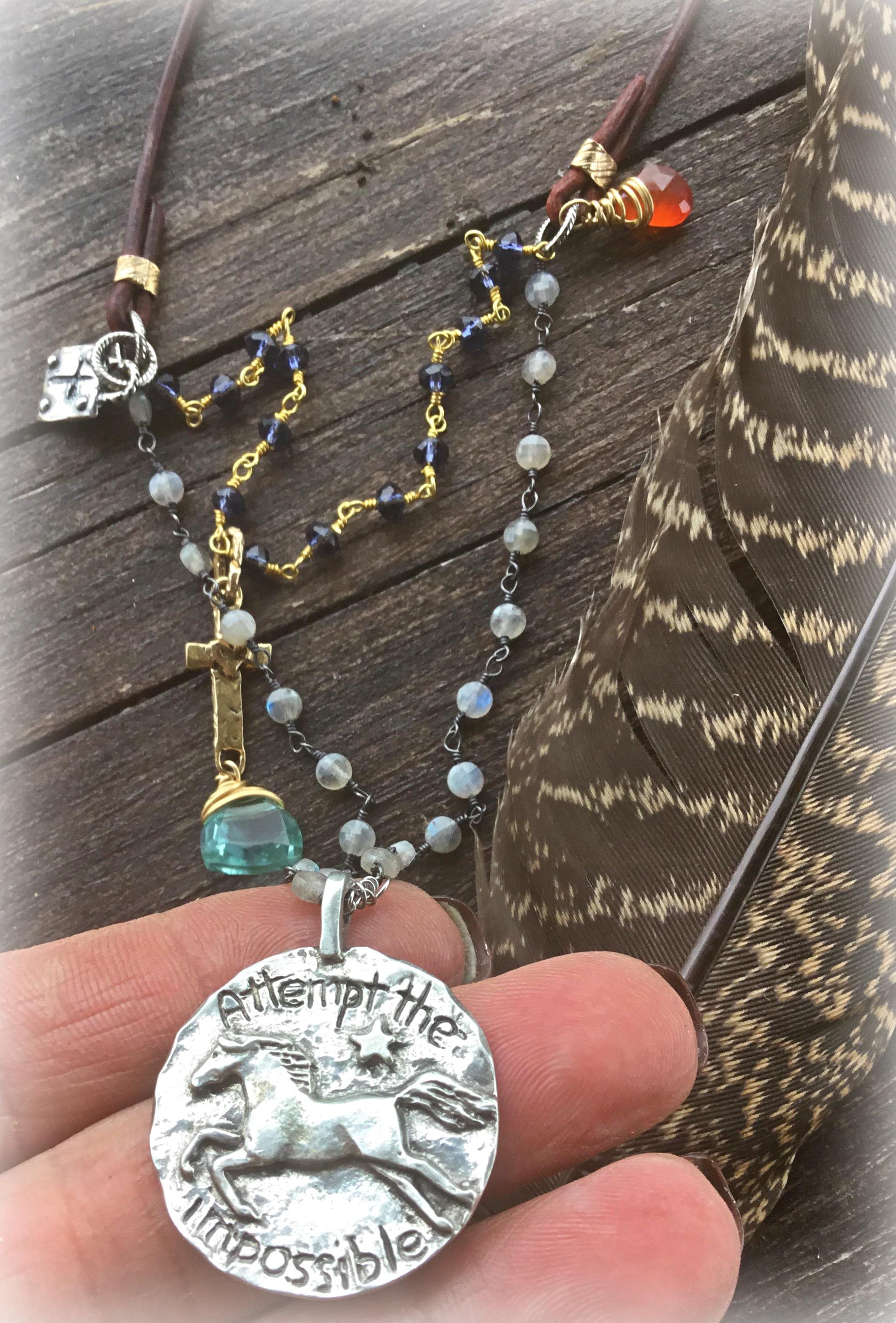 Attempt the impossible necklace by Weathered Soul with happy jumping pony and jewels! Vintage silver and turquoise button closure with leather,labradorite and sapphire! This necklace is full of details with wire wrapped bronze topaz on sweet little cross charm. Carnelian wire wrapped off chain, keep looking you’ll find more!