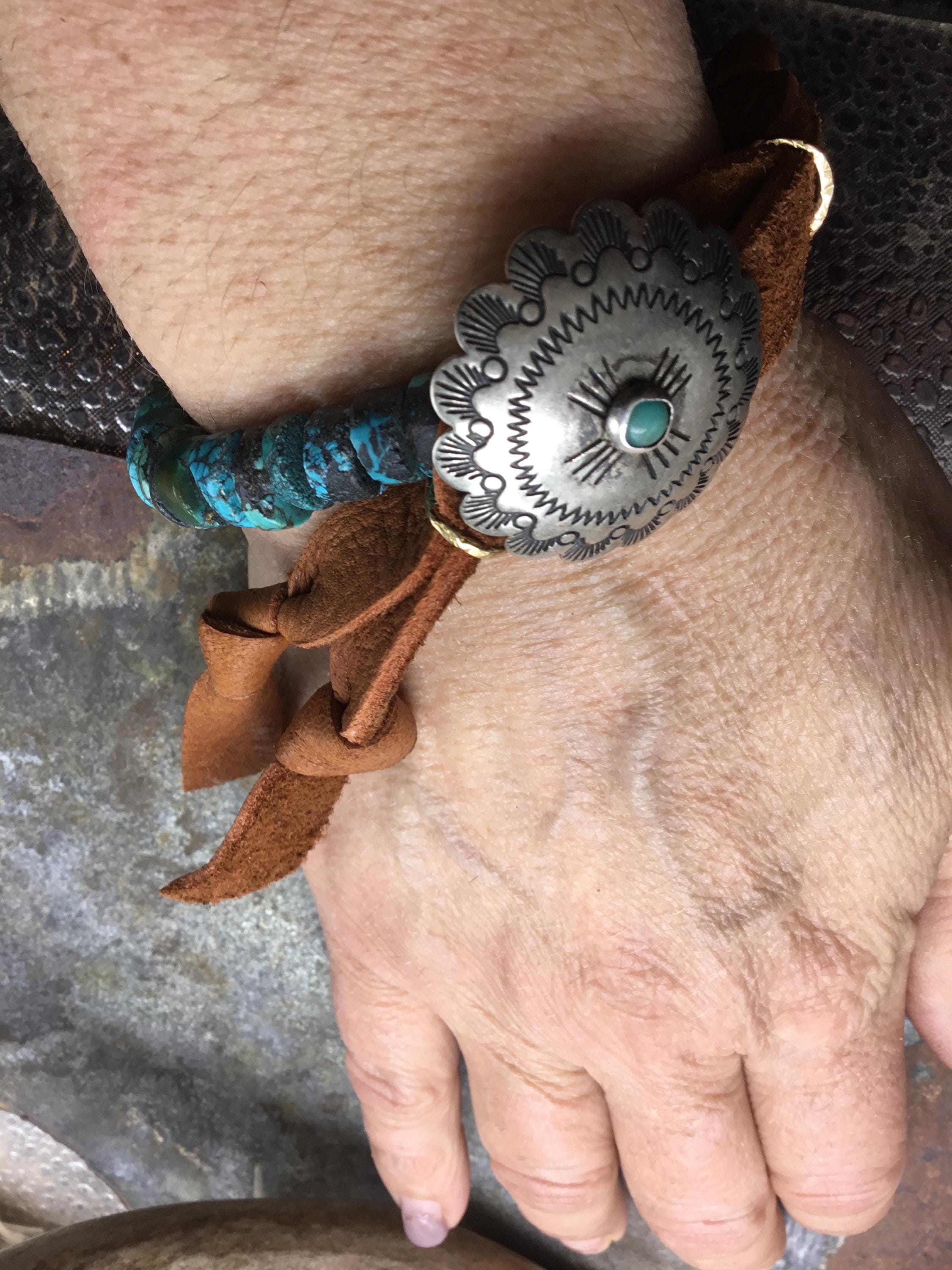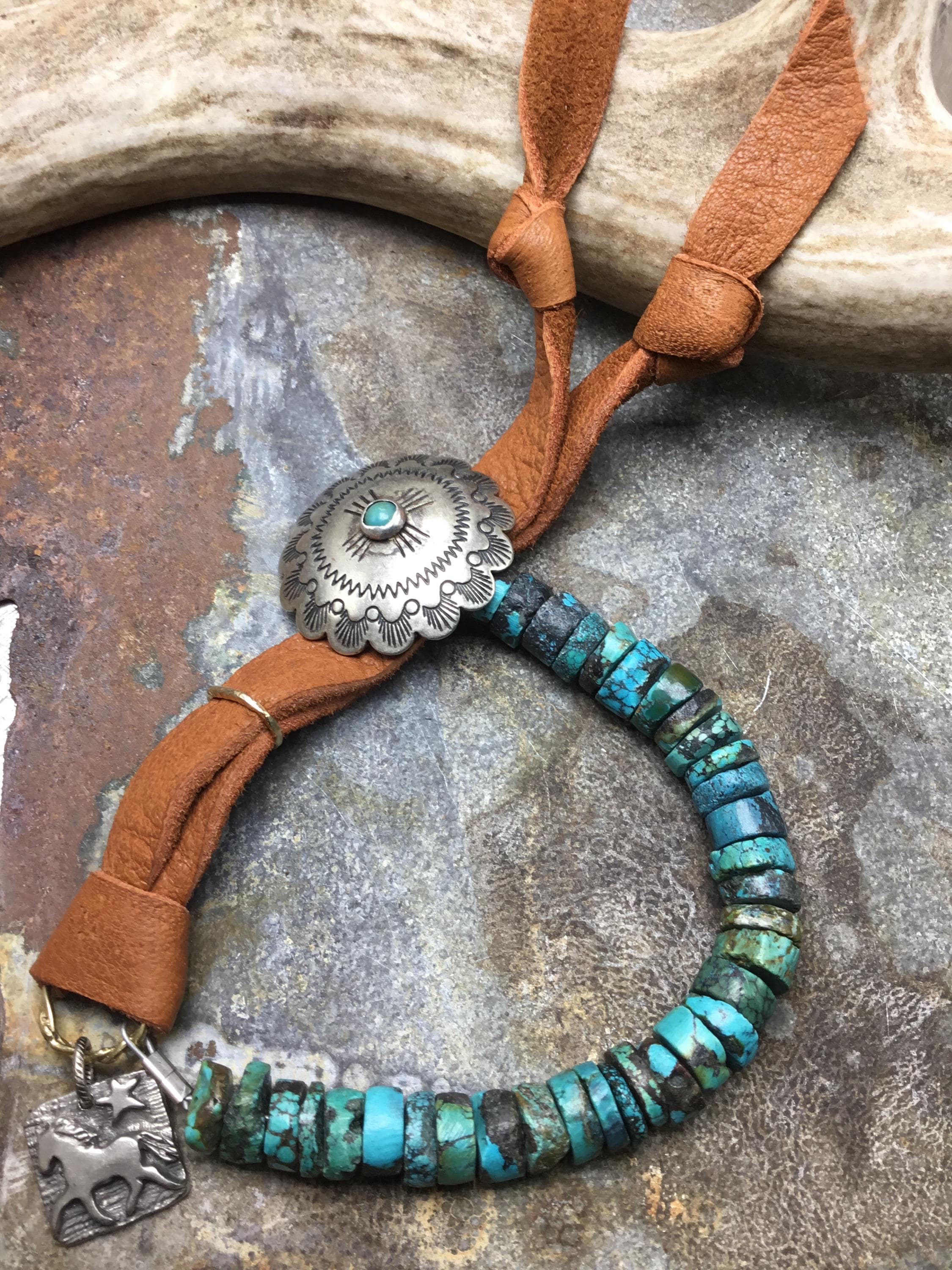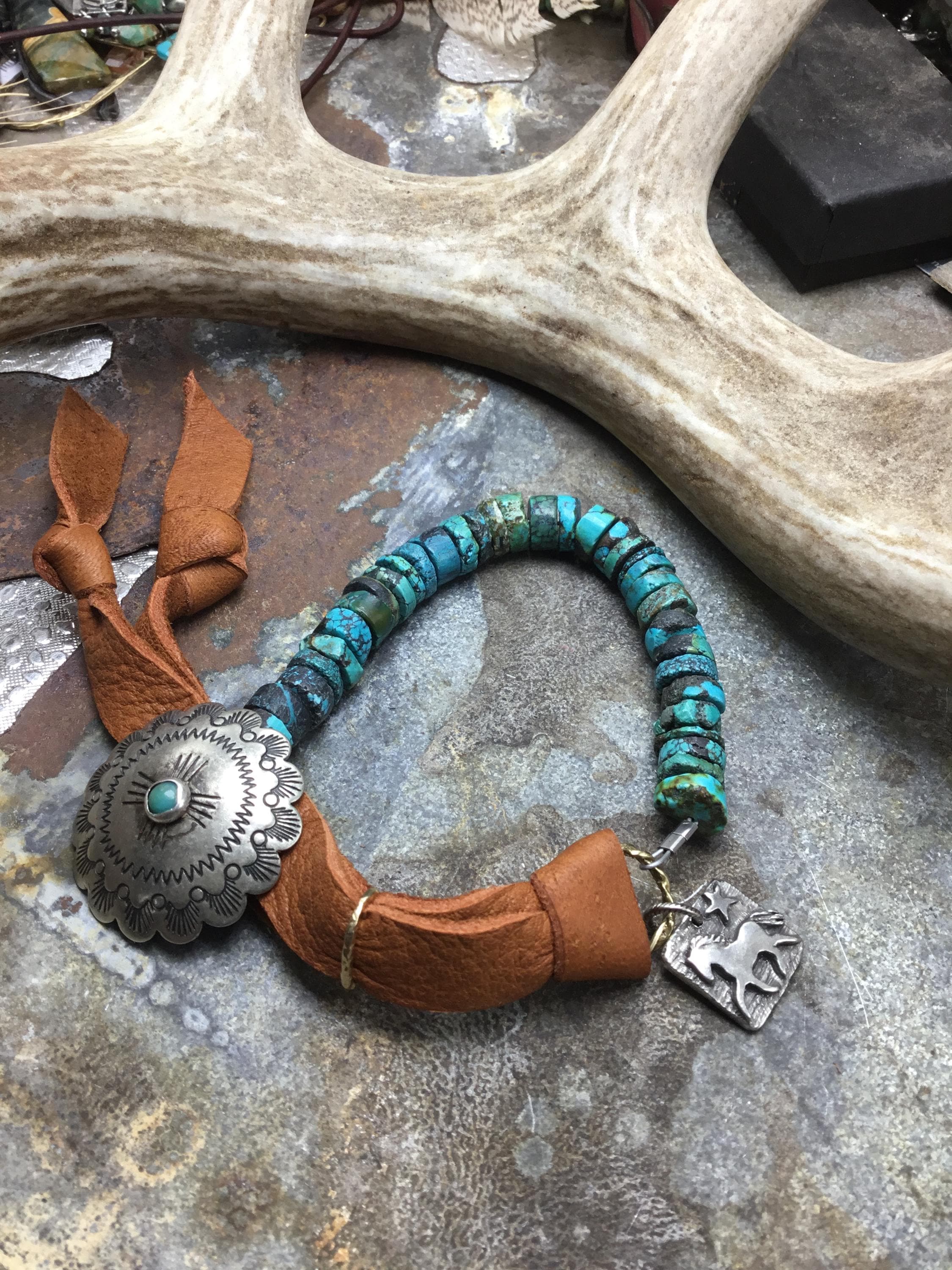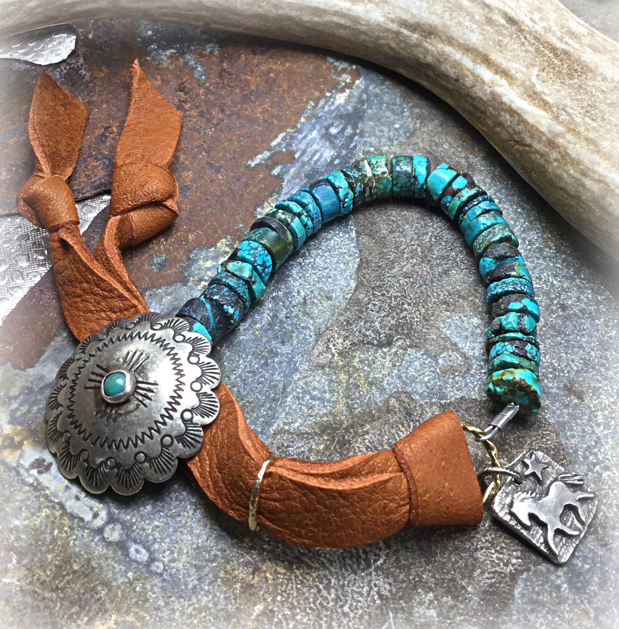 Genuine rustic turquoise with concho button closure with elk leather and pony charm by Weathered Soul
