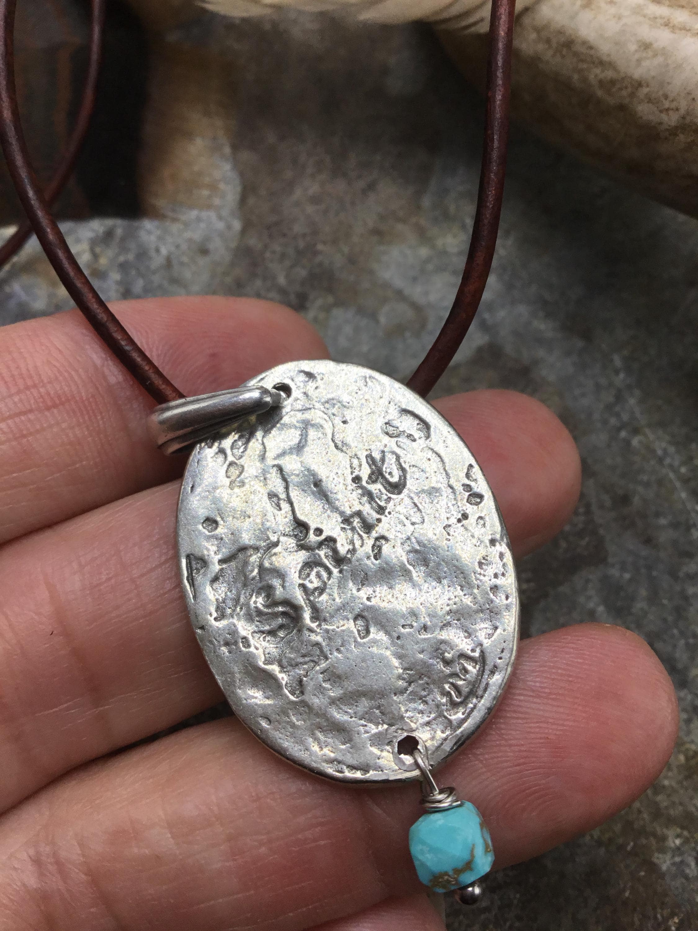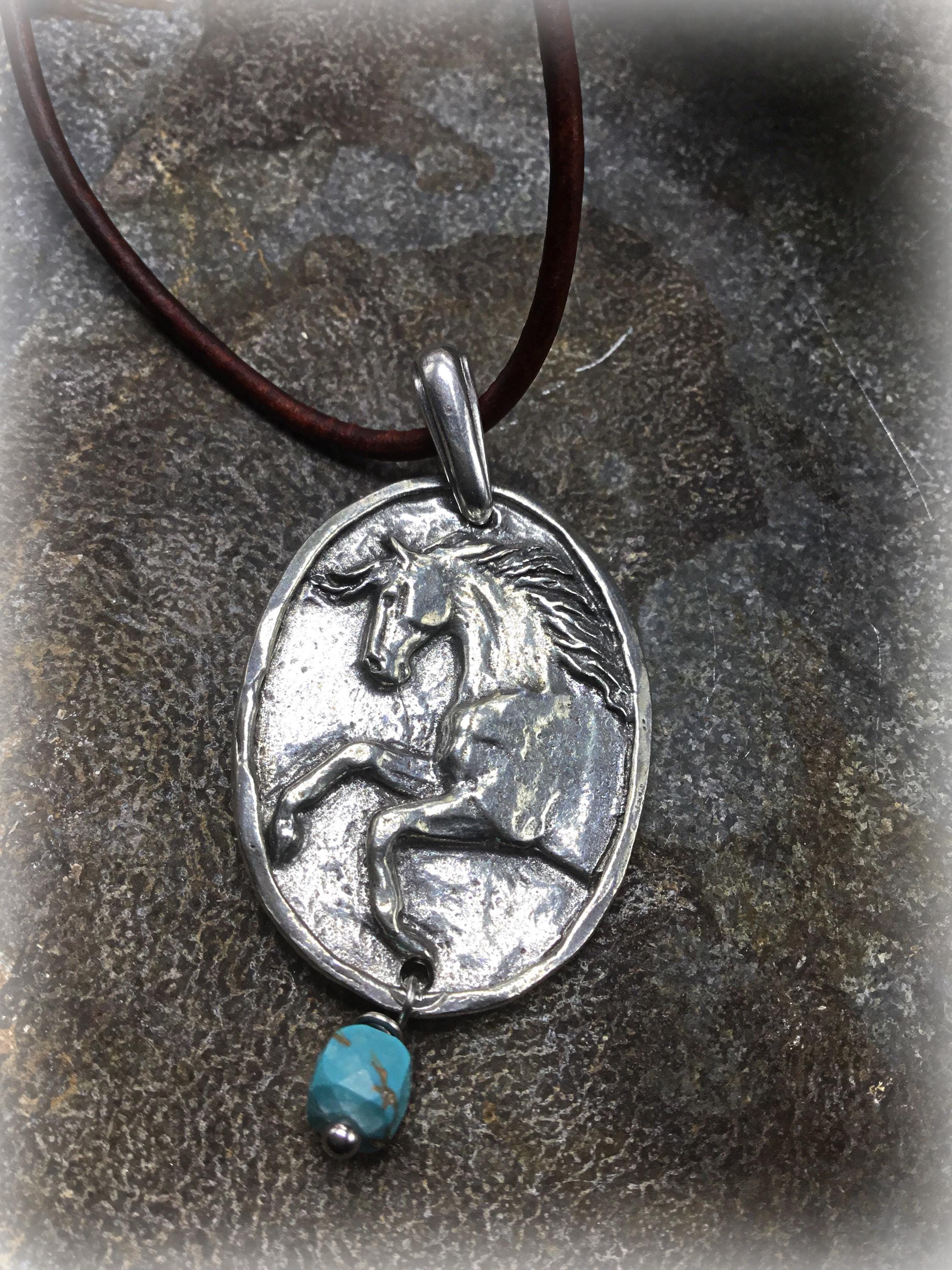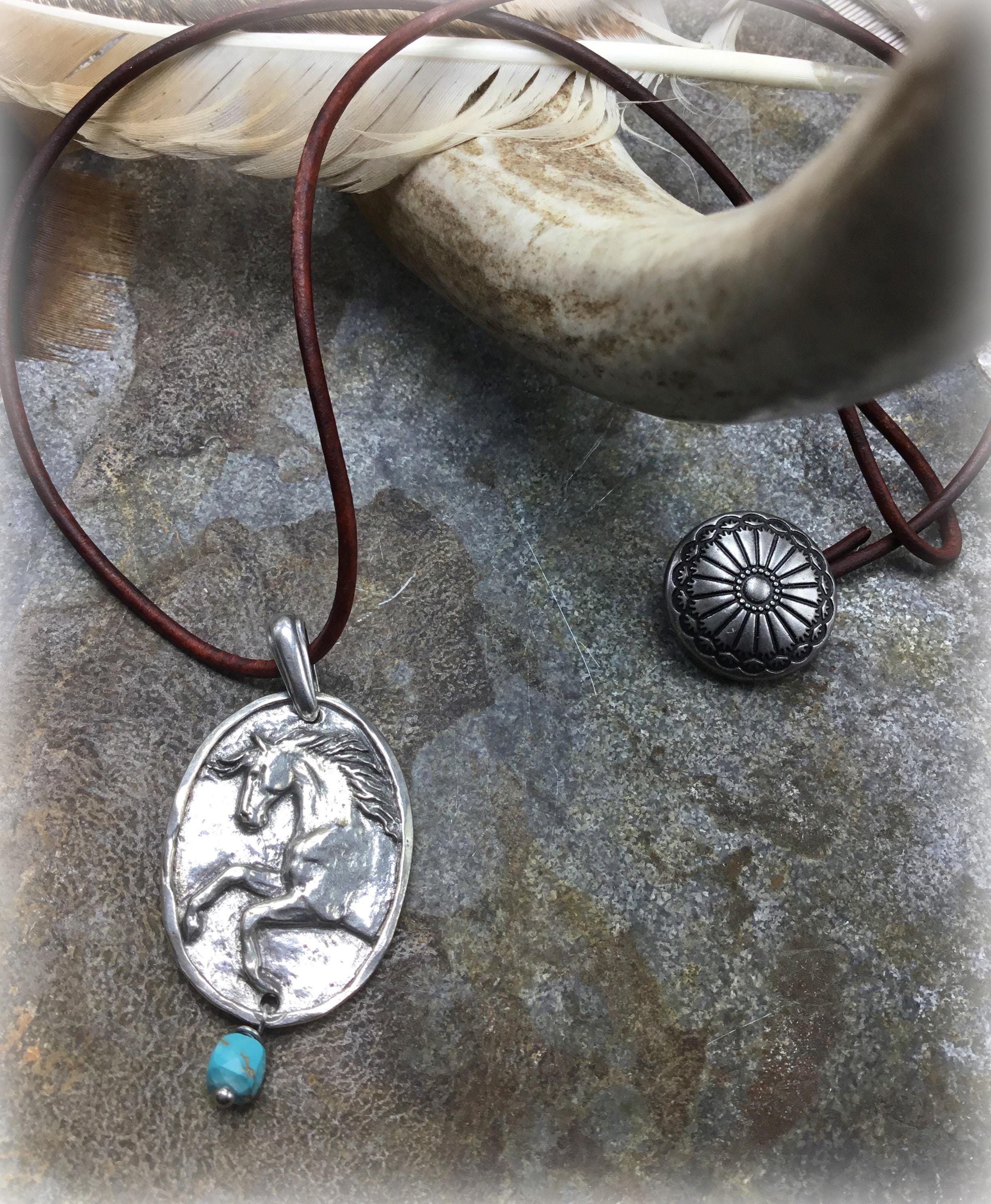 Spirit pony on leather Greek cord with button and loop closure and dainty touch of turquoise drop by Weathered Soul jewelry. Approximately 19” long