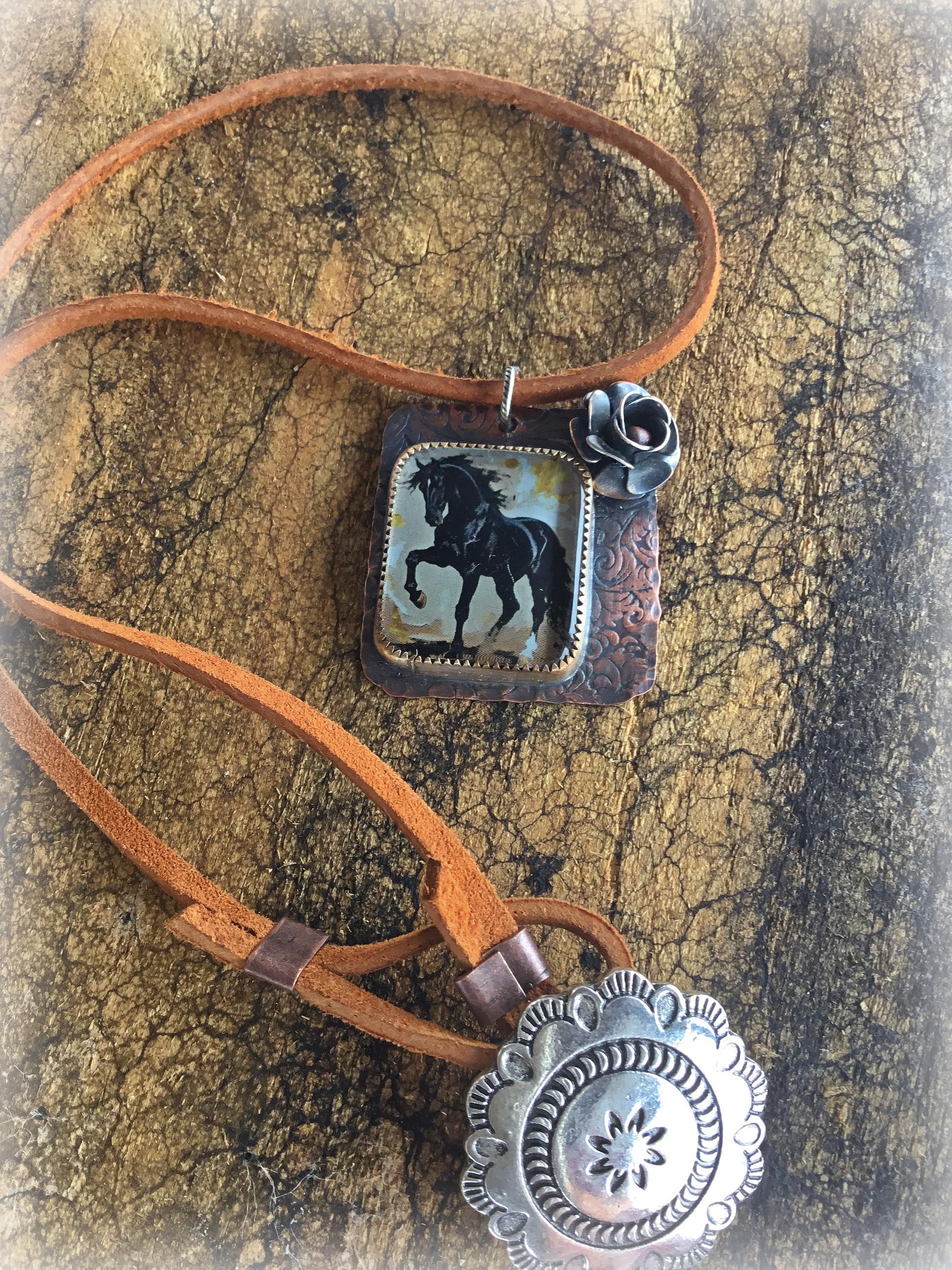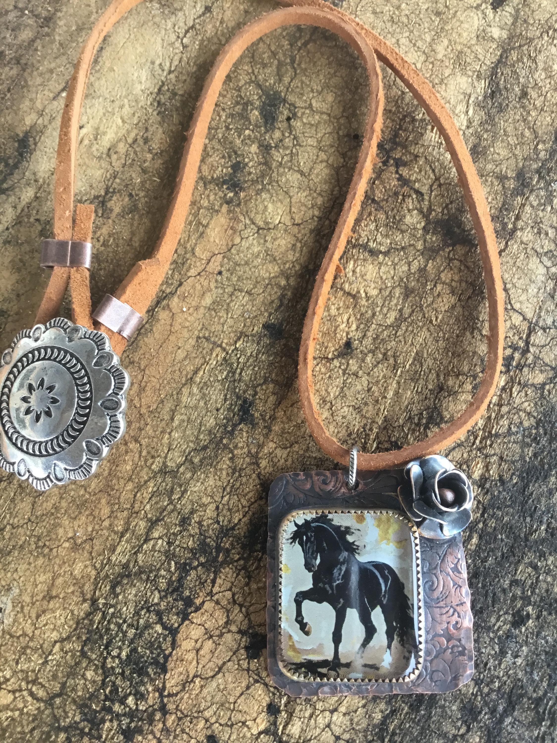 Black Beauty prancing pony necklace on leather with concho button closure by Weathered Soul jewelry. Approximately 19” long. Horse lovers dream jewelry! Oxidized tooled copper with silver rose.