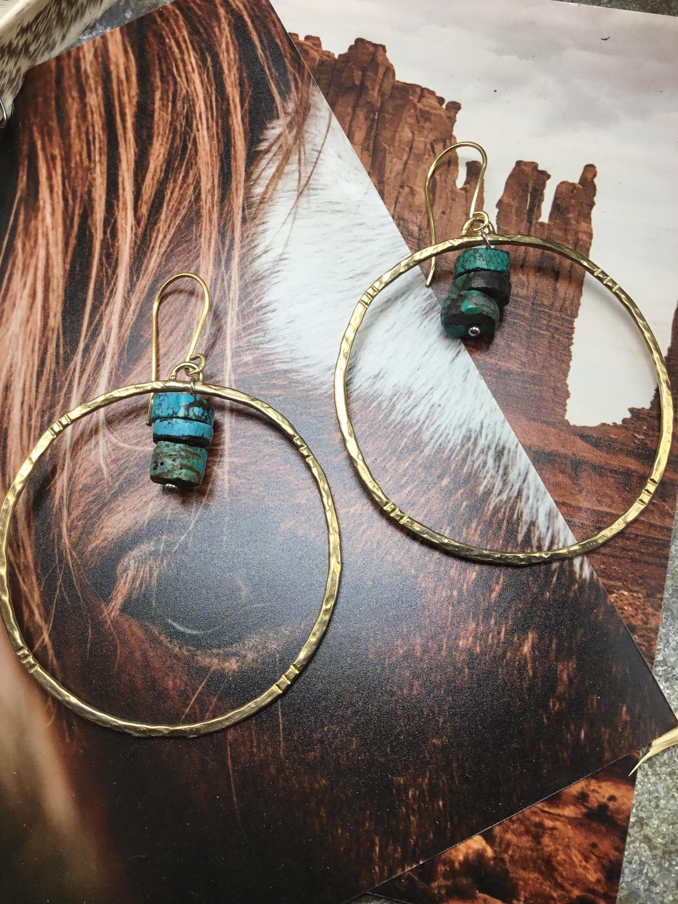 Very large textured bronze hoops with rustic turquoise drops from center in a modern Western style