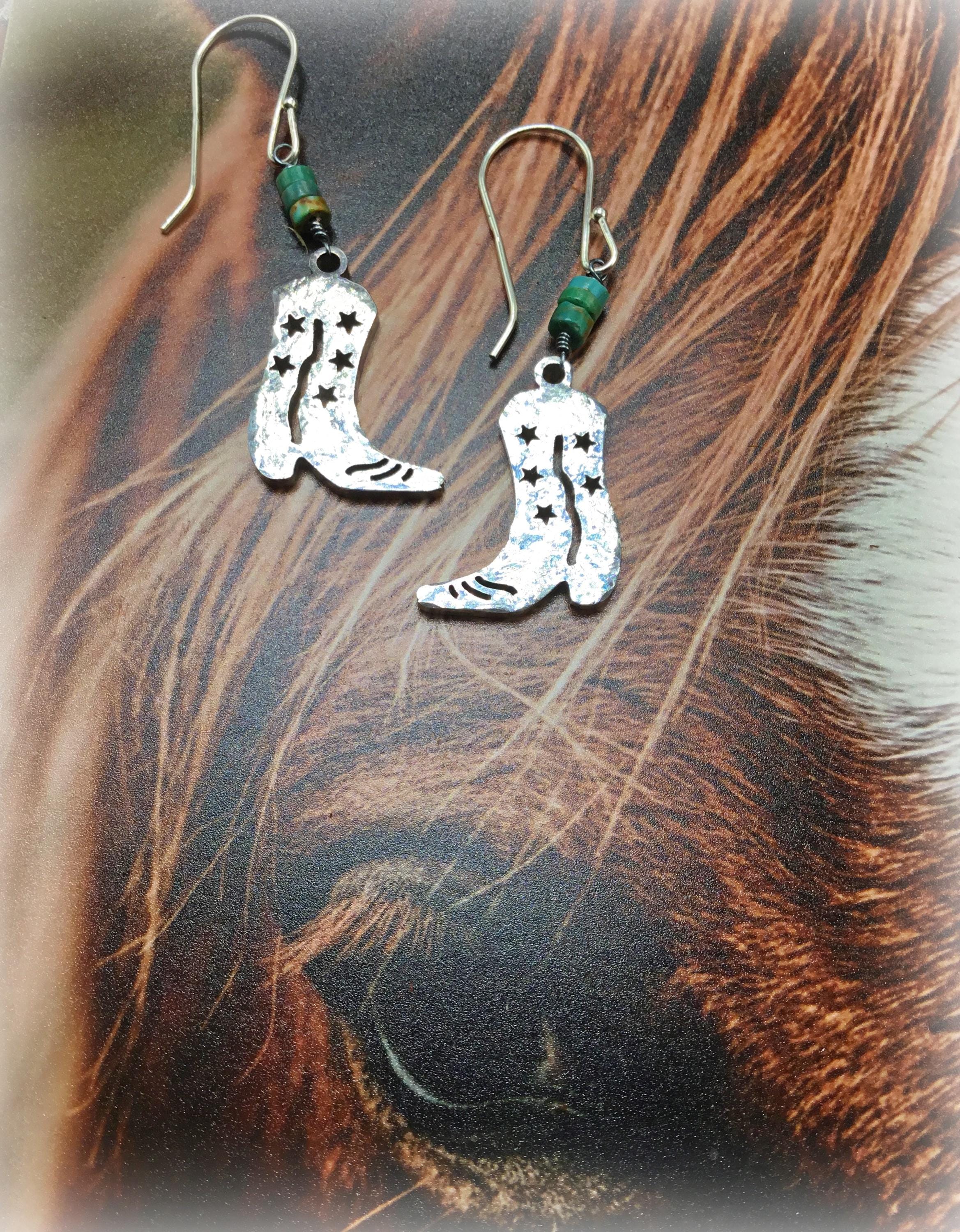 It’s alright to be itty bitty! Little hammered star cut out cowboy boots with sterling ear wires and turquoise. Approximately 1” long not including ear wires by Weathered Soul jewelry.