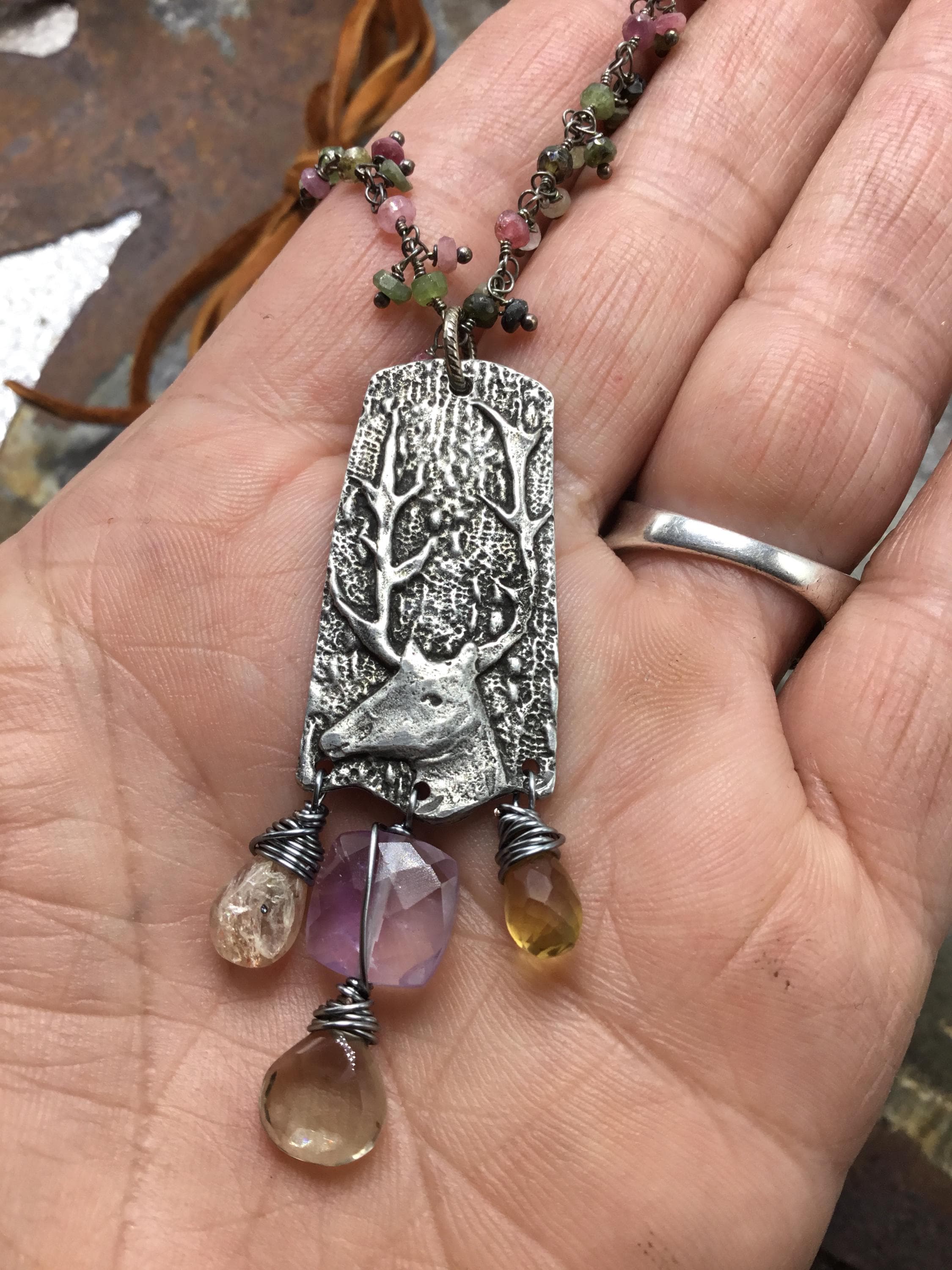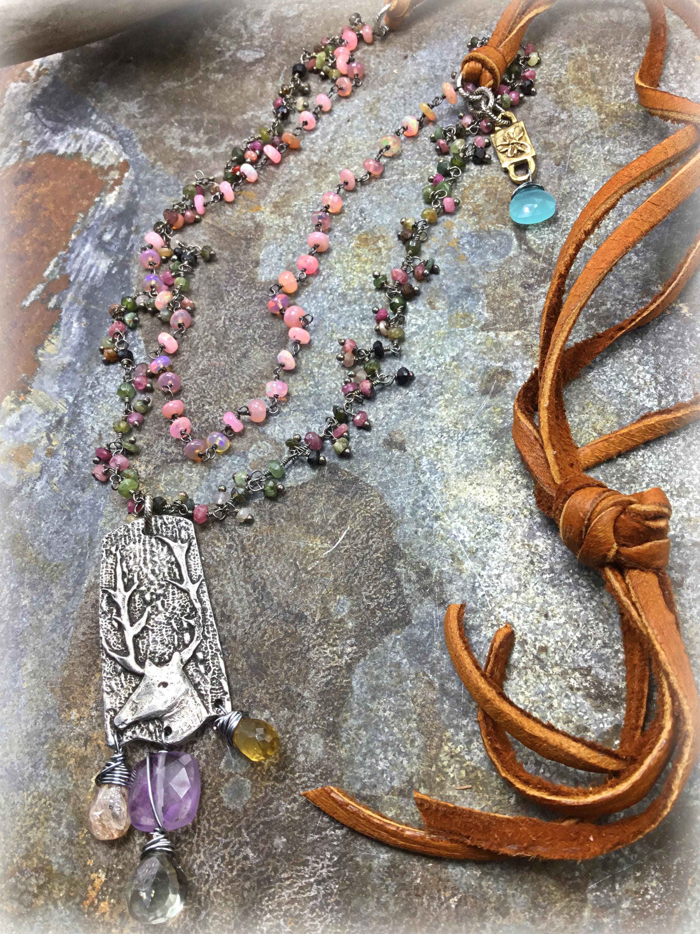 Spring fling buck necklace by Weathered Soul Jewelry with pink opal and tourmaline with detail galore! Soft elk leather,easy over the head styling. Bottom drops are citrine,topaz,amethyst and sunstone! 18” drop length.