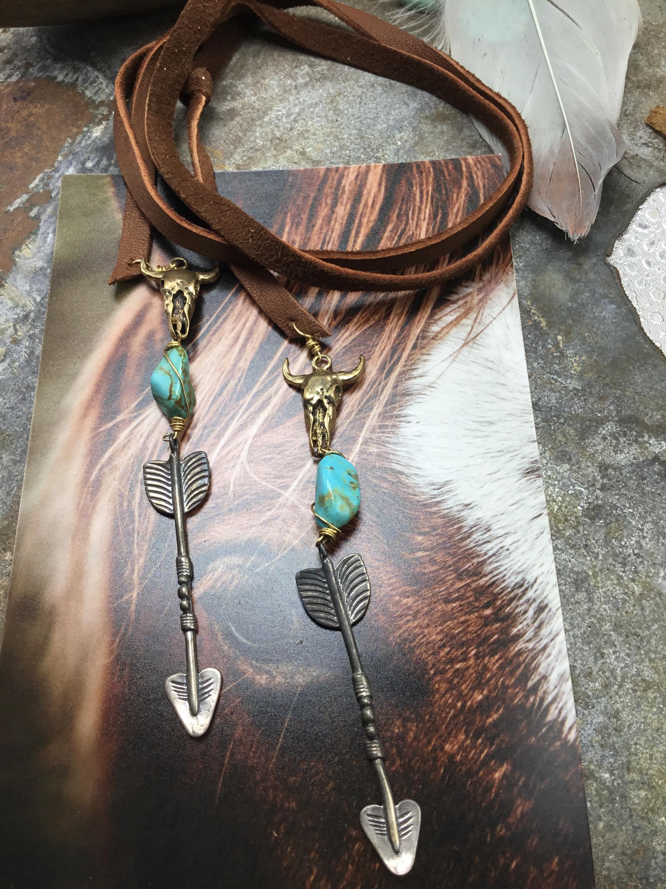 Simple long soft leather wrap around and tuck through style necklace by Weathered Soul. Bronze steer skulls,turquoise and large sterling arrows make a strong western impression. You can loop through and have one arrow drop lower than the other for a lariat style. Very fun, simple and versatile!