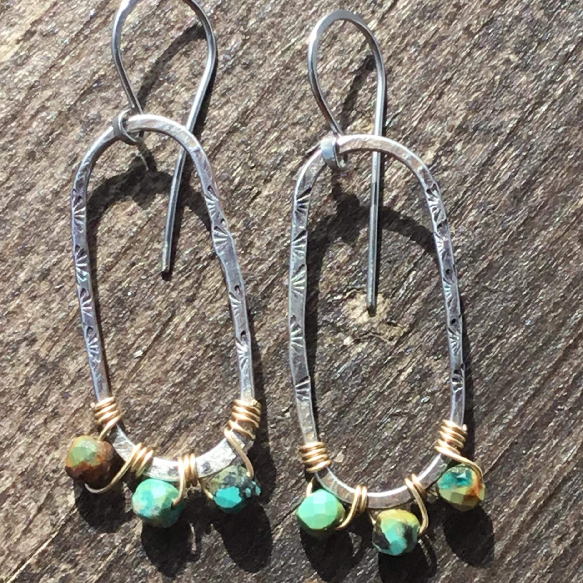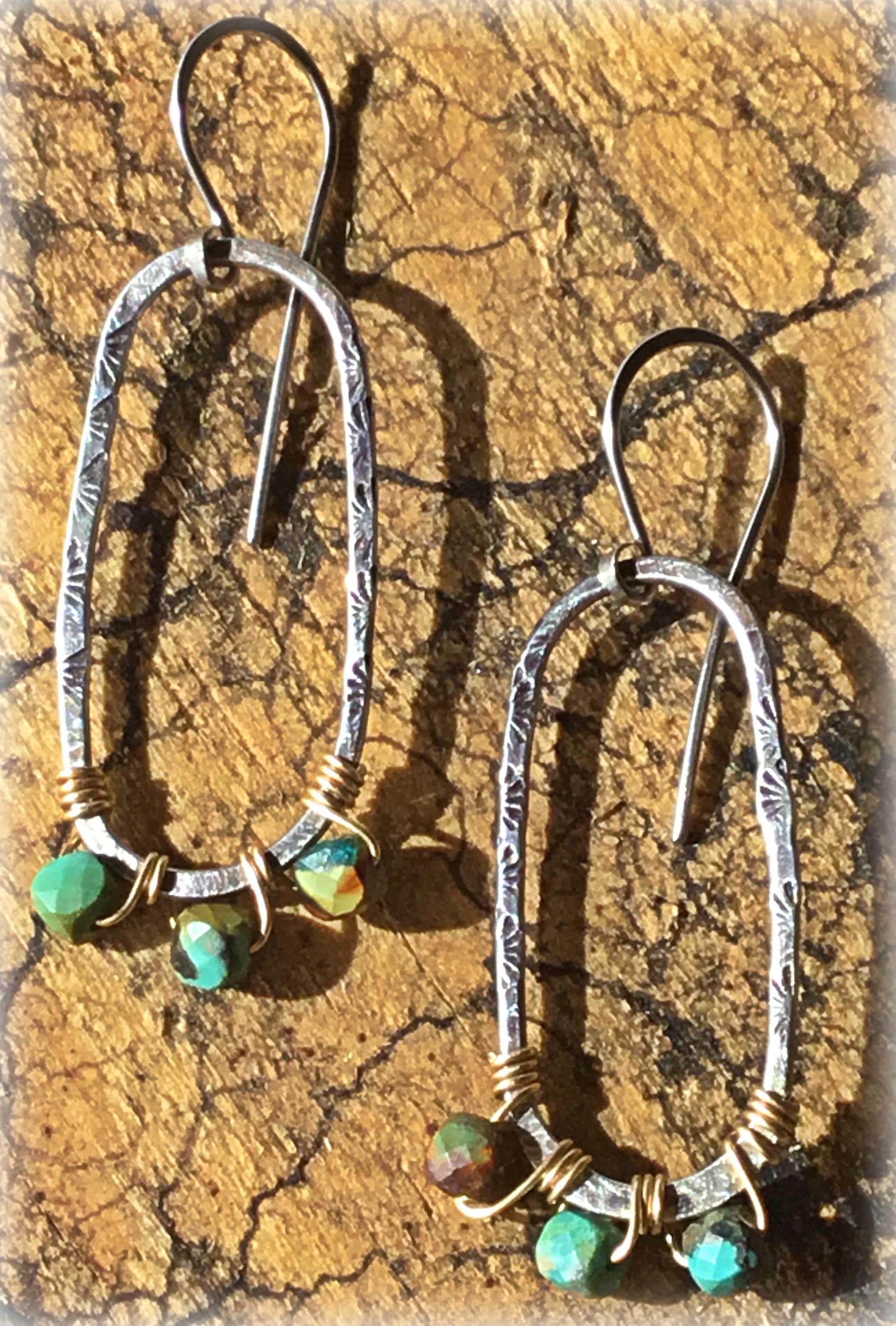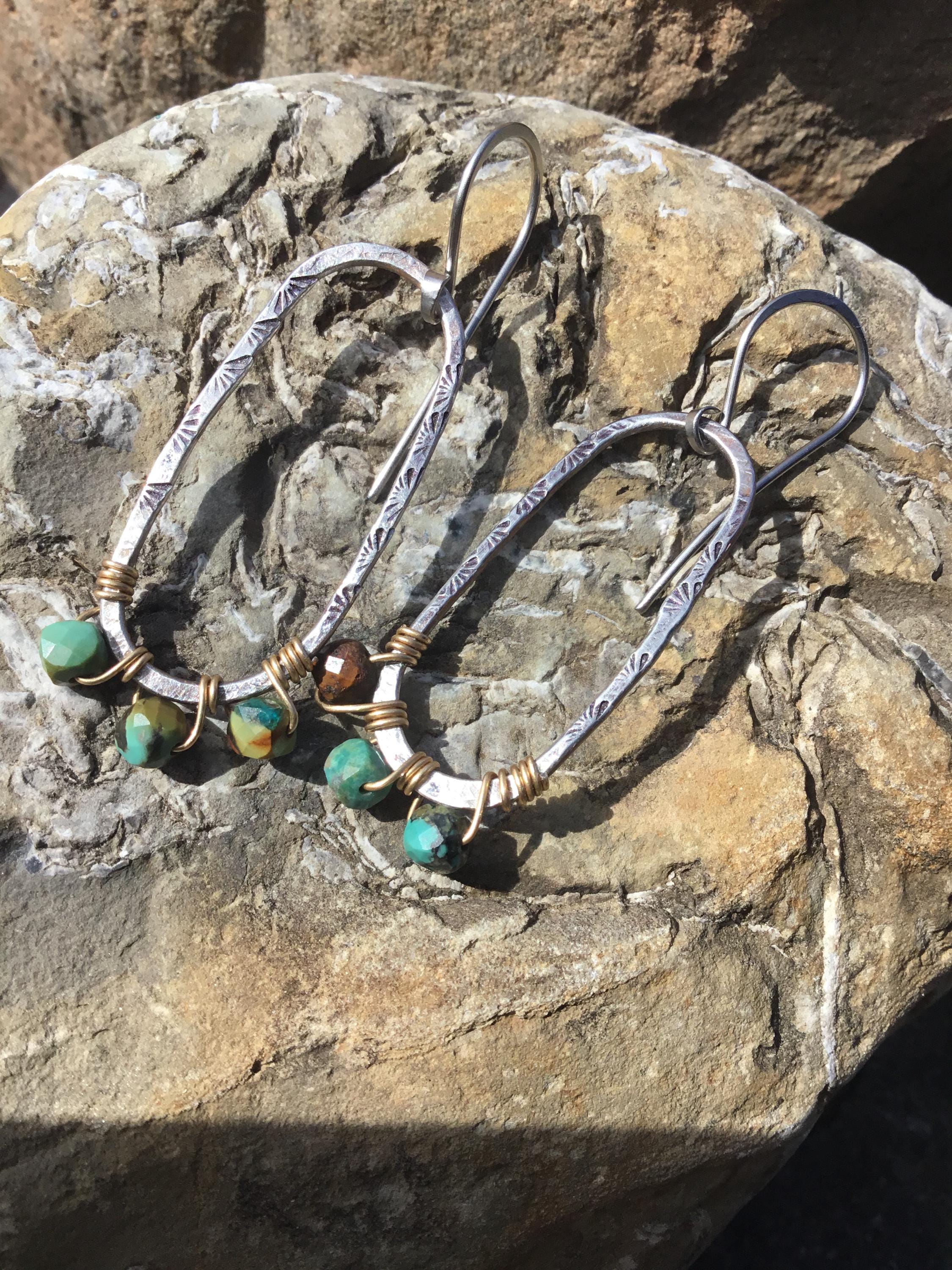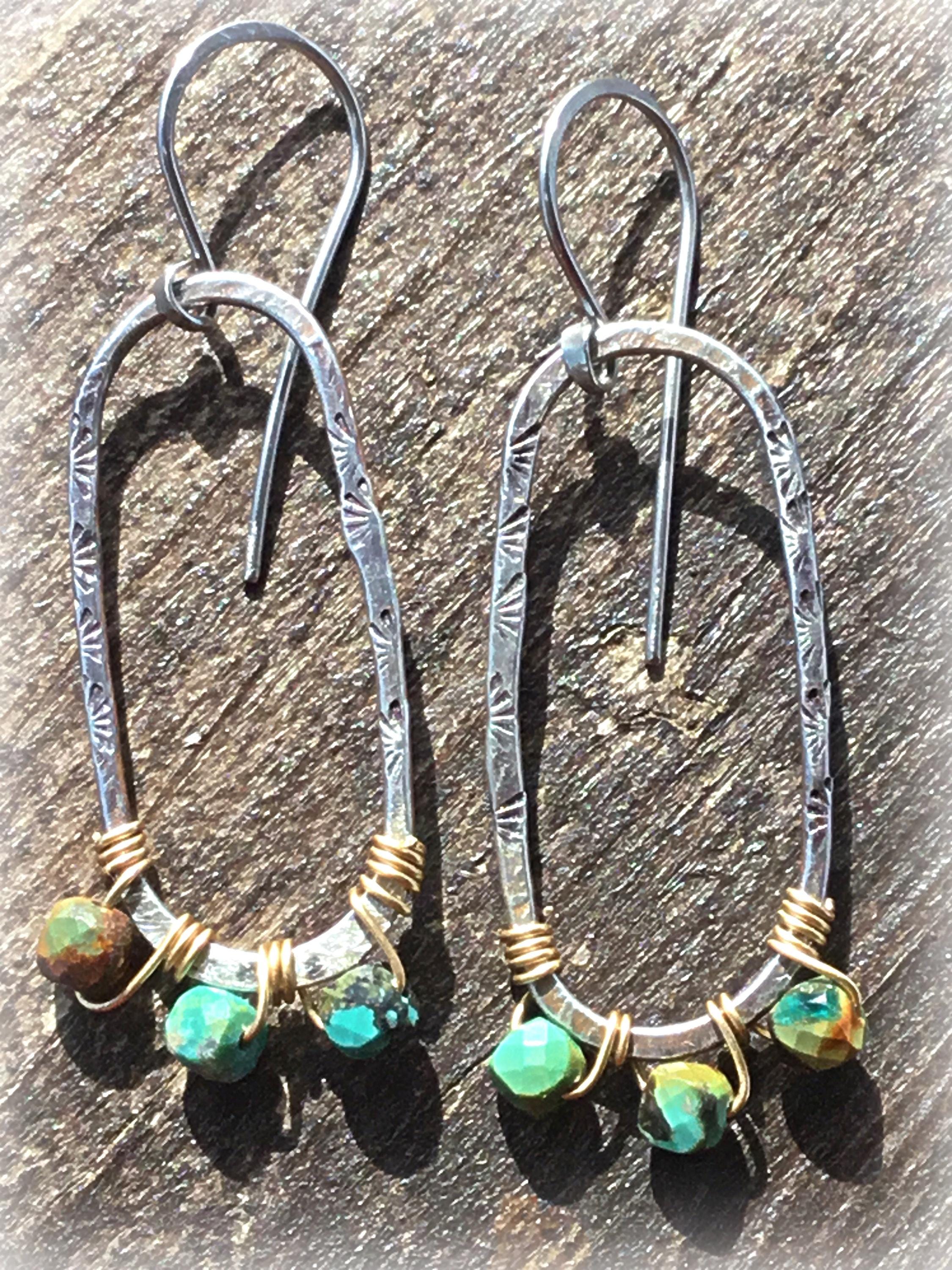 Sterling hammered oval hoops with bronze wire wrapped turquoise by Weathered Soul Jewelry. Earrings are about 1.5” long. Light as a feather,hardly know you have them on. The go to pair you can where with anything…anywhere!