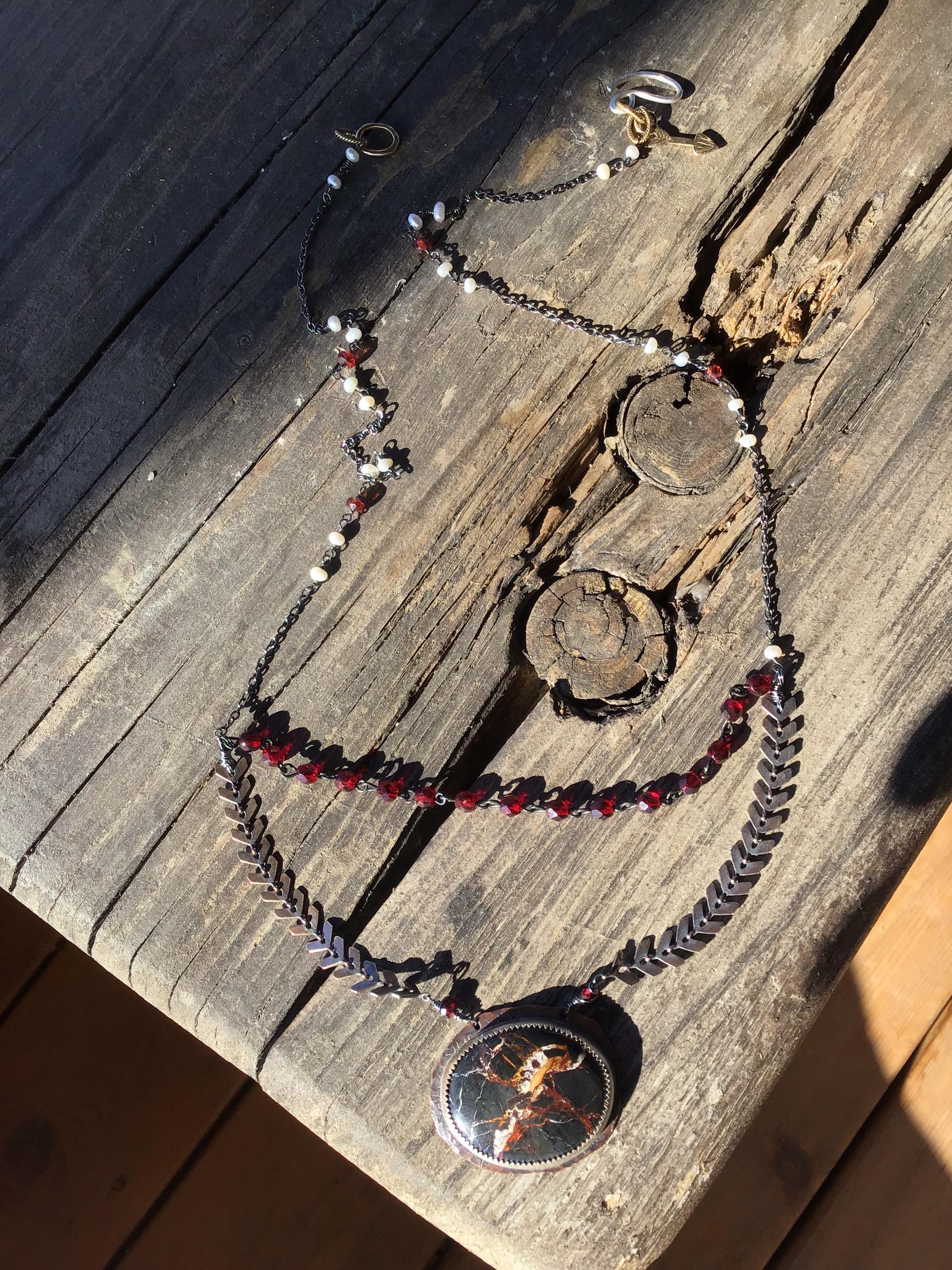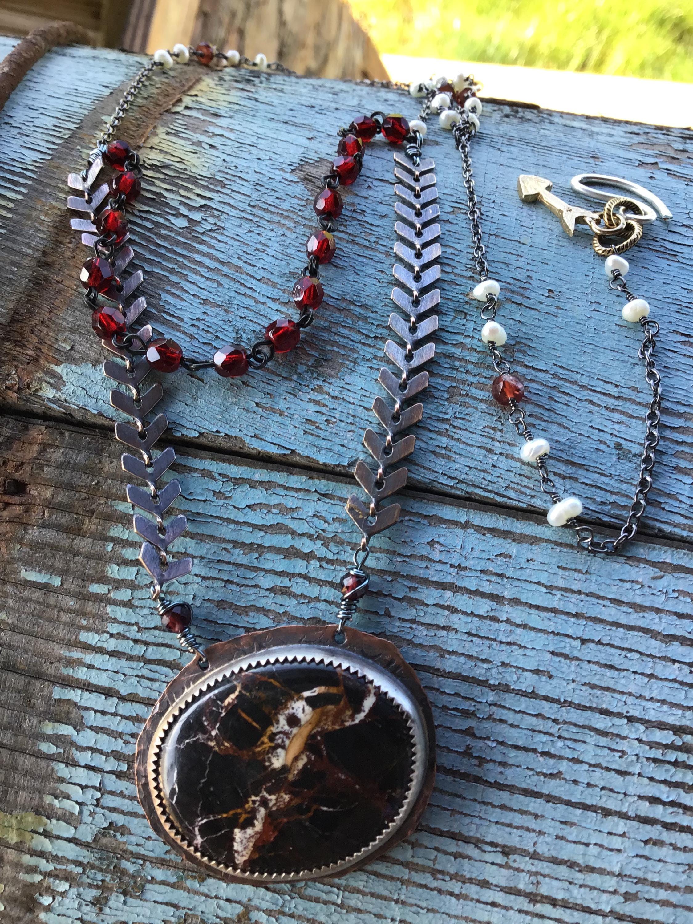 A little rough around the edges necklace by Weathered Soul jewelry. All of my work is rustic in nature! Just my particular style. Rare iron buffalo turquoise stone with veins of red, orange and cream. Approximately 24” long. Garnets and pearls adorn this beautiful piece with oxidized copper chevron chain and a little bronze arrow. Very classy and elegant. Nevada mined in the USA! This truly is a rare stone! Look it up and read about it. Very fascinating. It also has a drop of a vintage rosary style chain with glass beads.