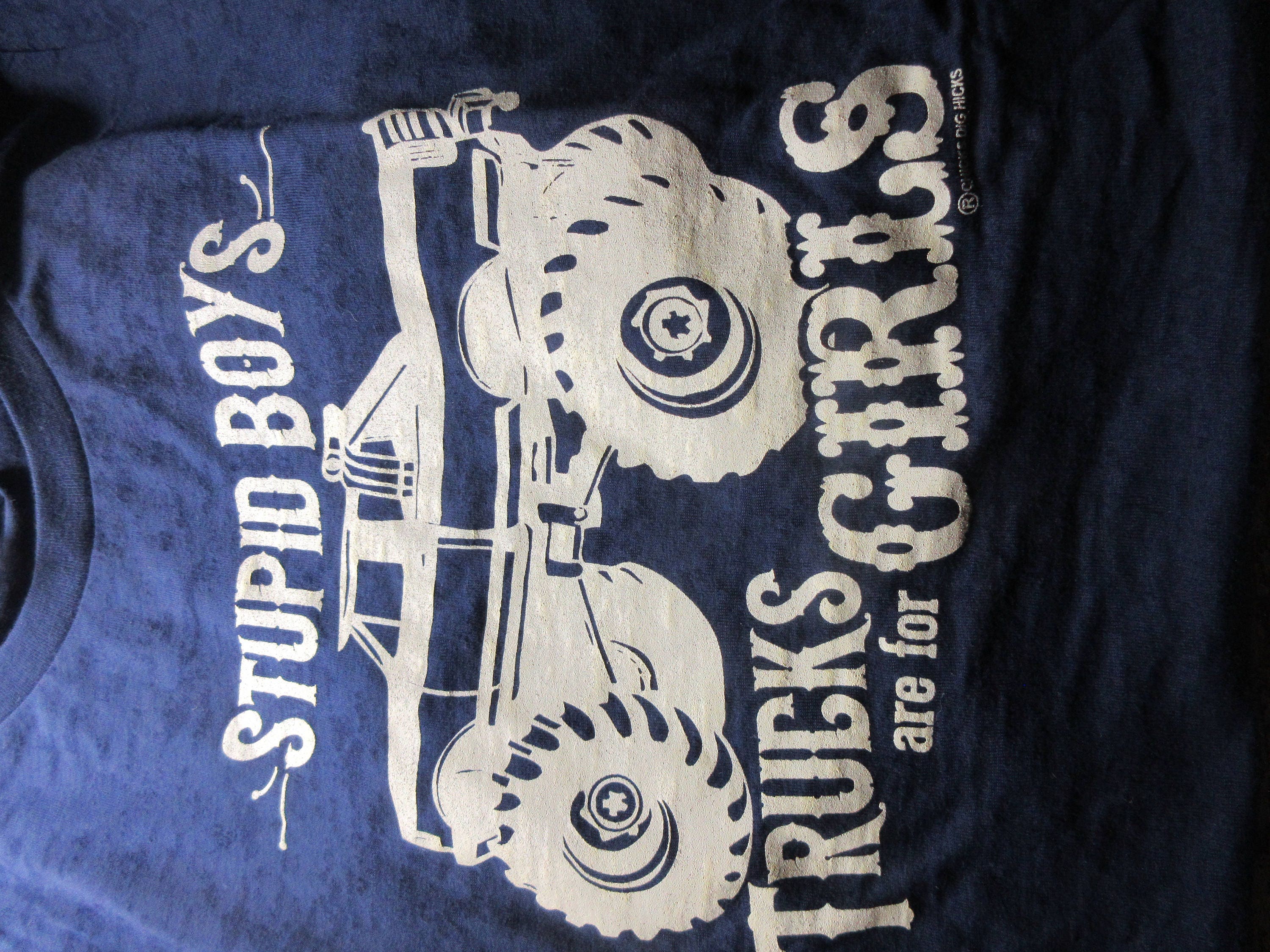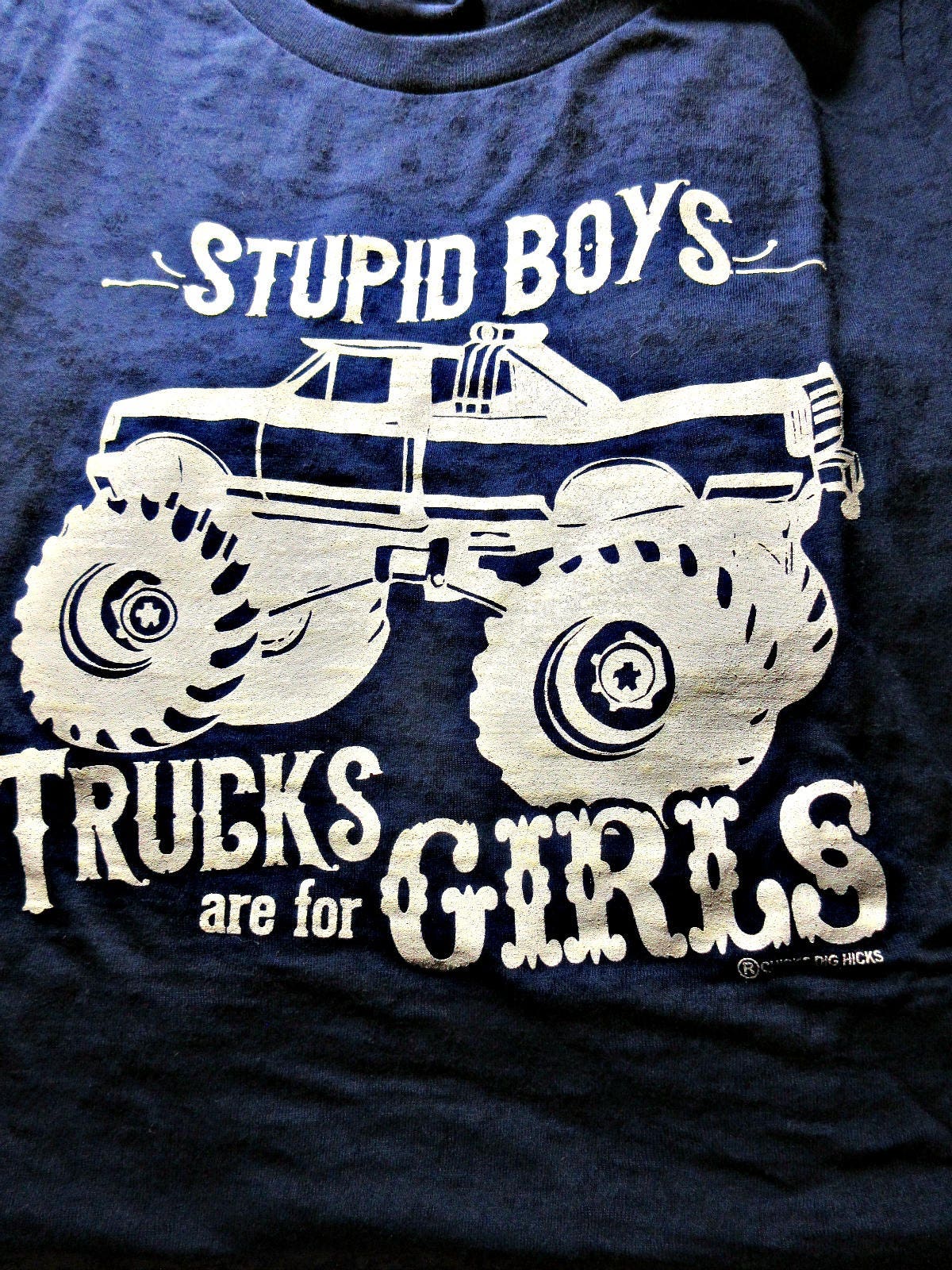 Sassy fun "Stupid boys trucks are for girls" burn out navy tee with ivory ink by Chicks Dig Hicks TM, super soft and stretchy quality fabric, distressed acid wash look. Only size large and X-large available. Run slimmer in sizing but very stretchy and soft. USA designed. Canvas or Alternative will be brand.