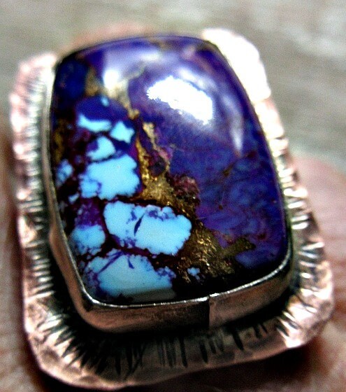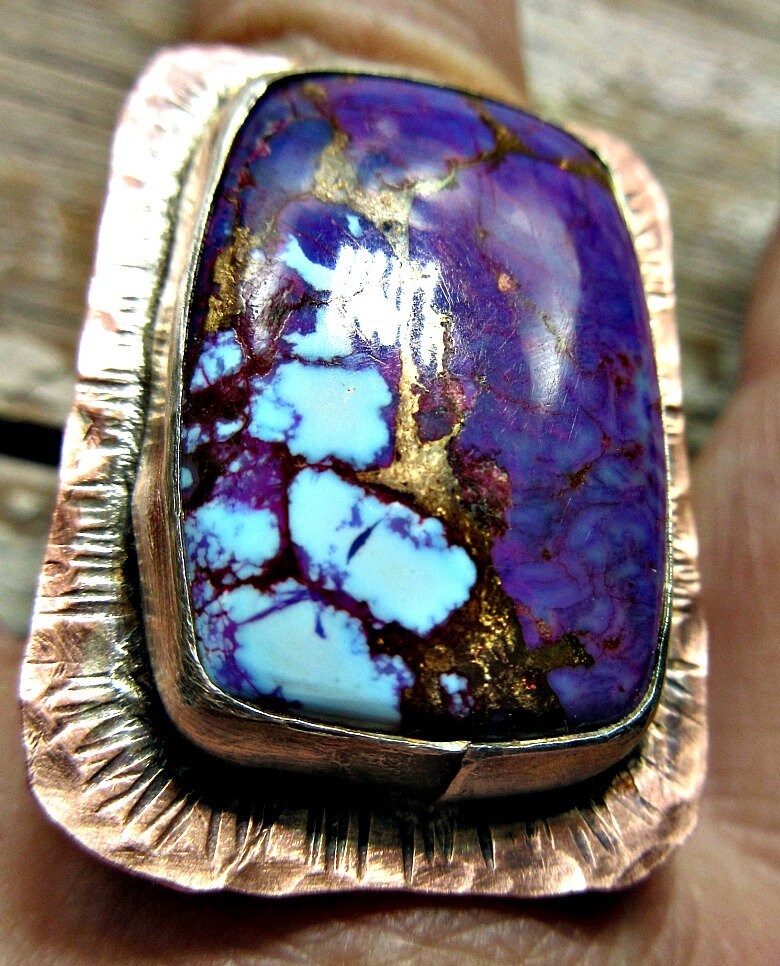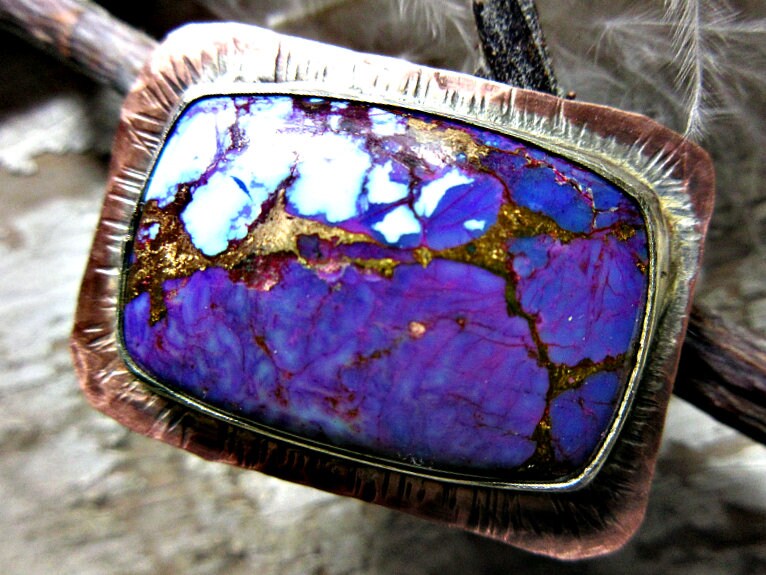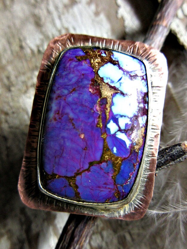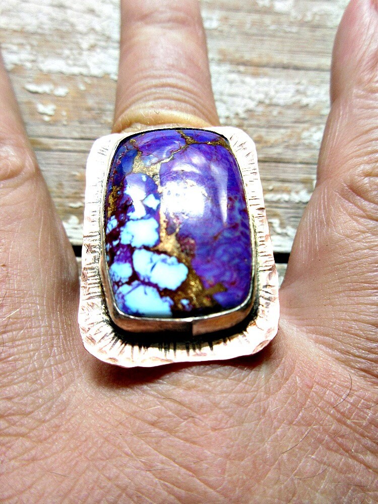 NOTE: Stones Vary! Each ring is hand crafted and can be sized to your size with a similar size and shaped stone. This is for a Custom Mohave Turquoise incredible OOAK stoned ring with purple, gold sparkles and brilliant turquoise, cowgirl, artisan, amazing, Weathered Soul, USA artisan crafted. Wide sterling silver band with arrows and feathers embossed. I don't think I could ever find a stone more beautiful than this one!! This is bezel set in sterling on textured copper. Approx. 1 1/2" long by 1" wide. Dimensions are approximate. Convo me with any questions.