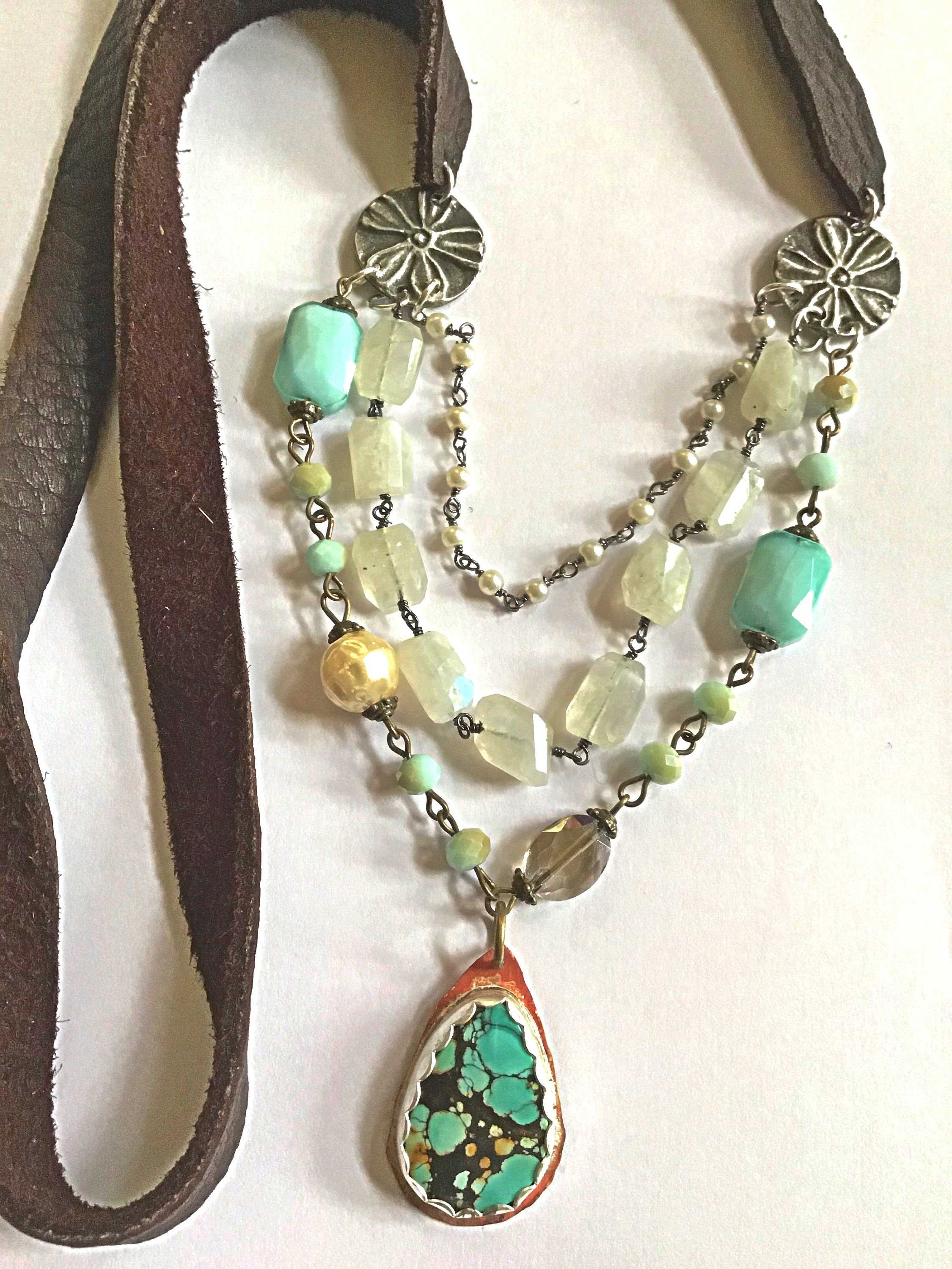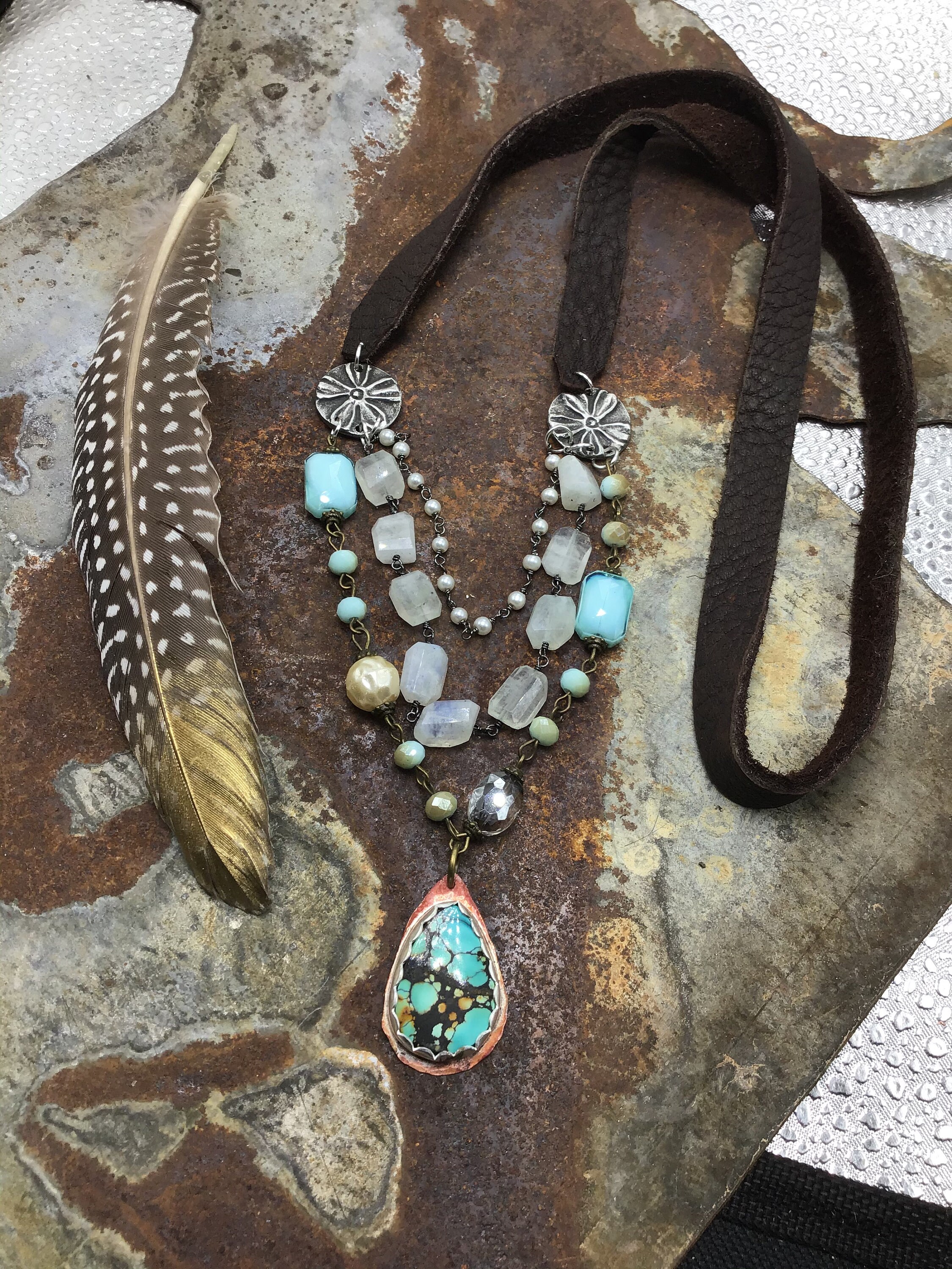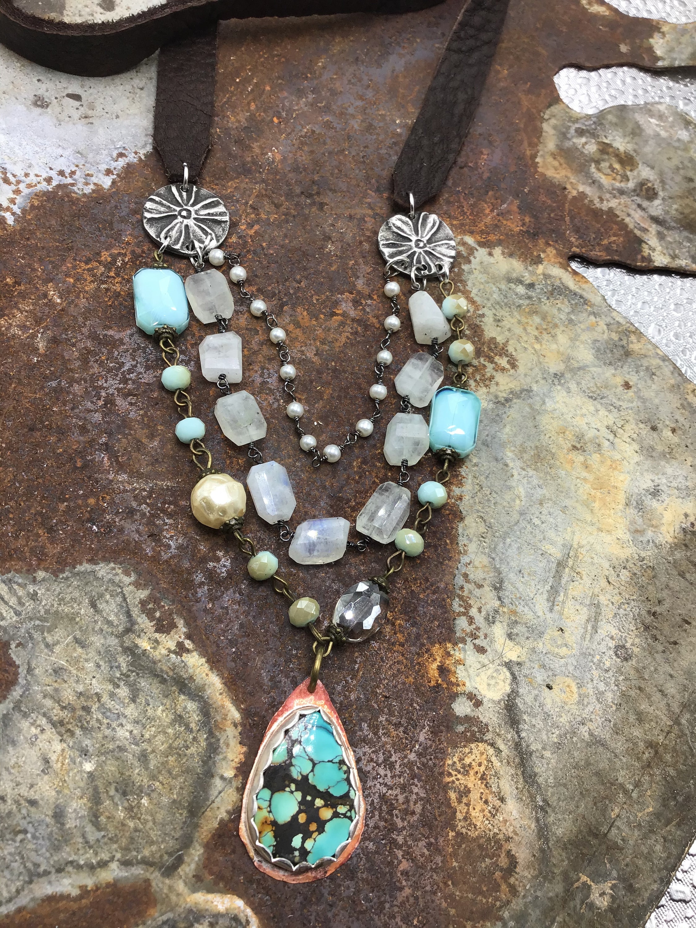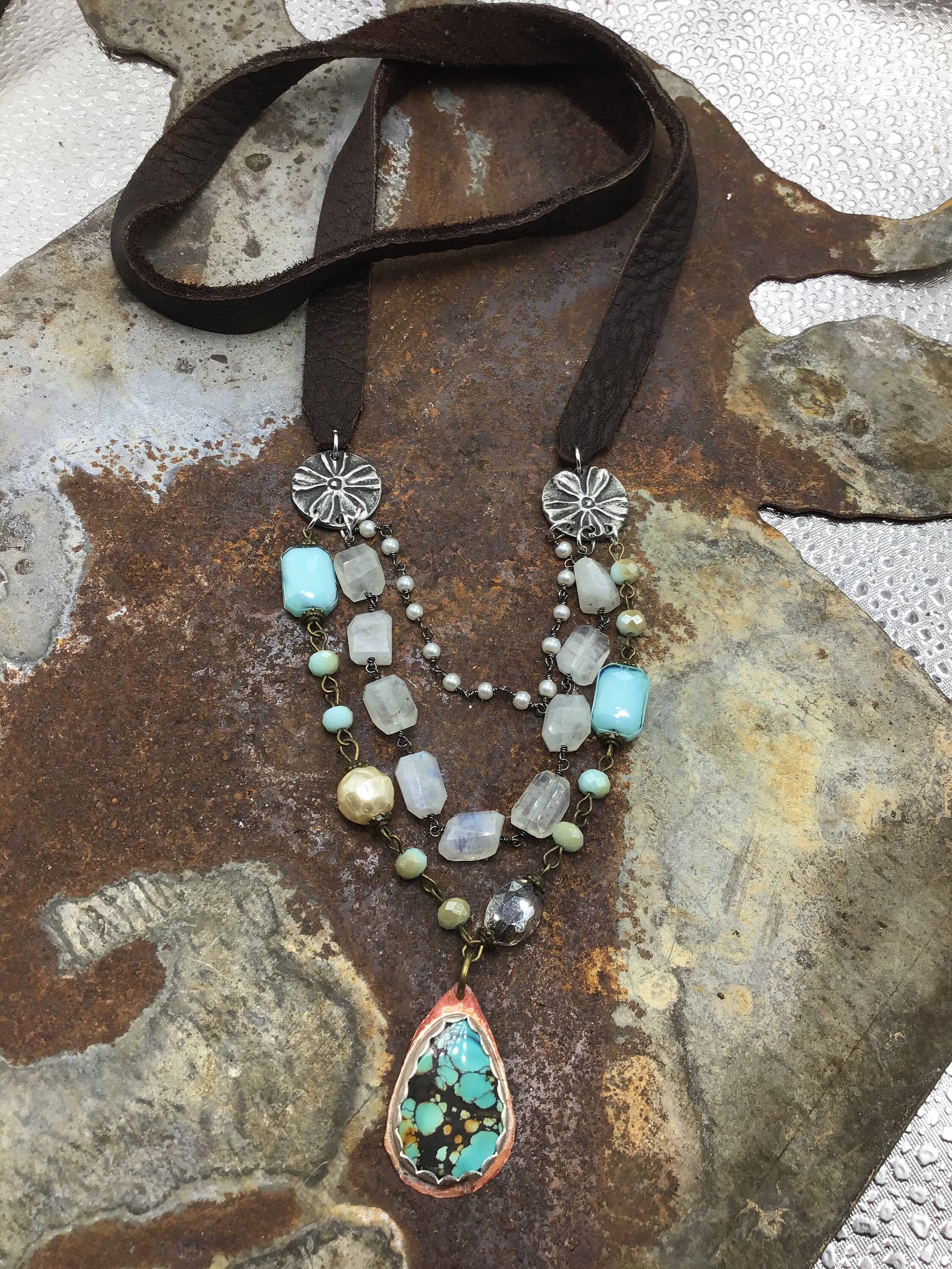 Gorgeous layered Sundance style necklace by Weathered Soul, pearls, moonstone, vintage revival chain attached to elk leather, cowgirl chic